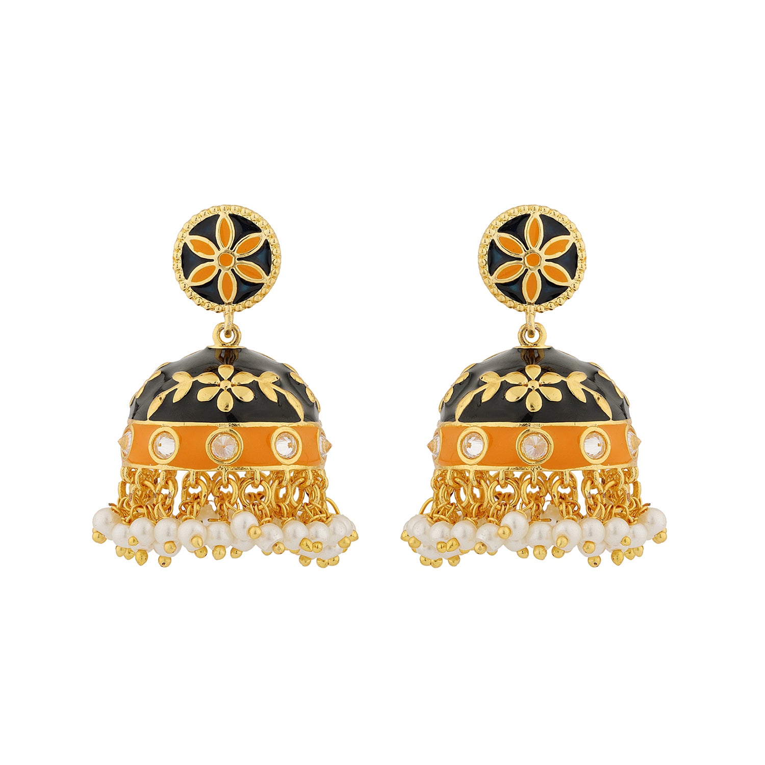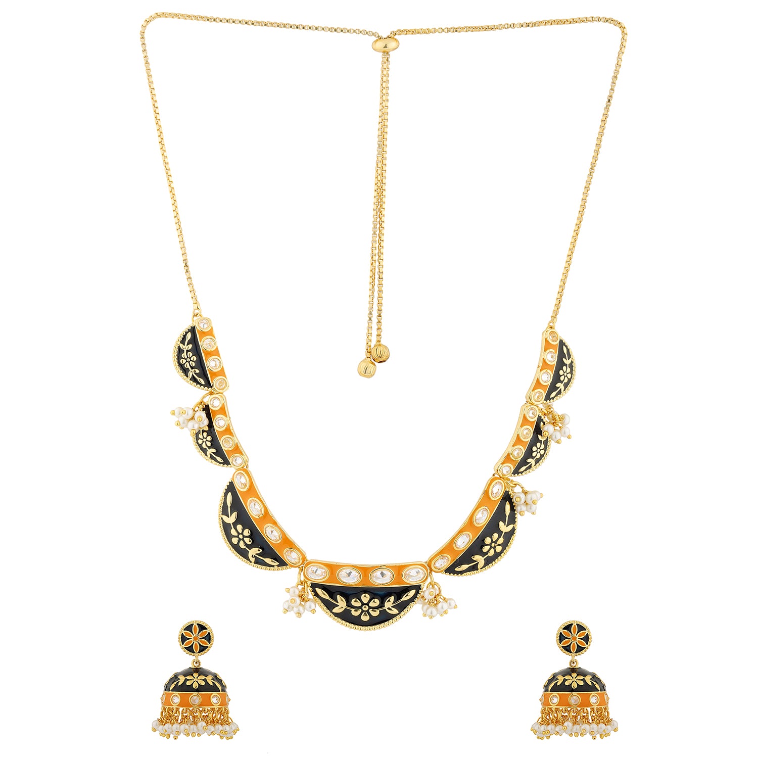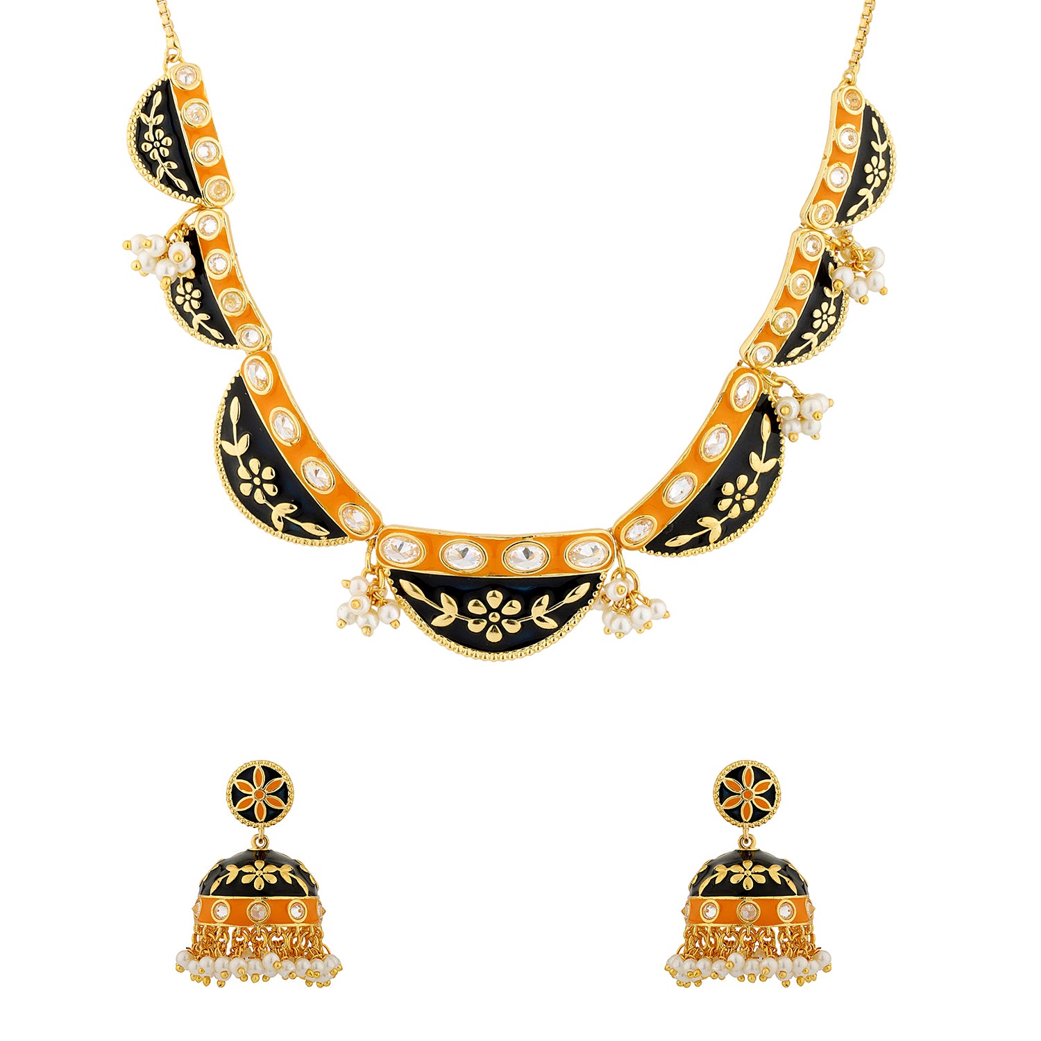 Step into the grandeur of Rajasthan with the Gota Patti Jaipuri Shringar Necklace Set, an exquisite ensemble that pairs a statement necklace with traditional jhumka earrings. Inspired by the artistry of Gota Patti embroidery, this ethnic enamel necklace set is reborn as timeless jewellery for weddings, poojas, and every festive celebration. Crafted in premium brass with gold plating, adorned with vibrant orange and black enamel, delicate floral motifs, sparkling reverse AD stones, and pearl clusters. Perfect for weddings, Karwa Chauth, Diwali, Navratri, and other celebrations, this wedding ethnic necklace set will effortlessly complement lehengas, sarees, and heavy festive suits. The bold color palette of orange, black, and gold stands out beautifully against both vibrant and pastel outfits, ensuring you shine as the showstopper of every occasion. More than just jewellery, this is a keepsake of heritage that makes for a thoughtful jewellery gift for women. Be it a gift for her, gift for girlfriend, wife, sister, or mother, this necklace set celebrates tradition while adding a chic, contemporary flair. With its unique design, versatile styling options, and cultural richness, the Gota Patti Jaipuri Shringar Necklace Set promises to be the crown jewel of your festive wardrobe.