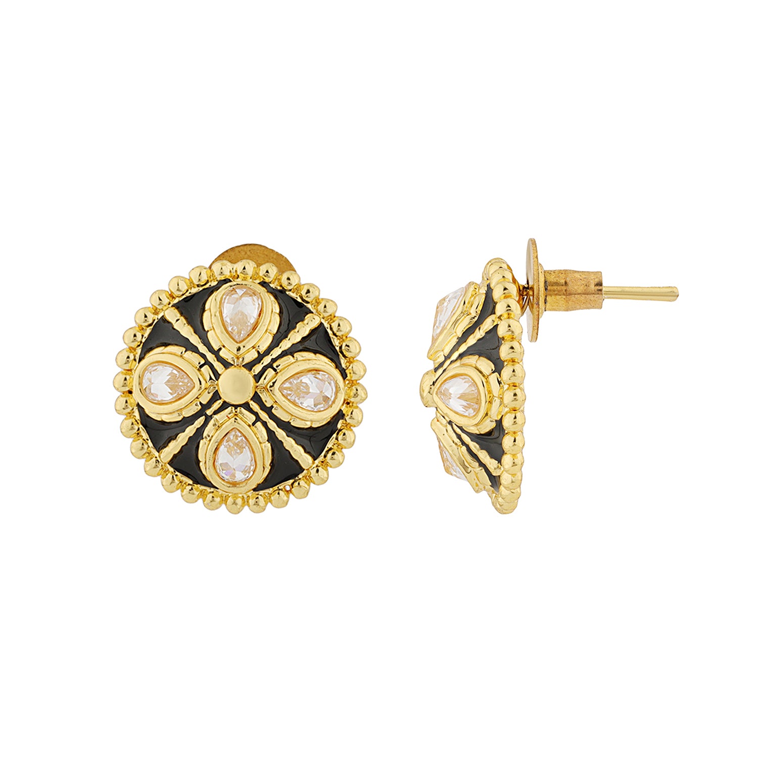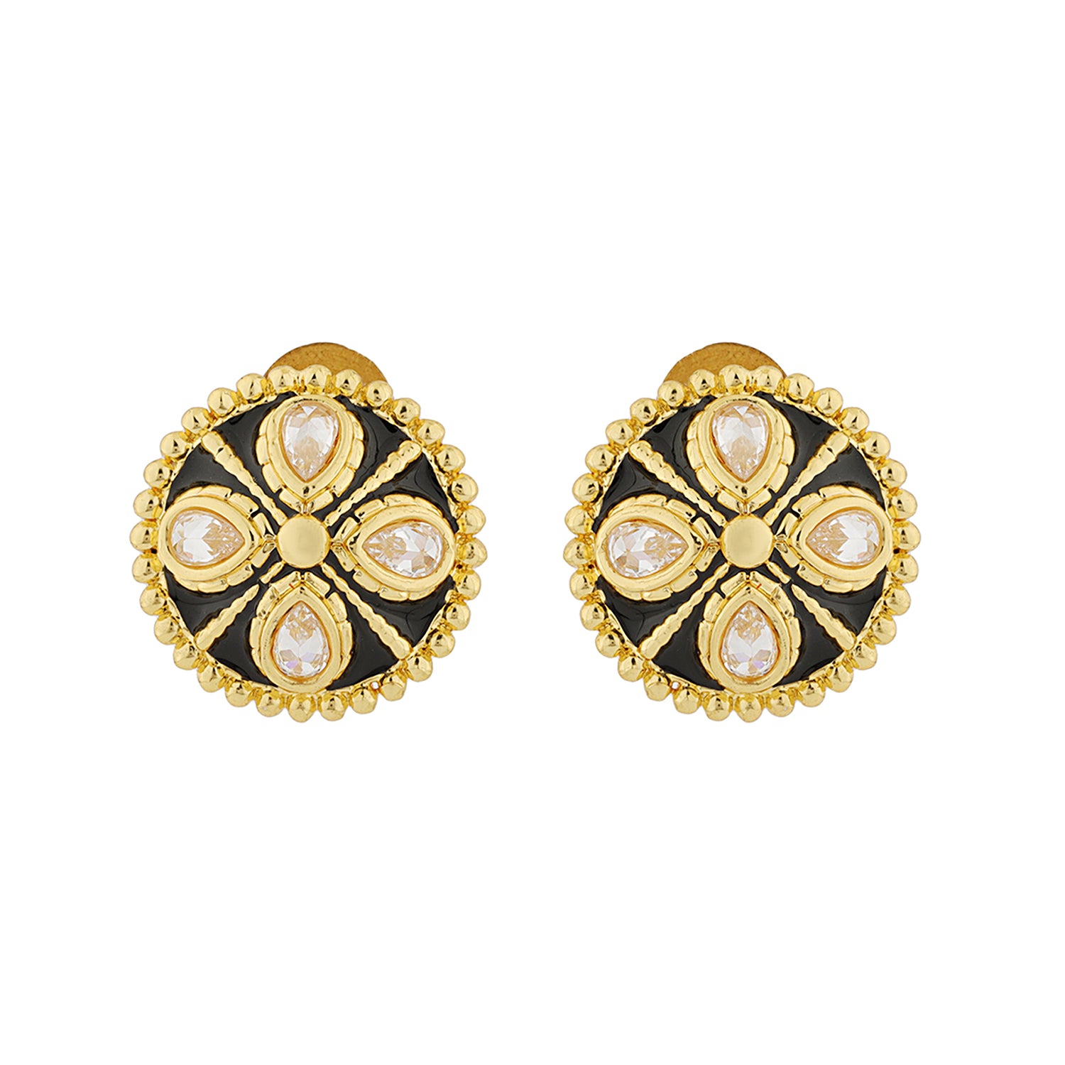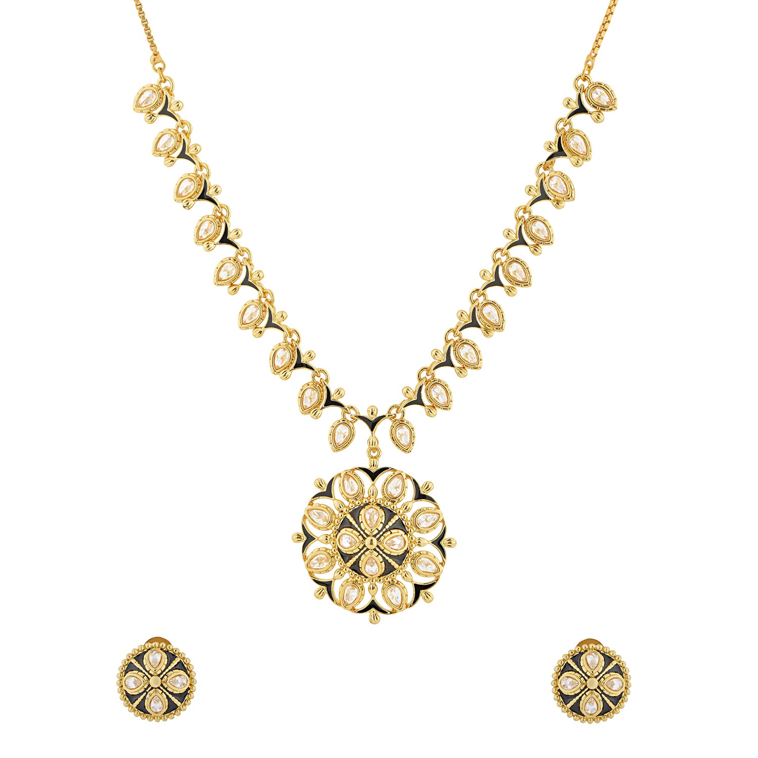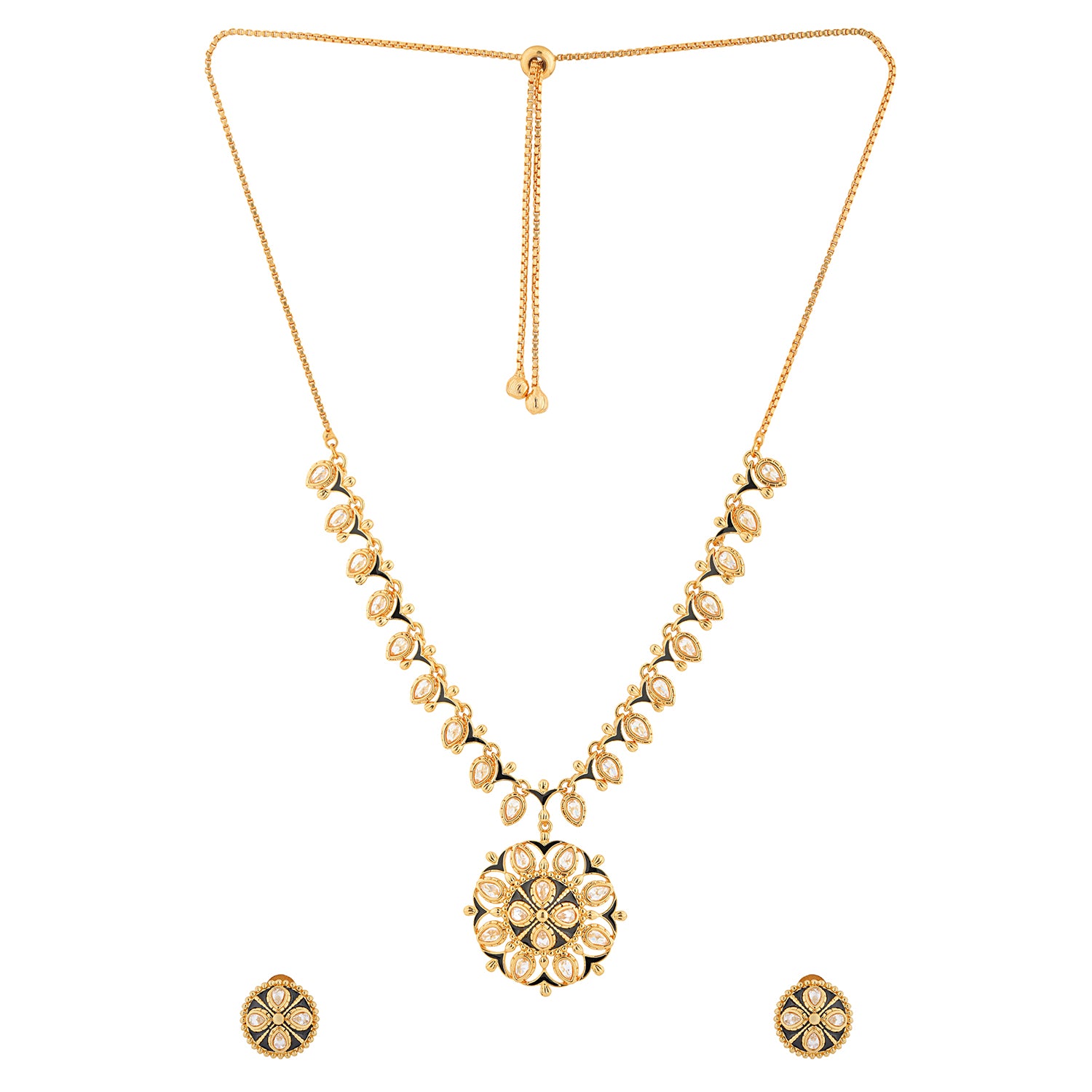 Elevate your festive style with the Gota Patti Mandala Haar Necklace Set, a design that blends the grace of traditional artistry with modern elegance. Crafted in premium brass, this stunning ethnic enamel necklace set takes inspiration from Rajasthan’s royal Gota Patti embroidery, reimagined into jewellery that feels timeless yet contemporary. The necklace features a striking circular mandala-inspired pendant, detailed with black enamel and surrounded by sparkling reverse AD stones. The linked motif chain, adorned with delicate teardrop-shaped embellishments, adds flow and richness, making this a true festive jewellery necklace set. Paired with matching earrings, it becomes a versatile piece perfect for weddings, poojas, and celebratory evenings. Whether styled with a silk saree, a velvet lehenga, or even a chic Indo-western gown, this festive statement necklace set ensures you stand out like royalty. It also makes a wonderful jewellery gift for women, whether for your sister, mother, or as a thoughtful gift for girlfriend.