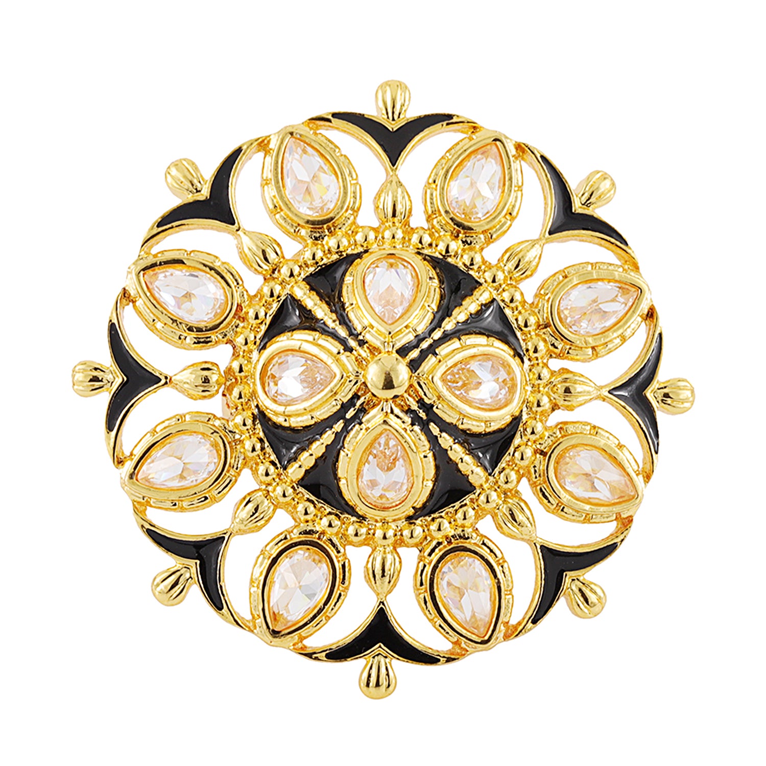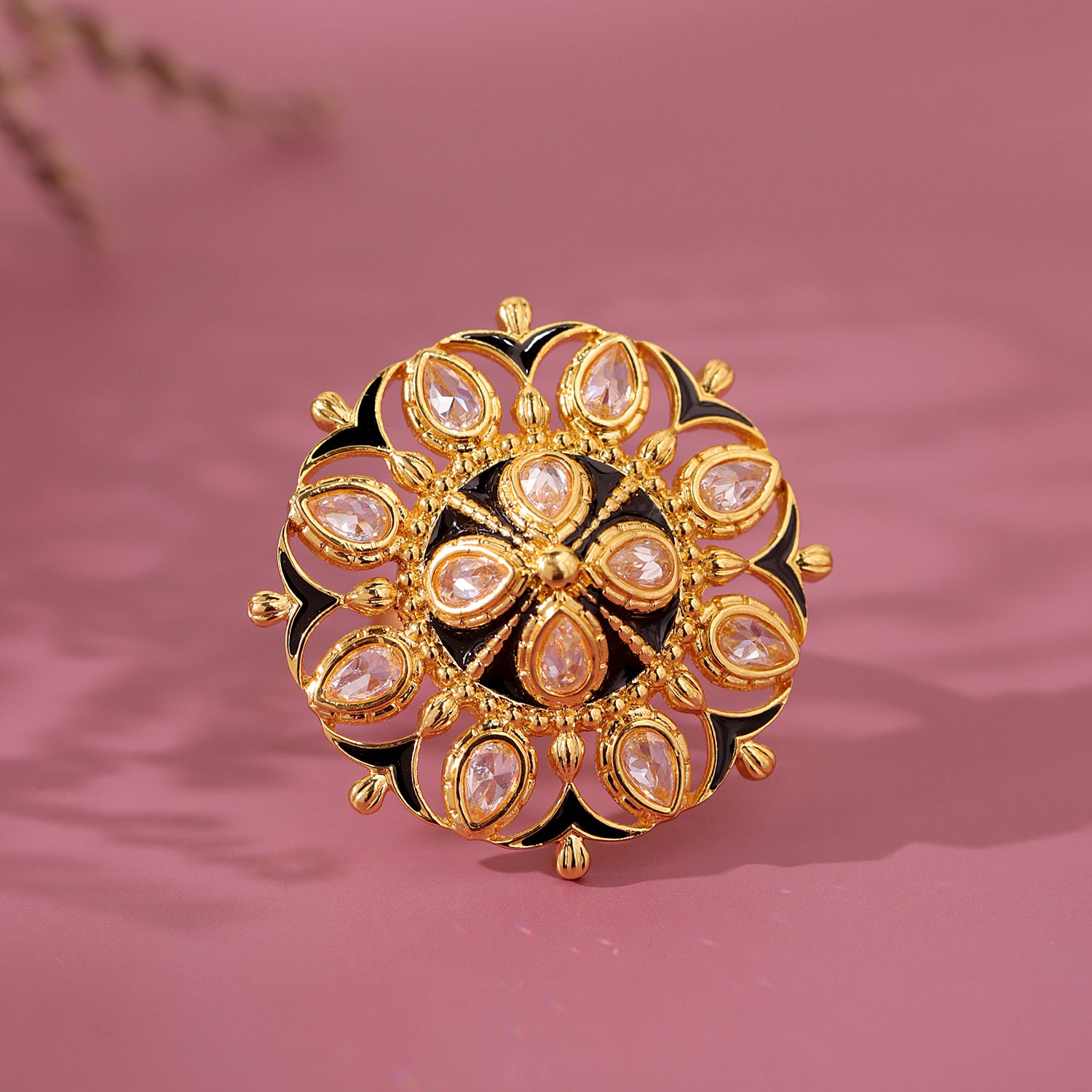 The Gota Patti Mandala Pushp Ring is a masterpiece that blends traditional artistry with modern elegance. Crafted in durable brass, this ethnic enamel ring takes inspiration from the intricate mandalas and floral patterns that decorated Rajasthan’s royal courts. The black enamel backdrop creates a striking canvas for the golden floral detailing, while sparkling reverse AD stones radiate outward like petals, forming a mesmerizing mandala design. This statement ring is more than just jewellery, it is a symbol of heritage and beauty, designed to make you feel regal at every occasion. Whether you wear it with a lehenga for a wedding, an Anarkali for festive gatherings, or a simple kurta for pujas, this festive jewellery ring becomes the center of attention. It’s versatile enough to be styled for weddings, festive events, or even as a chic ethnic accent for Indo-western outfits. Elegant, eye-catching, and timeless, the Mandala Pushp Ring also makes a thoughtful gift for her, a perfect jewellery gift for women who love tradition with a touch of sophistication. From brides to bridesmaids, from festive wear to pooja attire, this gold ring shines with unmatched ethnic grace.
