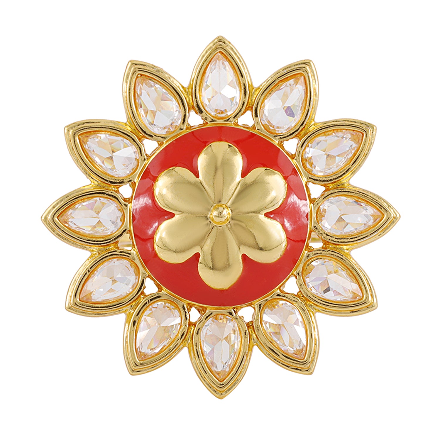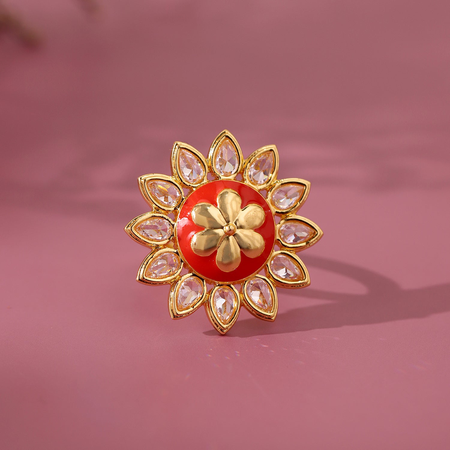 The Gota Patti Rang Mahal Ring is a true celebration of royal elegance, crafted to transport you straight into the grandeur of Rajasthan’s palatial courts. This ethnic enamel ring is inspired by the architectural beauty and floral artistry of Rajwada havelis and mahals, where every corner was adorned with intricate motifs and rich colors. The centerpiece of the ring features a striking red enamel base that symbolizes prosperity and festivity, crowned with a golden floral motif at the heart. Surrounding it is a radiant halo of sparkling reverse AD stones in a petal-shaped design, resembling the sunburst chandeliers of a palace hall. Whether you are attending a wedding, celebrating a festive puja, or dressing for a family gathering, this festive jewellery ring instantly elevates your look and adds a regal glow. The timeless combination of red enamel and gold makes it a versatile statement ring, perfectly blending with lehengas, Banarasi sarees, Anarkali suits, and even Indo-fusion wear. This ring also makes for an exceptional gift for her,for your sister, mother, or girlfriend because it carries with it the richness of culture and the thoughtfulness of style.