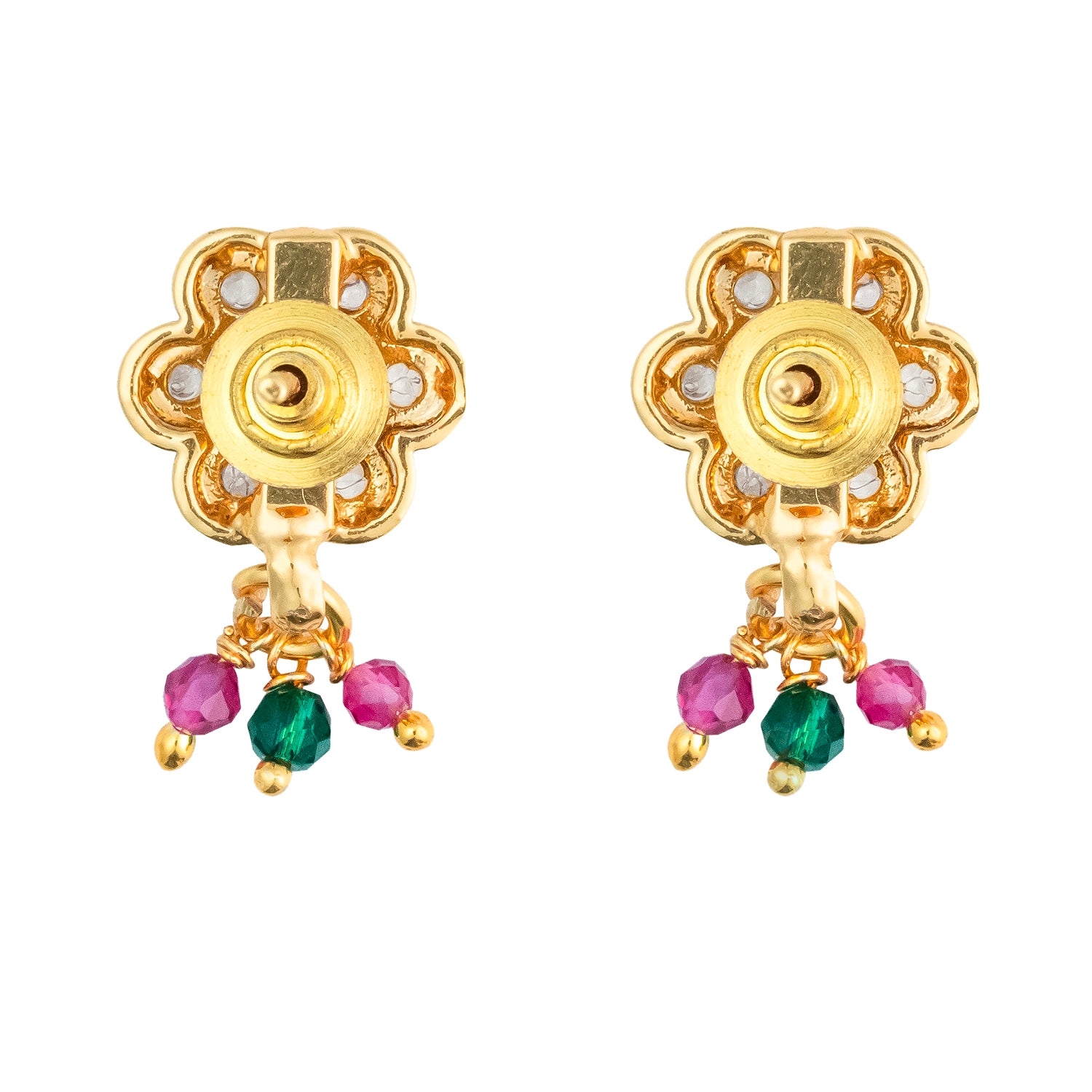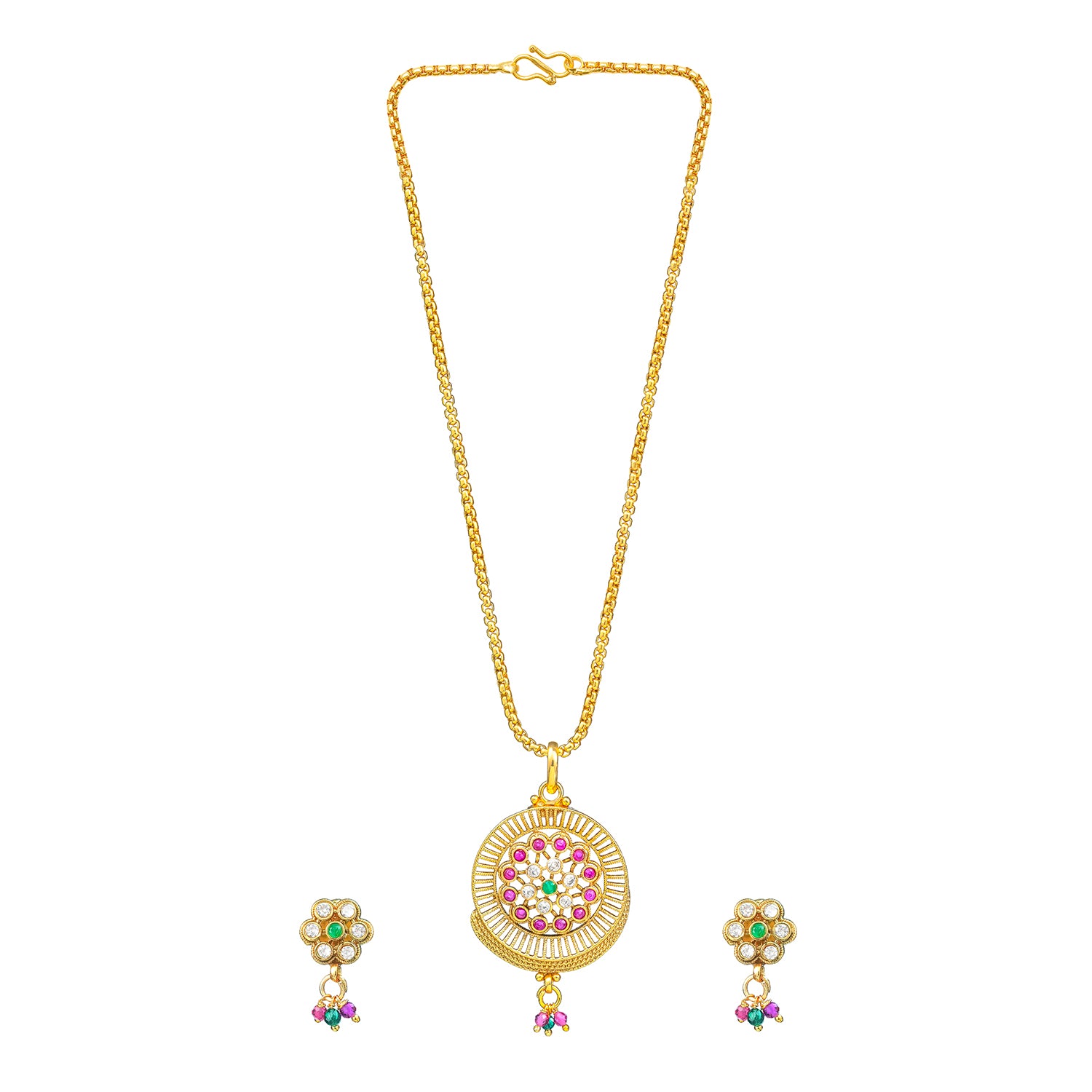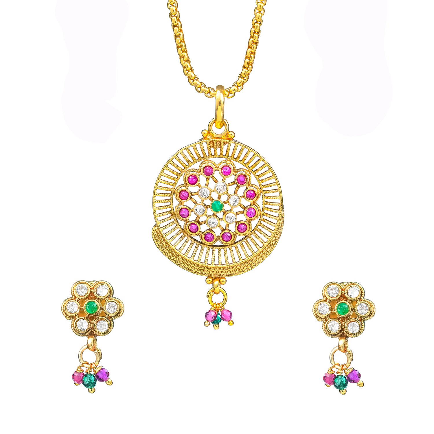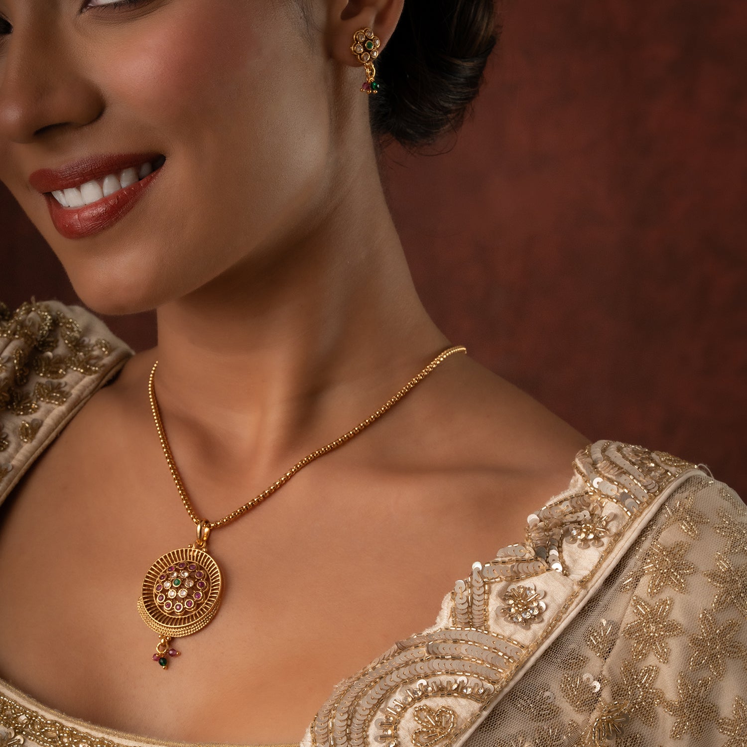 Elevate your everyday and festive styling with this graceful Gold Elegance Pendant Set, designed to blend traditional Indian artistry with modern simplicity. Crafted from premium Alloy and finished with radiant yellow-gold plating, this women pendant set features a round antique-style pendant adorned with green and ruby-toned stones, paired with matching floral earrings embellished with delicate bead drops. The lightweight design makes it perfect for daily wear, office outfits, casual ethnic looks, and small festive gatherings, while its intricate detailing adds a touch of cultural charm suitable for pooja, temple visits, and traditional celebrations. Whether worn with kurtis, sarees, Indo-western attire, or simple salwar sets, this elegant pendant set enhances your look with timeless beauty. A thoughtful and stylish gift for women, including your wife, lover, mother, sister, or friend for any special occasion.
