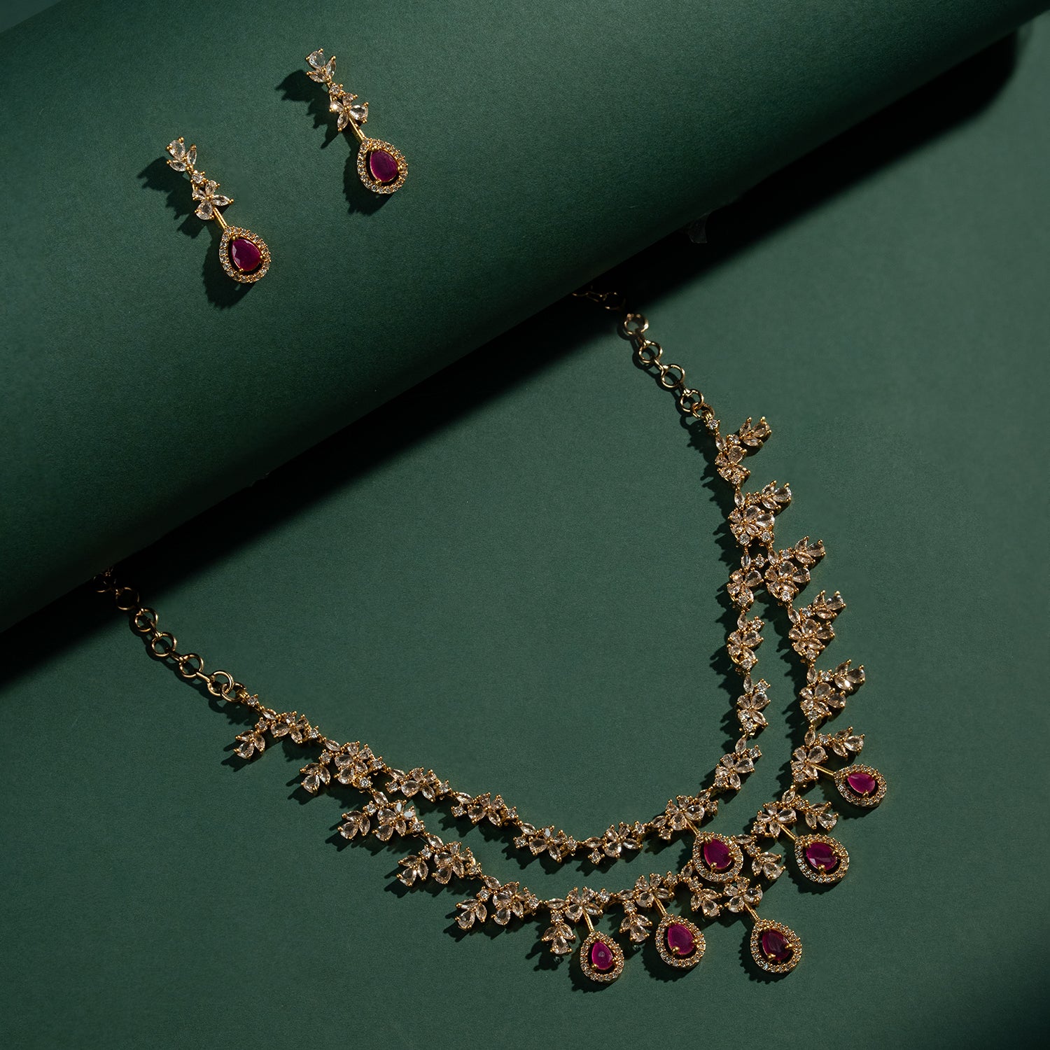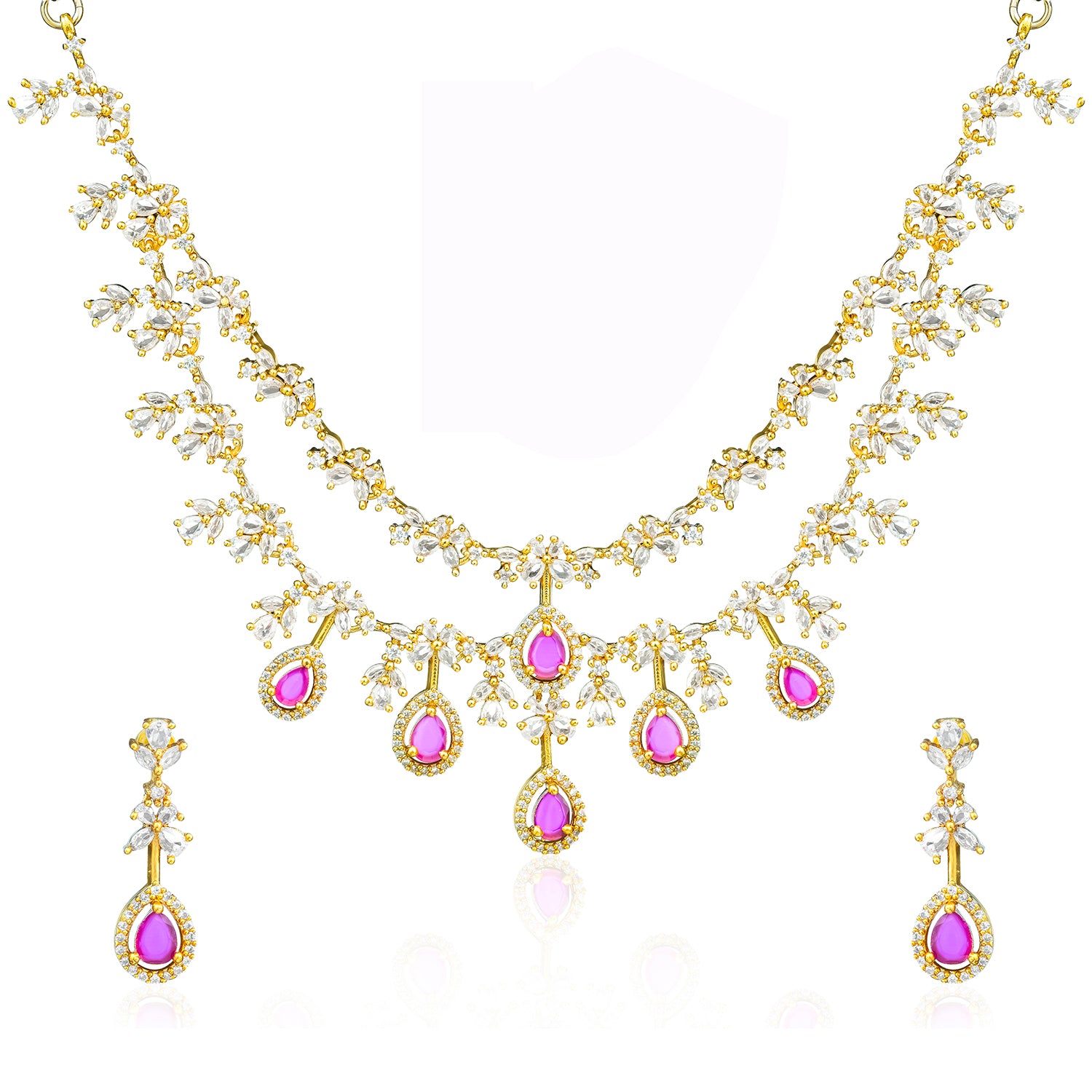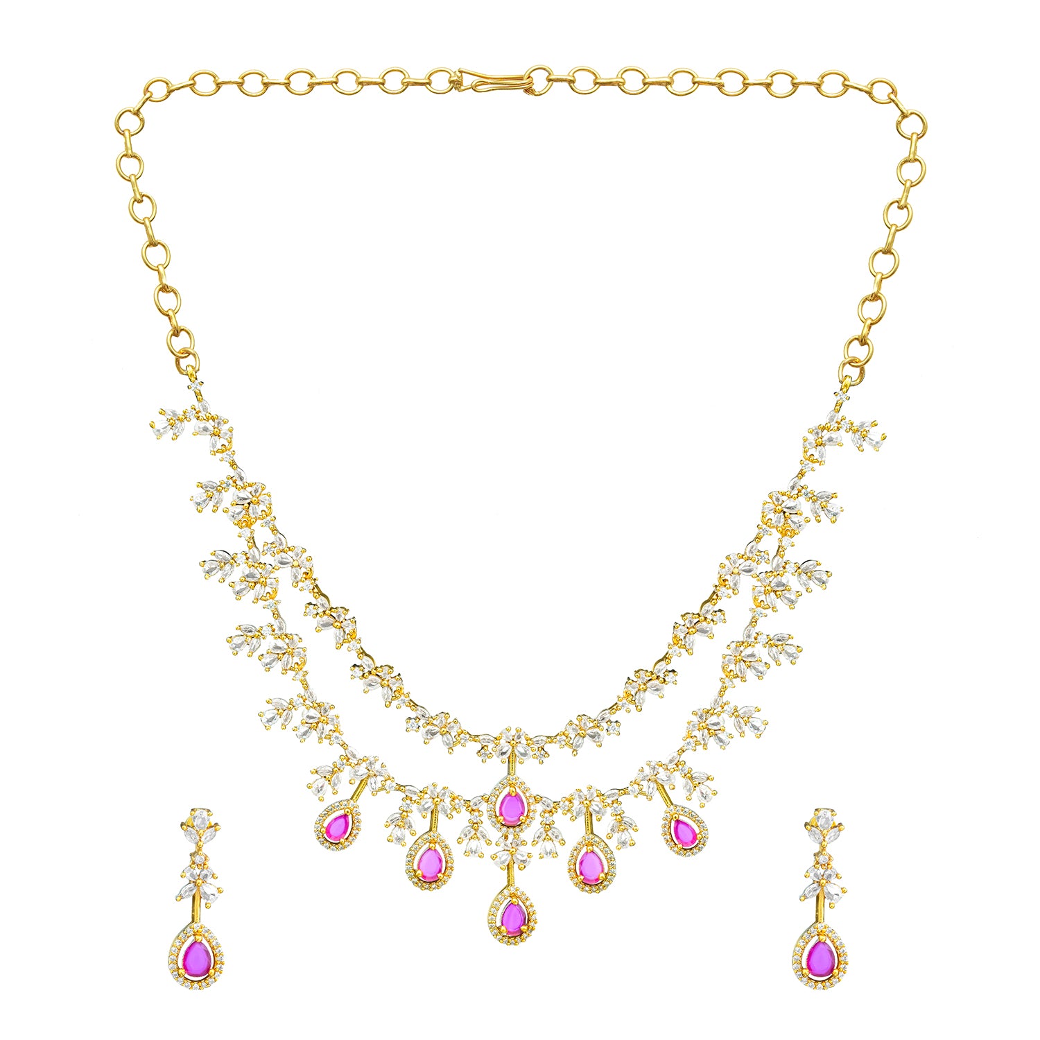 The Gold Elegance Madhurima Ruby Drop Necklace Set is a beautifully crafted blend of traditional charm and modern refinement. Part of the exclusive Gold Elegance Collection, this women necklace set features delicate floral motifs adorned with shimmering CZ American Diamonds and deep ruby-toned drops that create a soft, luxurious sparkle. The layered floral detailing gives the necklace a graceful drape along the neckline, while the matching earrings complete the look with effortless elegance. Made from premium brass and finished with radiant yellow gold plating, this traditional necklace set offers long-lasting shine, intricate craftsmanship, and lightweight comfort, perfect for weddings, festive occasions, pooja ceremonies, and temple visits. Its versatile color palette pairs beautifully with silk sarees, lehengas, Anarkalis, and South Indian festive outfits, making it an ideal accessory for brides, bridesmaids, and wedding guests. Thoughtful and timeless, this set also makes a meaningful gift for women, whether for your lover, wife, mother, sister, or a dear friend. With simple care, it remains a radiant and cherished part of any ethnic jewellery collection.
