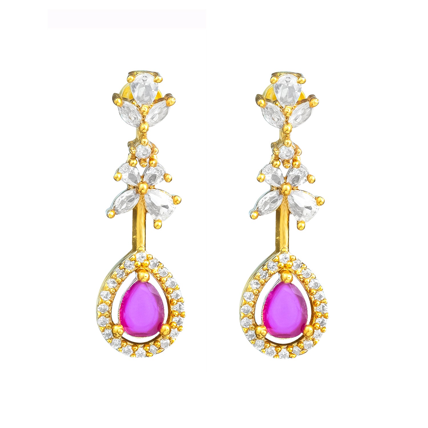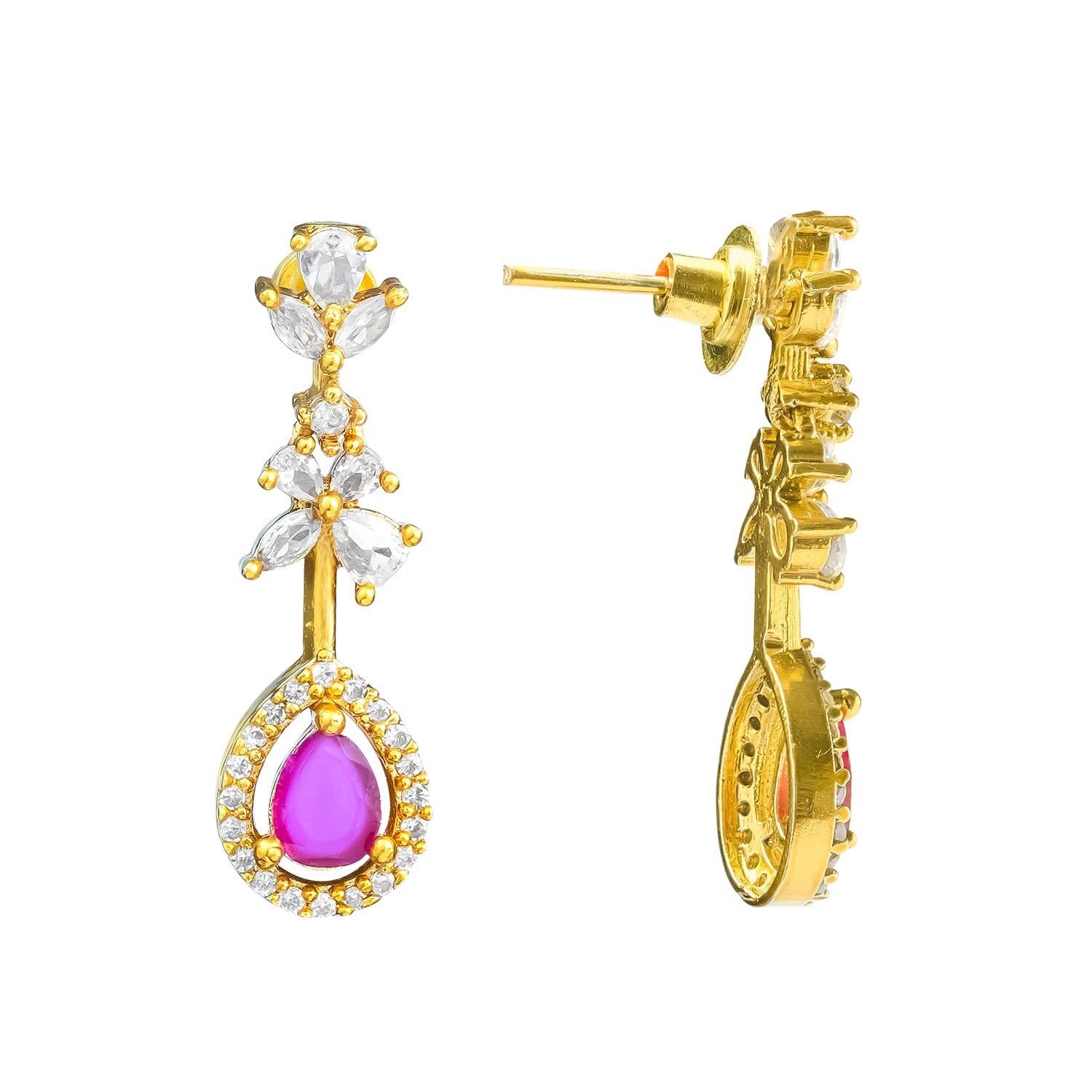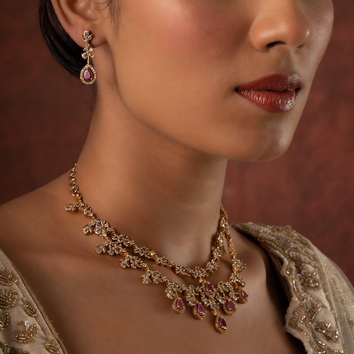 The Gold Elegance Madhurima Ruby Drop Necklace Set is a beautifully crafted blend of traditional charm and modern refinement. Part of the exclusive Gold Elegance Collection, this women necklace set features delicate floral motifs adorned with shimmering CZ American Diamonds and deep ruby-toned drops that create a soft, luxurious sparkle. The layered floral detailing gives the necklace a graceful drape along the neckline, while the matching earrings complete the look with effortless elegance. Made from premium brass and finished with radiant yellow gold plating, this traditional necklace set offers long-lasting shine, intricate craftsmanship, and lightweight comfort, perfect for weddings, festive occasions, pooja ceremonies, and temple visits. Its versatile color palette pairs beautifully with silk sarees, lehengas, Anarkalis, and South Indian festive outfits, making it an ideal accessory for brides, bridesmaids, and wedding guests. Thoughtful and timeless, this set also makes a meaningful gift for women, whether for your lover, wife, mother, sister, or a dear friend. With simple care, it remains a radiant and cherished part of any ethnic jewellery collection.