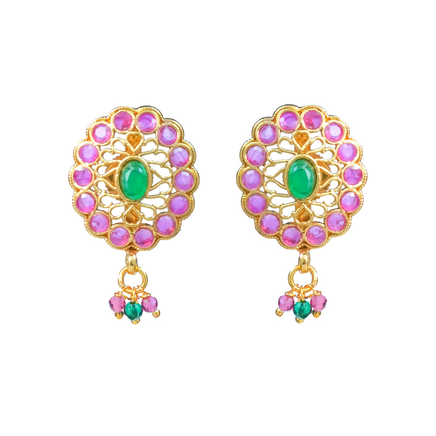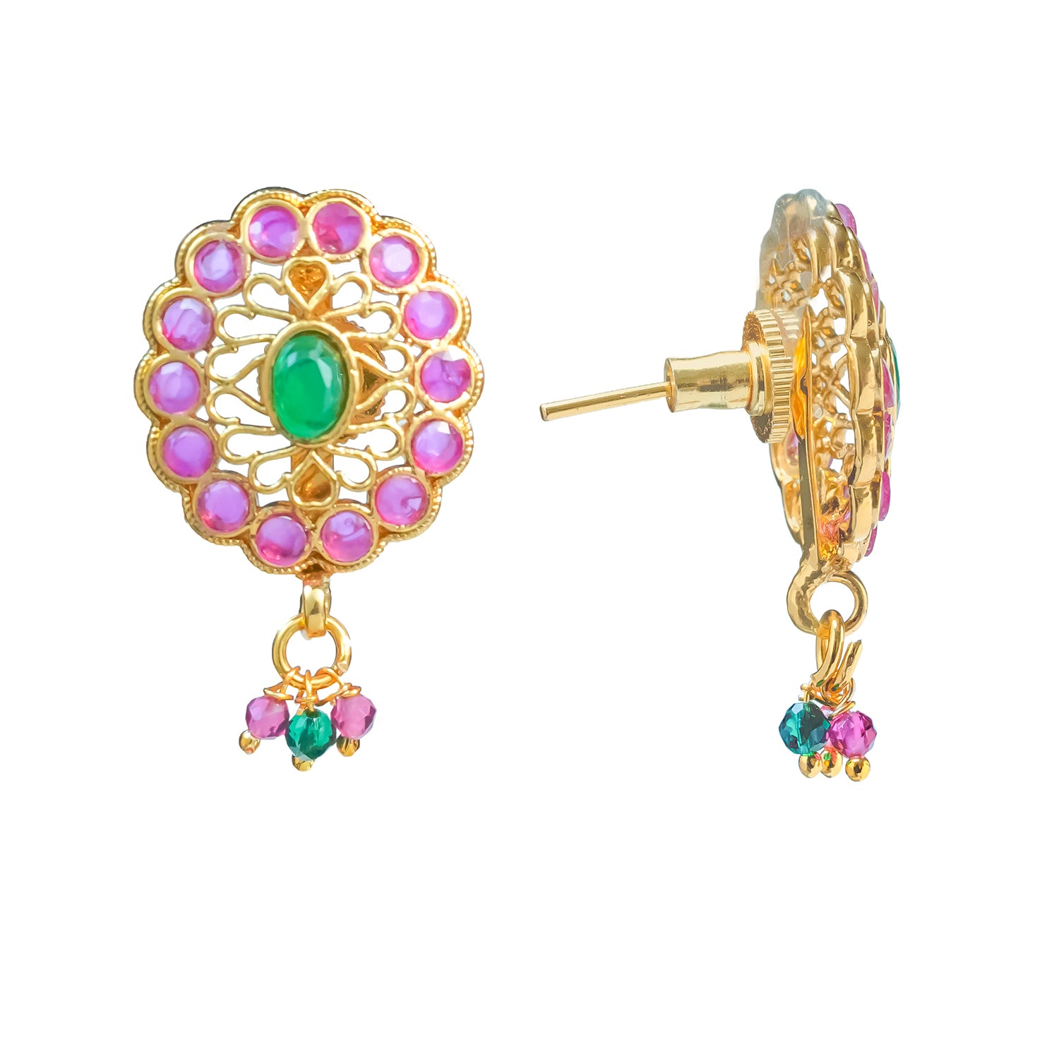Experience timeless Indian artistry with the Gold Elegance Pink Blossom Pendant Set, created to offer a beautiful blend of traditional charm and modern wearability. Crafted from high-quality Alloy and finished in radiant yellow-gold plating, this women pendant set features a delicately designed peacock-inspired oval pendant adorned with bright pink stones and a striking green center. Matching earrings complete the look with intricate floral motifs and dainty bead drops, making the set both graceful and eye-catching. Lightweight yet statement-worthy, this pendant set pairs effortlessly with sarees, kurtis, Indo-western outfits, and festive attire, perfect for pooja, temple visits, family gatherings, or daily traditional styling. A meaningful and elegant gift for women, including your lover, wife, mother, sister, or friend, this set is designed to offer beauty, versatility, and long-lasting shine.