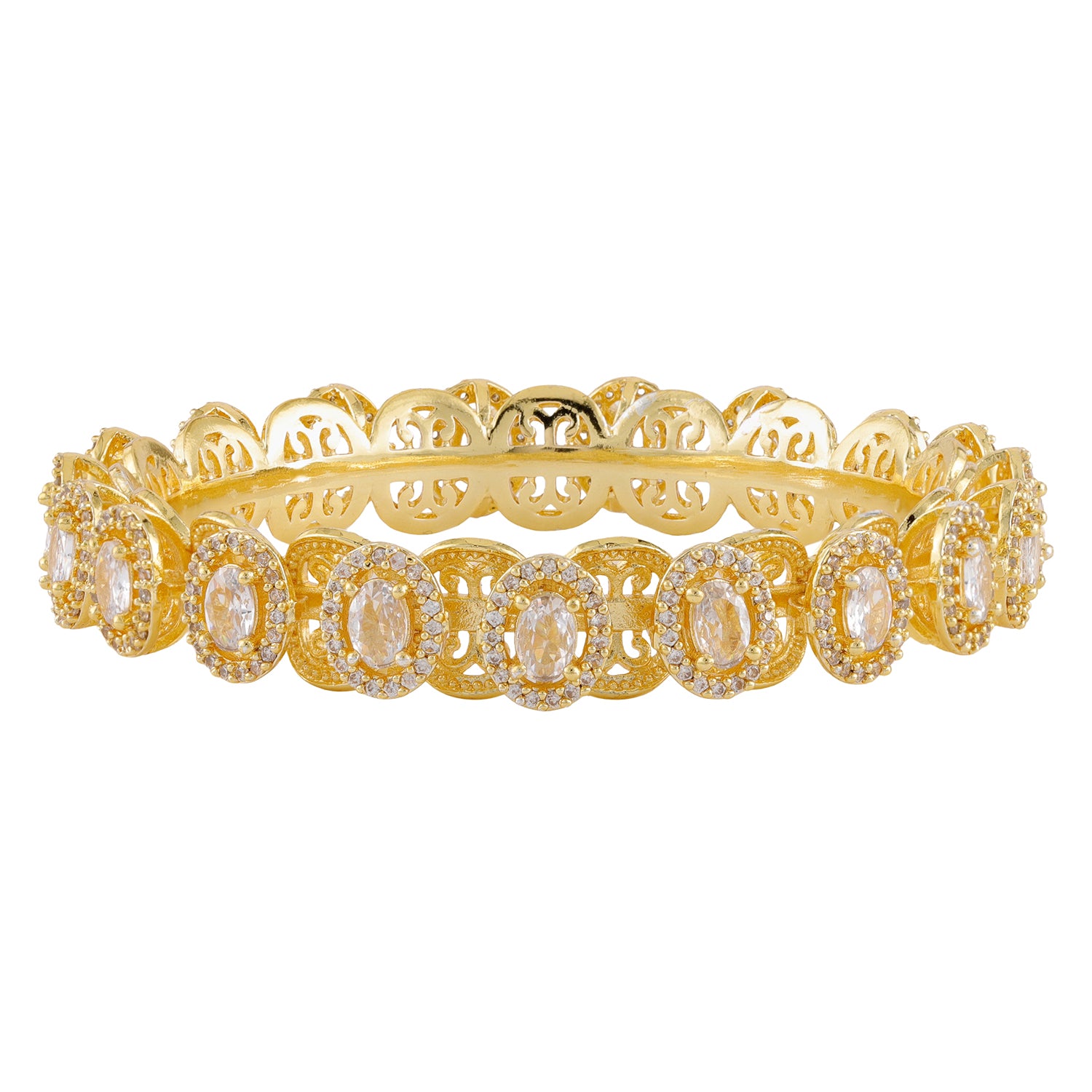 Introducing the Gold Elegance Rooh-E-Zarina Regal CZ Bangles, crafted to make every woman feel like royalty. These bangles blend timeless Indian artistry with a modern jewellery aesthetic, making them the perfect accessory for women who adore jewellery that feels luxurious yet wearable. Each bangle is made from high-quality brass and finished with a rich yellow-gold plating, giving it a glowing, premium finish that instantly elevates any outfit. The design features beautifully carved circular motifs adorned with sparkling American Diamond / CZ stones, placed in ornate settings that mirror traditional handcrafted jewellery. Their luminous shine captures light from every direction, giving the bangles a soft, romantic sparkle that complements both ethnic and contemporary looks. Whether worn solo as a statement piece or stacked with other bangles for a fuller festive vibe, these beauties fit effortlessly into every jewellery lover’s wardrobe. Perfect for weddings, parties, poojas, festive gatherings, or even elegant cocktail celebrations, this women bangles set brings charm, elegance and a touch of regal glamour to every moment. These bangles also make a thoughtful and meaningful gift for women, whether for a wife, lover, sister, mother or friend who appreciates jewellery that feels both sentimental and stylish.