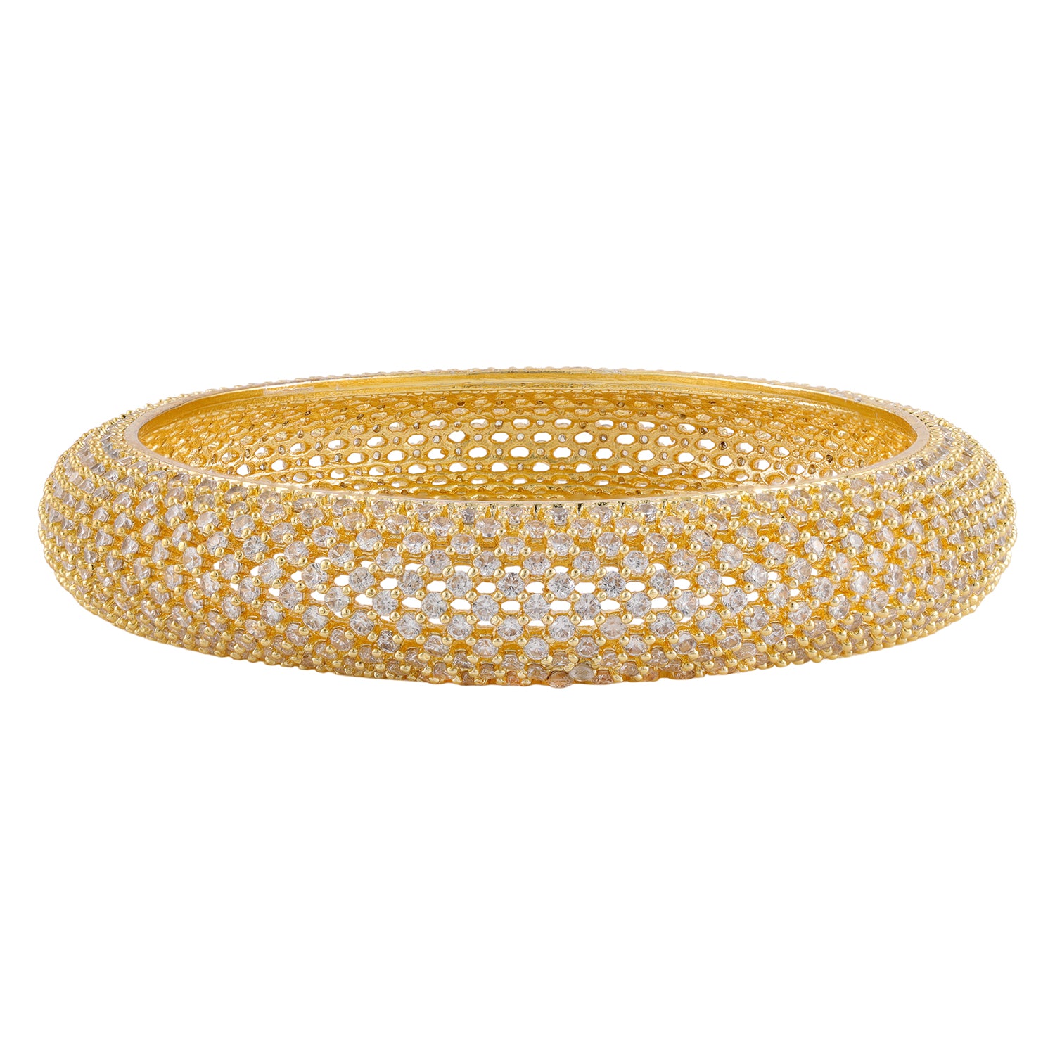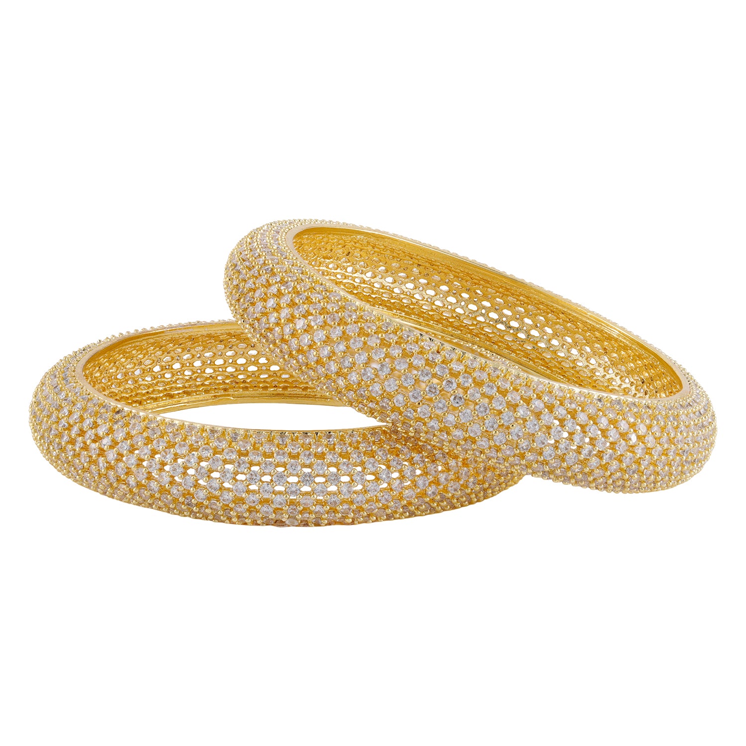 The Gold Elegance Sunehri Noor CZ Bangles are a celebration of timeless charm blended with modern sparkle. Designed for women who love jewellery that feels luxurious yet effortlessly wearable, this set-of-two bangle pair showcases a rich yellow gold-plated finish paired with meticulously set CZ stones that shimmer like real American diamonds. Crafted from high-quality brass, these bangles offer a smooth, premium fit while the full micro-studded detailing creates a radiant glow from every angle. Whether worn alone for subtle sophistication or stacked with other bangles for a more festive look, this set adapts beautifully to your mood and occasion. Perfect for weddings, festivals, cocktail nights, pooja ceremonies or even as chic western party accessories, these bangles elevate everything from ethnic sarees to modern Indo-western outfits. Thoughtful and elegant, they also make a glowing gift for women whether for a lover, wife, sister, best friend or mother.