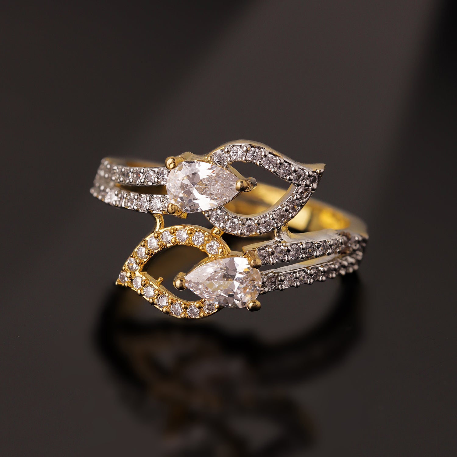 Discover the radiance of the Gold Elegance Collection with this breathtaking Vines Statement Ring for women, a true symbol of sophistication and style. Crafted from premium brass with a luxurious yellow gold plating, this designer ring features a graceful vine-inspired pattern adorned with brilliant CZ stones that exude sparkle from every angle. The twin pear-cut stones at the heart of the design reflect timeless beauty, making it the perfect gold Ring for every elegant woman. The Gold Elegance Vines Statement Ring is designed to be your go-to accessory for all occasions from weddings and festive celebrations to cocktail evenings. Its intricate craftsmanship and refined shine make it a stunning American diamond Ring for women that enhances any outfit, whether traditional or contemporary. A truly thoughtful gift for wife, girlfriend, or any special woman in your life.