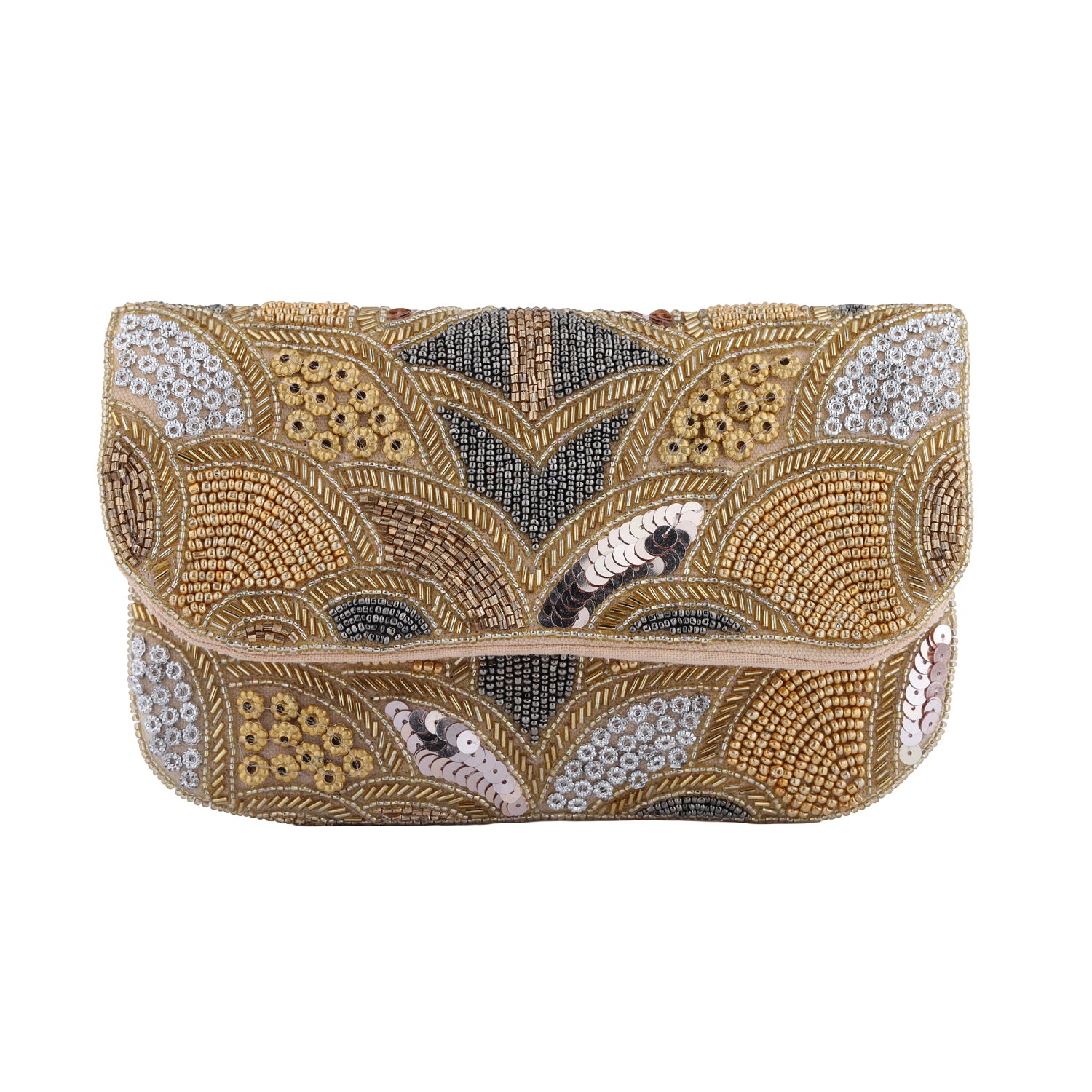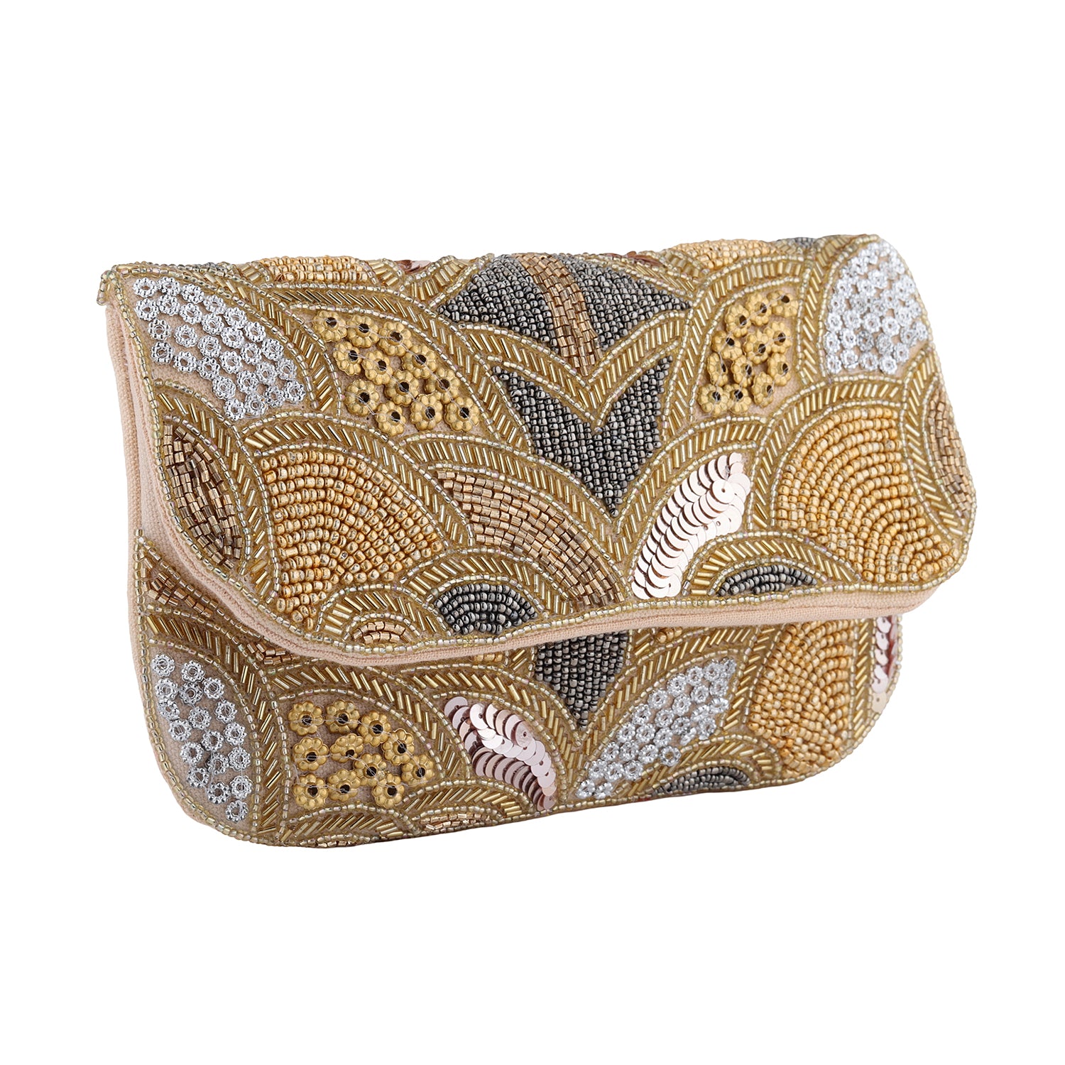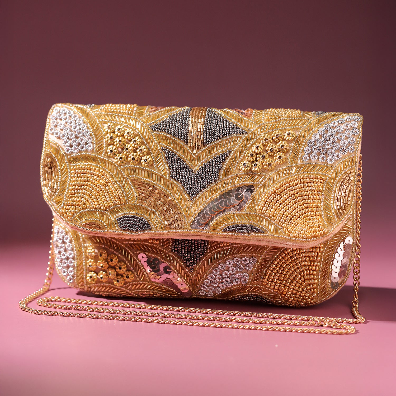 Step into timeless glamour with the Golden Radiance Beaded Clutch with Sling Chain, a stunning masterpiece from our Trendy Bags Collection. Handcrafted to perfection, this clutch brings together opulence, artistry, and sophistication, making it the ultimate companion for every festive and party occasion. Made from luxurious fabric and intricate beadwork, the clutch dazzles in rich shades of gold, bronze, silver, and champagne, creating a shimmering symphony that catches every glimmer of light. The delicate hand-beaded and sequin detailing forms a captivating scallop-inspired pattern, reminiscent of art deco elegance and golden-era charm. Designed with a sleek envelope flap and a detachable gold sling chain, this clutch offers both beauty and versatility, carry it in hand for a sophisticated evening look or wear it crossbody for effortless chic at parties and celebrations. Despite its compact silhouette, it easily fits your phone, makeup essentials, and cards, combining luxury with practicality. Perfect for festive events, weddings, and grand celebrations, the Golden Radiance Beaded Clutch adds an exquisite finishing touch to your outfit. It also makes a thoughtful and luxurious gift for women who love timeless fashion, exquisite craftsmanship, and statement accessories.