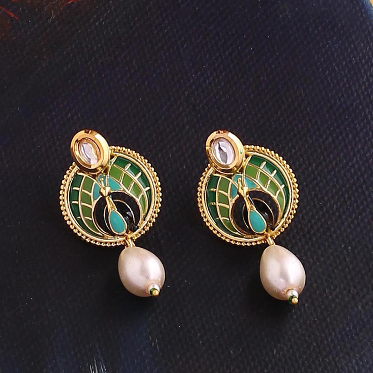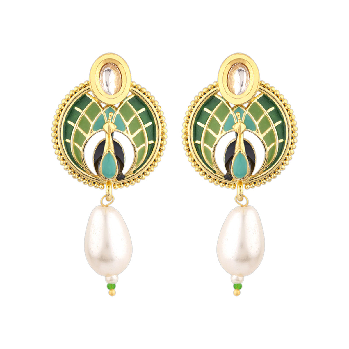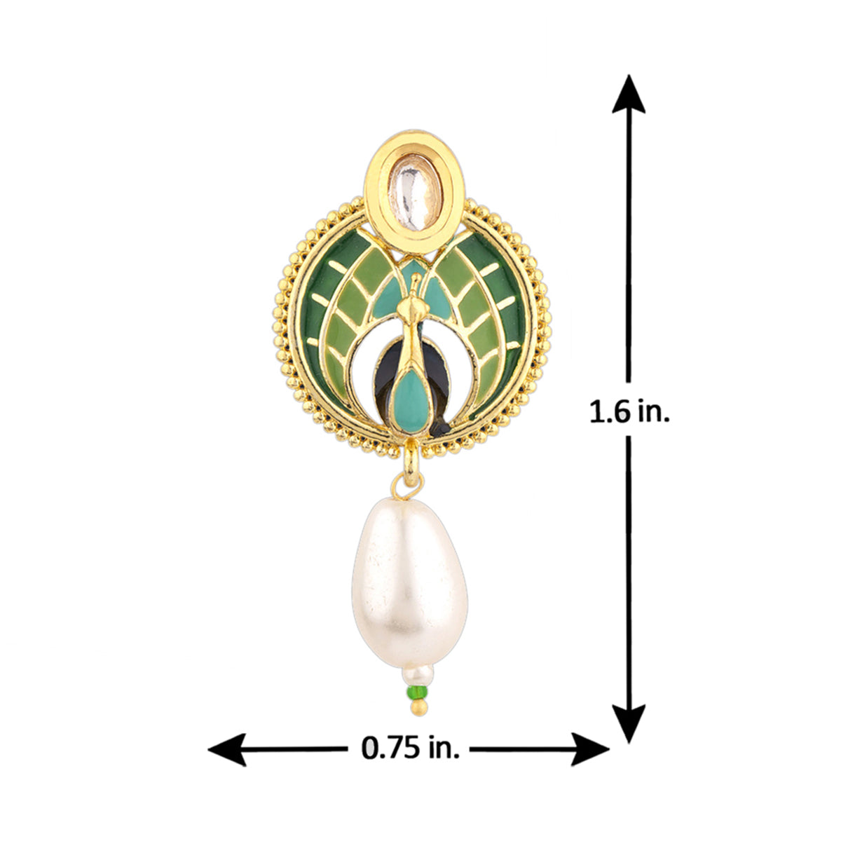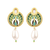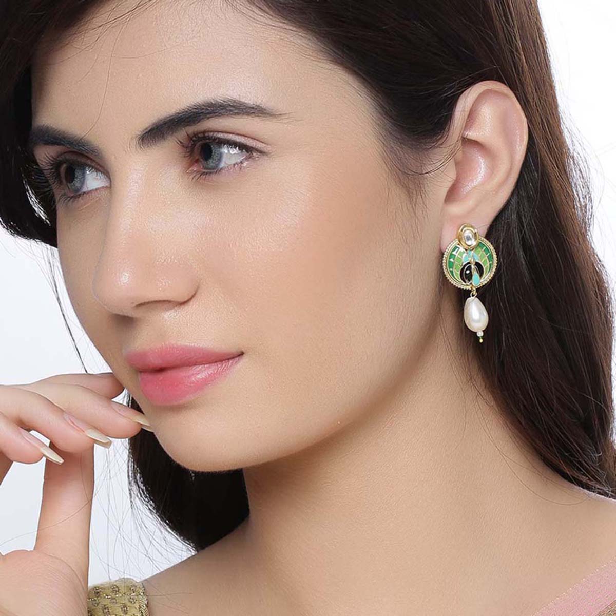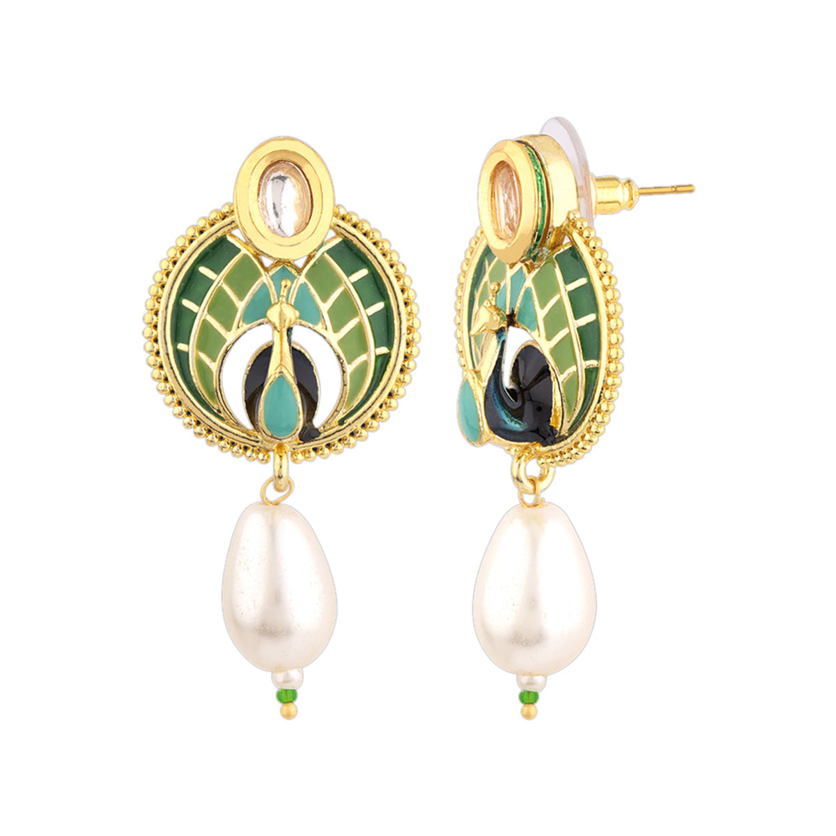 Peacock dance drop earrings adorned with faux pearls and kundan gems, inspired by the enigma and longing of Radha and Krishna's love. Made from brass and yellow gold plated, the enameled pair is perfect for casual and formal looks.
