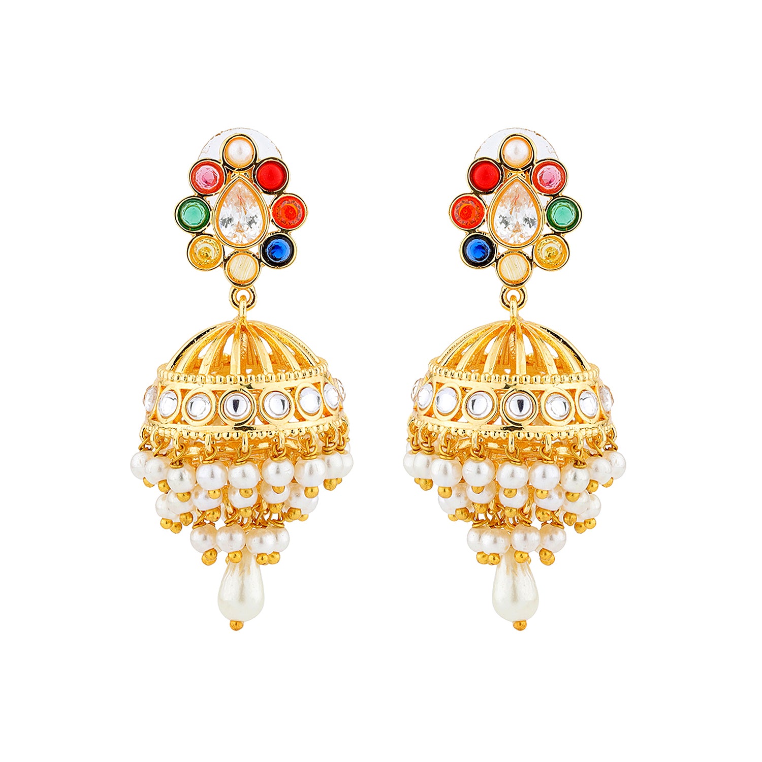 Step into a world where tradition meets timeless charm with the Navratan Astha & Nava Jhumka Earrings, a stunning ode to celestial beauty, heritage, and artistry. From our Navratan Collection, these earrings celebrate the divine harmony of the Navratans, the nine sacred gemstones that embody cosmic balance, prosperity, and protection. Expertly handcrafted in brass with radiant yellow gold plating, these designer earrings for women feature a classic jhumka silhouette elevated with a modern twist of colorful Navratan-inspired stones and delicate pearl detailing. The upper floral motif symbolizes cosmic unity, while the dome-shaped jhumka cascades gracefully with layers of pearls, creating movement, brilliance, and a touch of regal splendor.Perfect for festive wear, wedding earrings, or even pooja wear, these gold earrings beautifully complement traditional sarees, silk lehengas, or Indo-western fusion outfits. Whether you’re celebrating love, festivals, or life’s grand moments, these earrings will make you glow with divine radiance. Looking for a gift for women that tells a story, The Navratan Astha & Nava Jhumka Earrings are a thoughtful choice for anniversaries, weddings, or as a heartfelt Valentine’s Day gift that symbolizes strength, love, and balance.