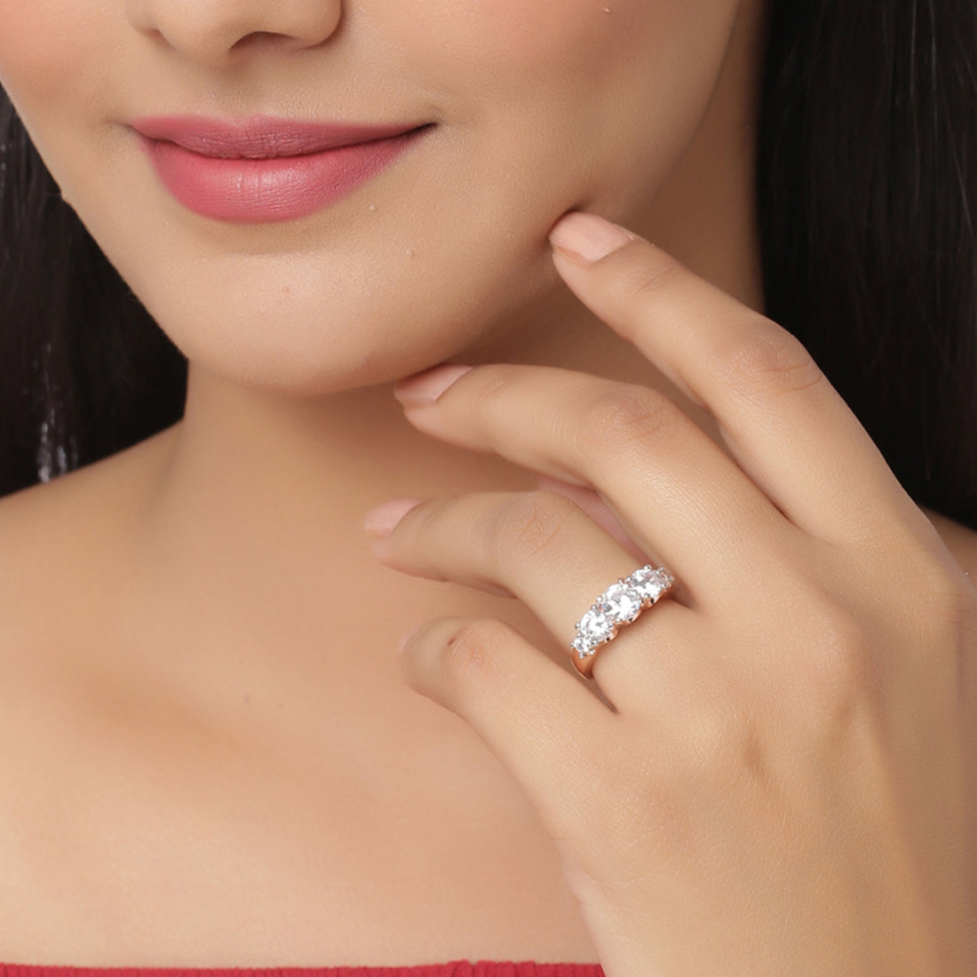 CZ gems in a classic cluster setting have been used to embellish this brass ring. Rose gold plated, lightweight and very versatile This piece of jewelry comes with the Voylla assurance of quality and durability.