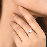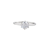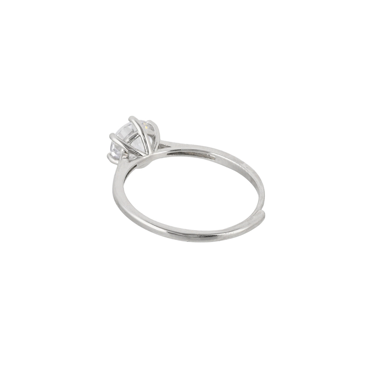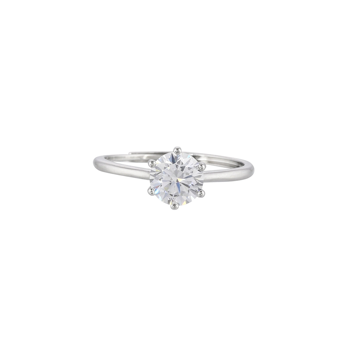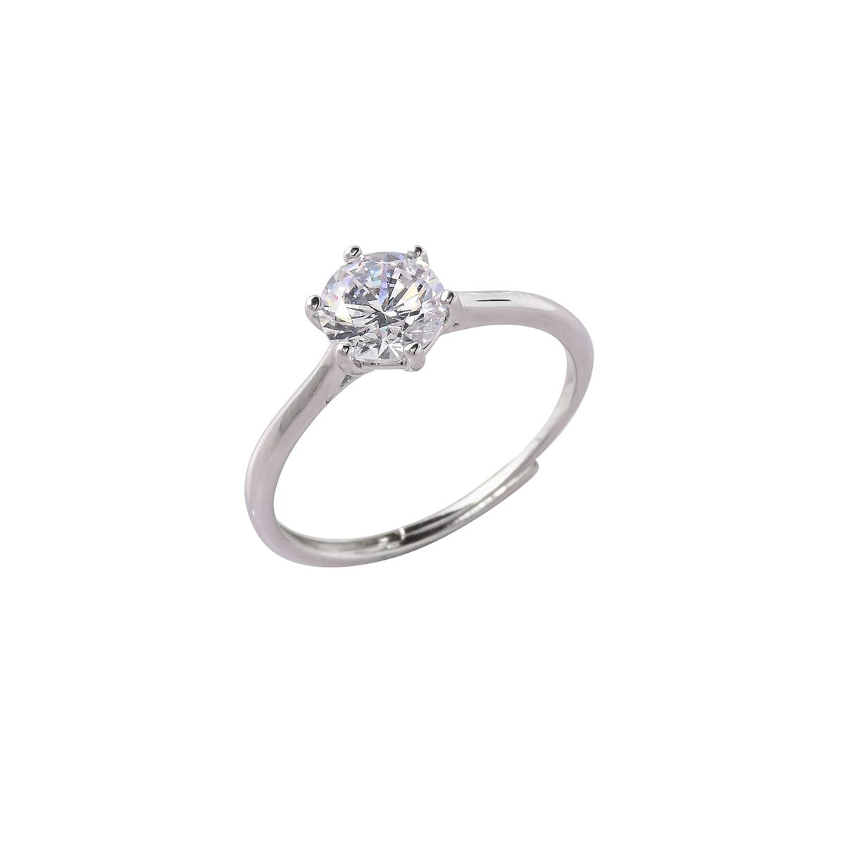A thin band brass ring with classic silver plating. Adorned with a large, round cut clear zircon gemstone, the lightweight and comfortable ring is good for occasional as well as everyday wear.