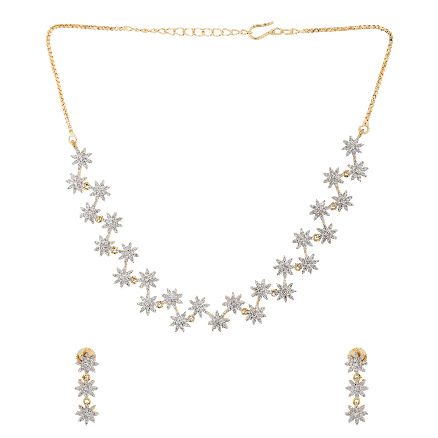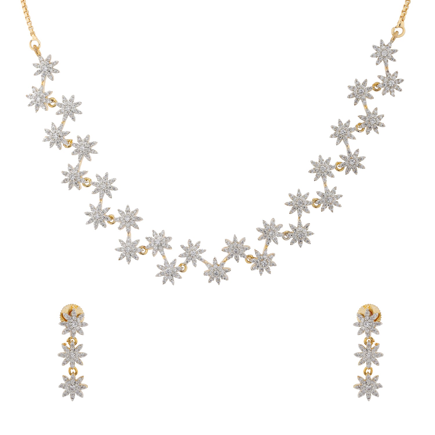 Illuminate your elegance with the Sparkling Essentials Collection, presenting the exquisite Flora Spark CZ Necklace Set for women, a stunning celebration of femininity, grace, and timeless charm. Expertly crafted from premium brass with rich yellow gold plating, this elegant necklace set is adorned with intricately designed floral motifs studded with brilliant CZ stones, capturing a radiant glow that sparkles with every movement. Accompanied by matching earrings, the Flora Spark Necklace Set embodies sophistication with a modern twist. Whether worn for weddings, festive events, or cocktail parties, it elevates your look with effortless allure. A perfect designer Necklace set for today’s modern woman, it also makes a thoughtful gift for wife, gift for girlfriend, or gift for women who appreciate fine craftsmanship and classic elegance.