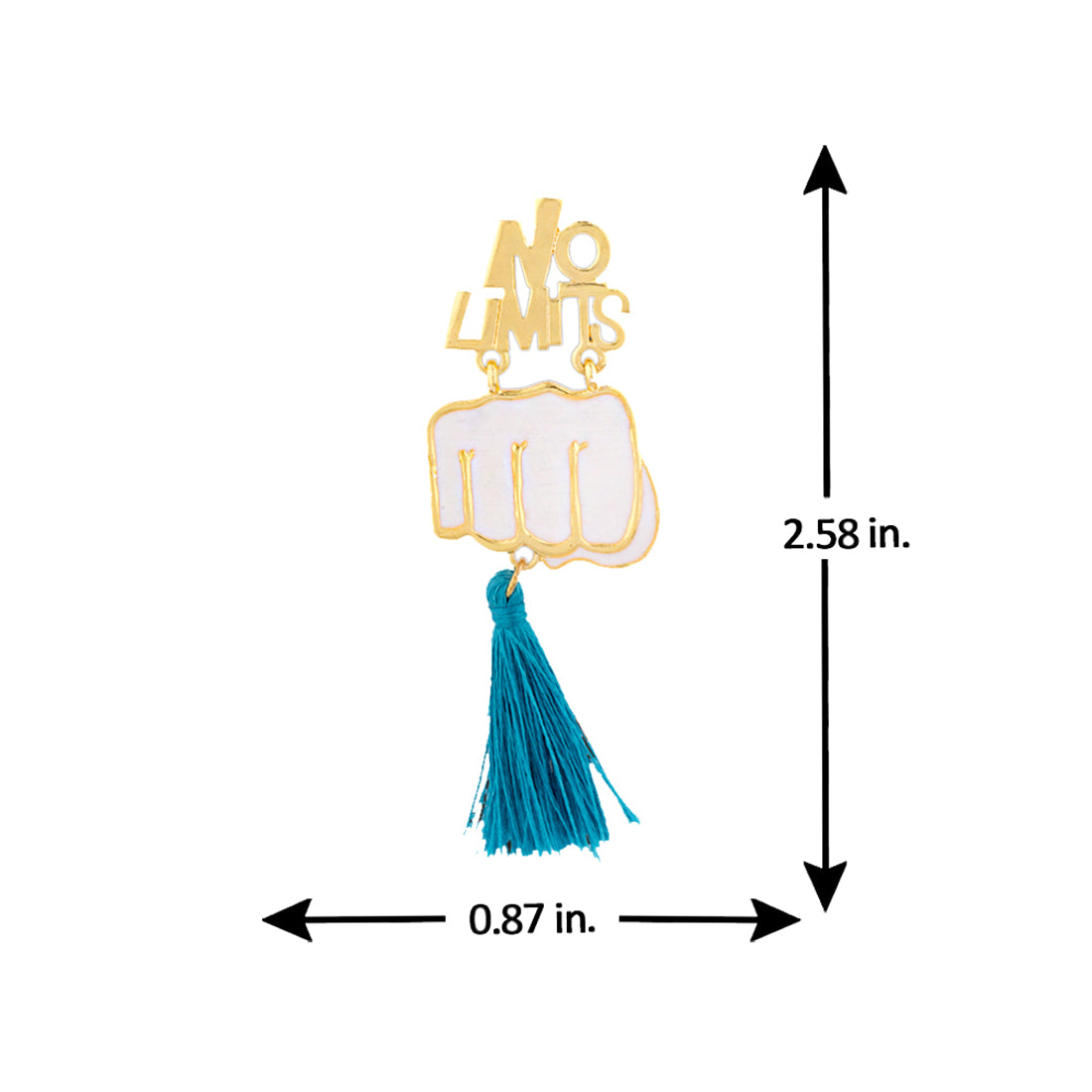 No Limits lettering drop earrings with tassels, inspired by popular inscriptions on Indian trucks. Yellow gold plated and fashioned out of brass, the enameled pair is fun, versatile and lightweight. Pair with a Boho dress.