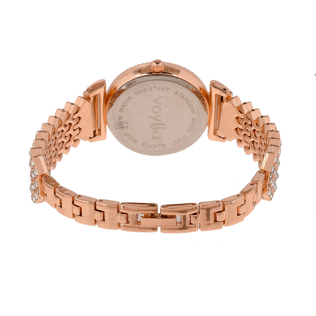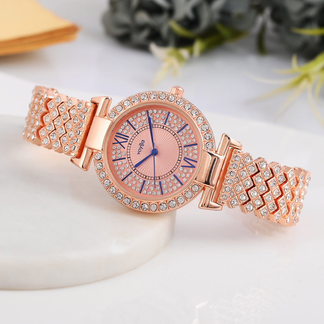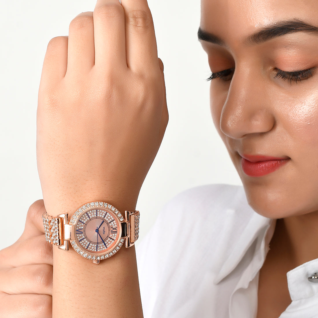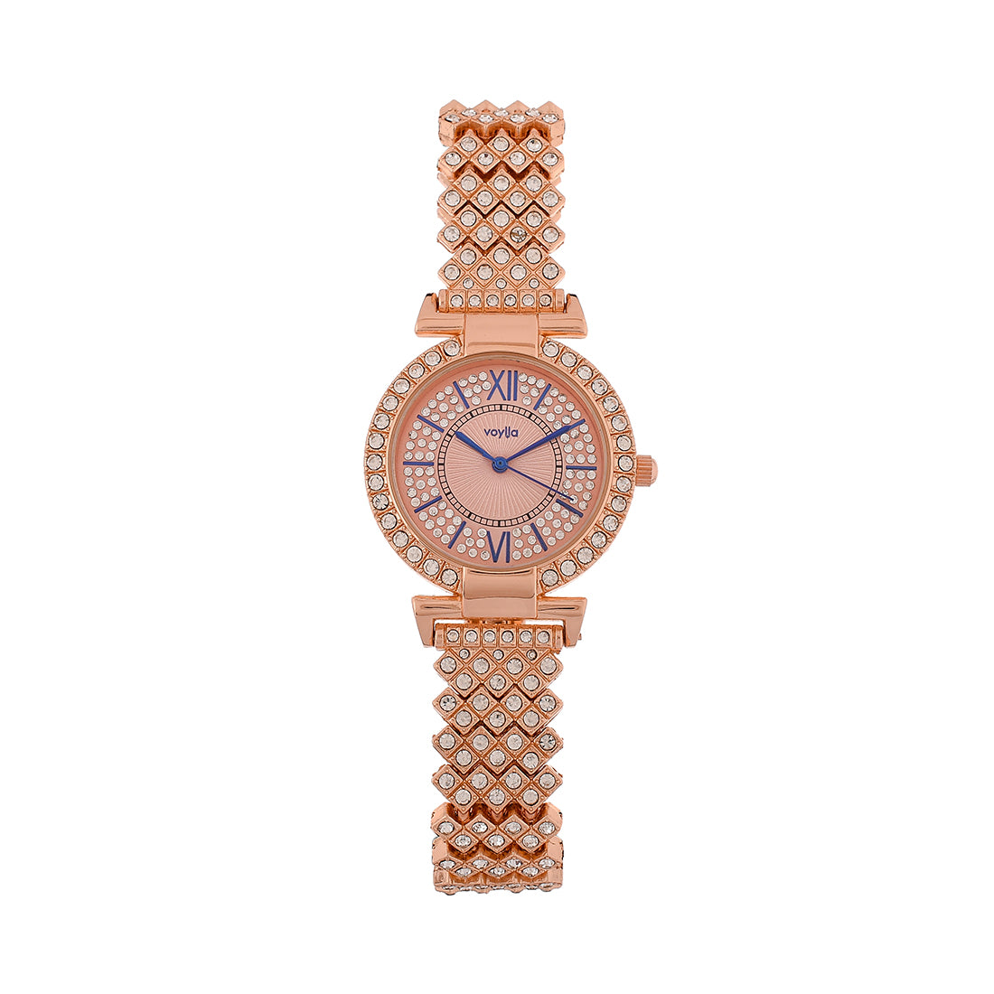 Opulent analog watch with a lovely rose gold plating and gemstones. Made from brass and the perfect piece to compliment formal looks and outfits of all kinds.