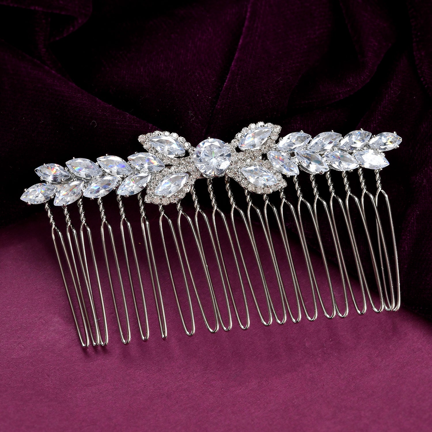 The Royal Romance Mia Comb Pin Hair Accessory is an exquisite piece from Voylla’s Royal Romance Collection, crafted from high-quality Alloy and plated with white rhodium for a luxurious and durable finish. This elegant comb features an intricate floral design adorned with sparkling American diamonds, making it a standout piece for any occasion. The clear, radiant stones beautifully catch the light, adding a touch of glamour to your hairstyle. Whether you're attending a wedding, festive event, or looking for the perfect gift for someone special, this versatile accessory is ideal. It complements various styling options, from classic updos to relaxed, romantic looks, ensuring you always look sophisticated. This comb makes an excellent gift for occasions like Valentine’s Day, Diwali, Raksha Bandhan, or Christmas, and is a timeless addition to any woman's accessory collection.