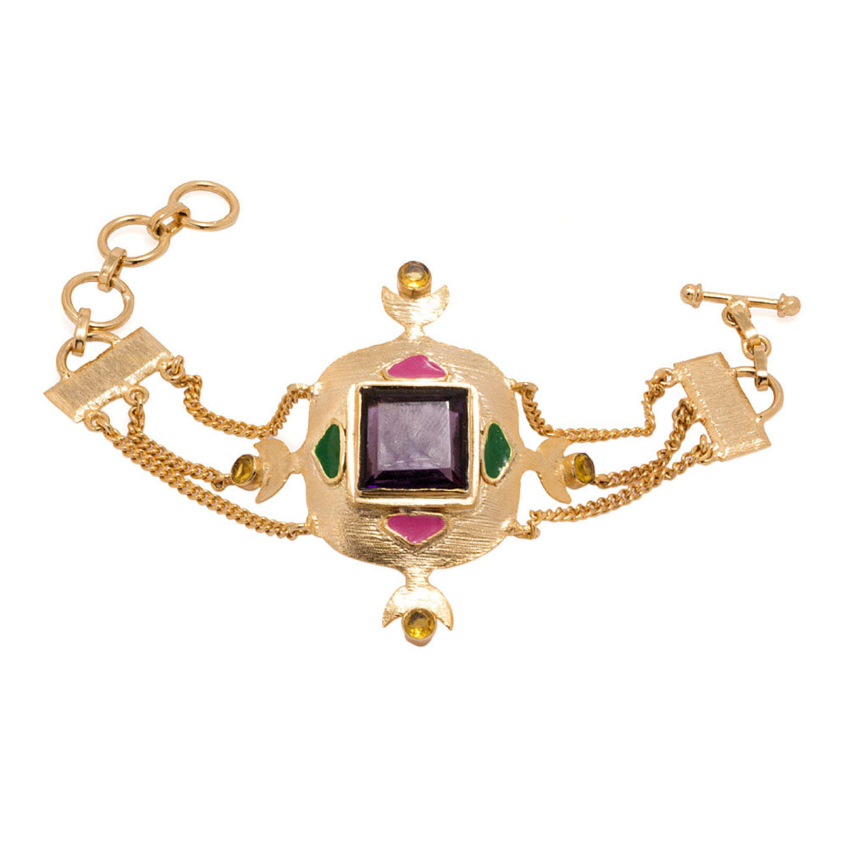Traditional yet contemporary, this multi-stranded link bracelet looks absolutely marvelous with its encrustations of central amethyst and sparkling citrine all along its sides.Its beauty is further accentuated by green-pink enamel designing and stunning glossy gold tone.
