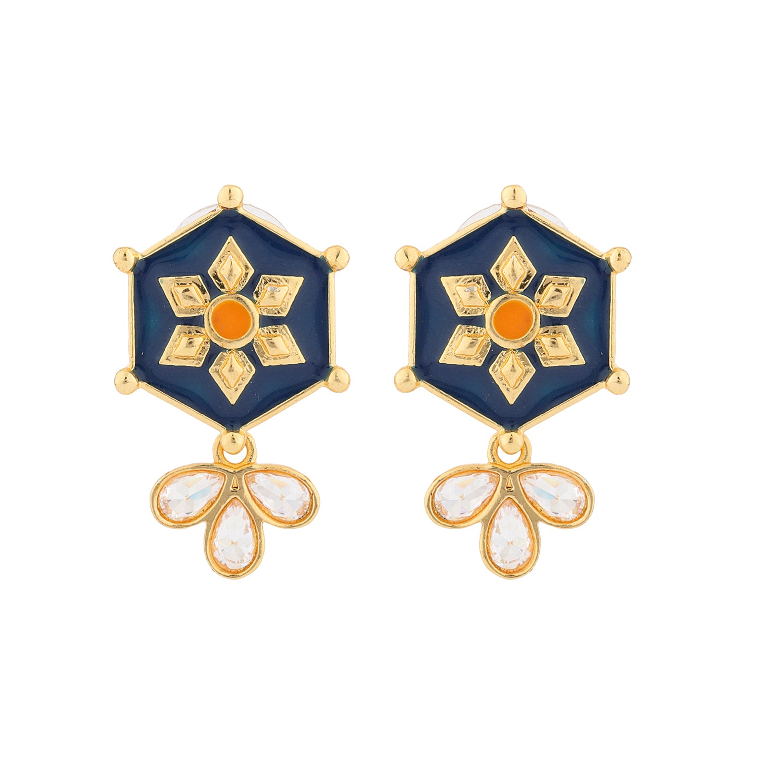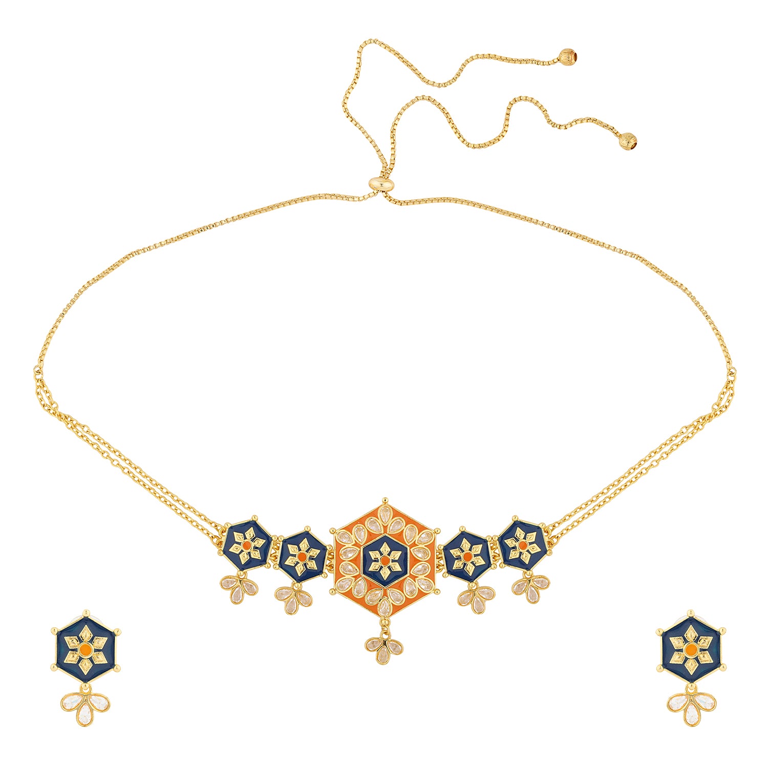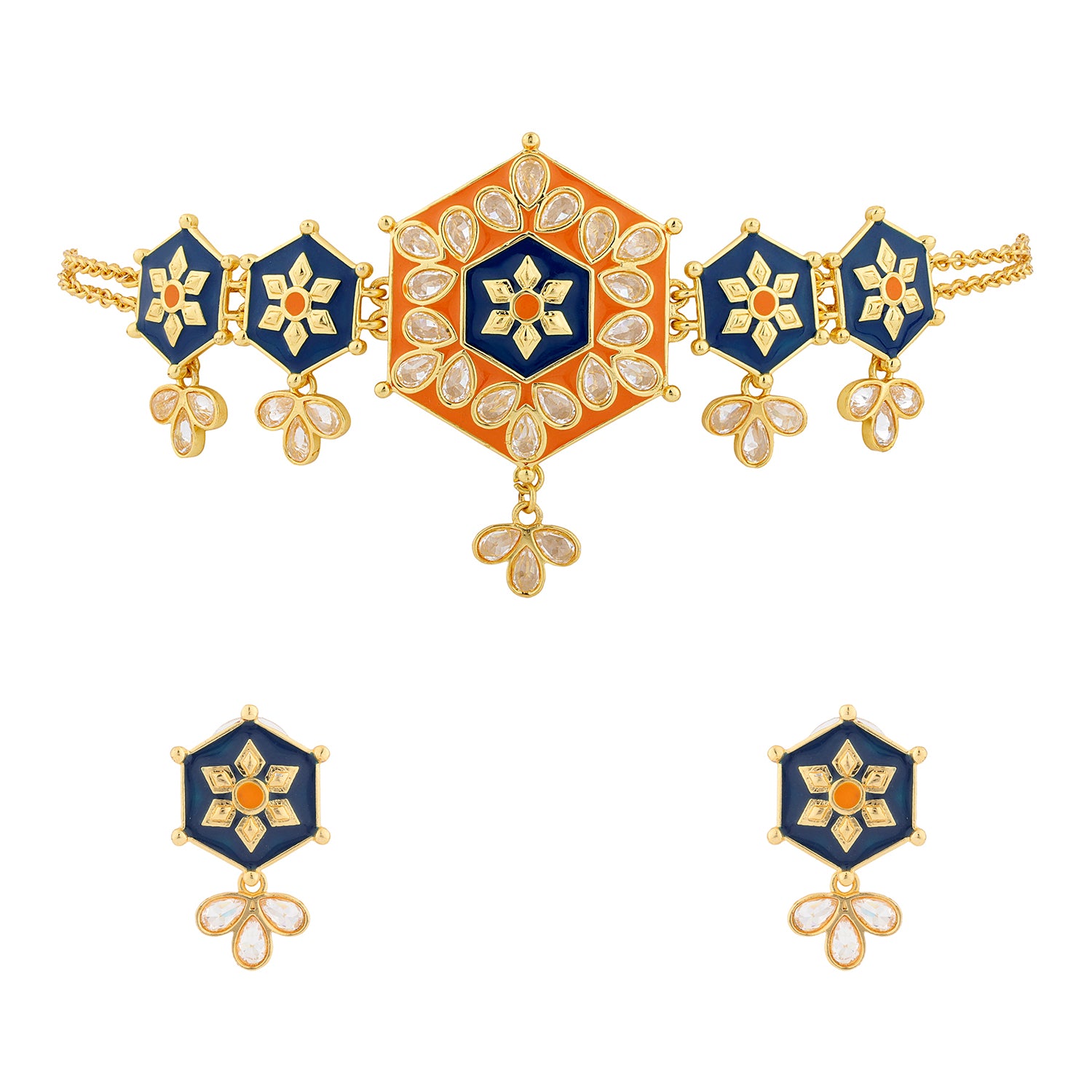 The Gota Patti Shahi Jharokha Necklace Set is a luxurious enameled ethnic necklace set that brings together tradition, royalty, and festive charm in one breathtaking piece. Inspired by Rajasthan’s regal Gota Patti embroidery and crafted with intricate enamel detailing, this ethnic enamel necklace set features a bold hexagonal jharokha design with vibrant navy and orange enameling. Surrounded by shimmering reverse AD stones and finished in a radiant gold tone, this gold necklace set is designed to be a true showstopper. Perfect as a wedding enamel necklace set, a festive jewellery necklace set, or a wedding ethnic necklace set, this design celebrates the grandeur of Rajwada aesthetics while giving you a chic, stylish, and versatile accessory. The matching earrings complete the look, making it a festive statement necklace set you’ll treasure for years to come. Whether you’re dressing up for weddings, receptions, poojas, Diwali, or Karwa Chauth, this ethnic wear necklace set will make you shine like royalty. If you’re searching for jewellery gifts for women, a timeless gift for her, or a thoughtful gift for girlfriend, this stylish necklace set is a perfect choice that combines cultural elegance with modern flair.