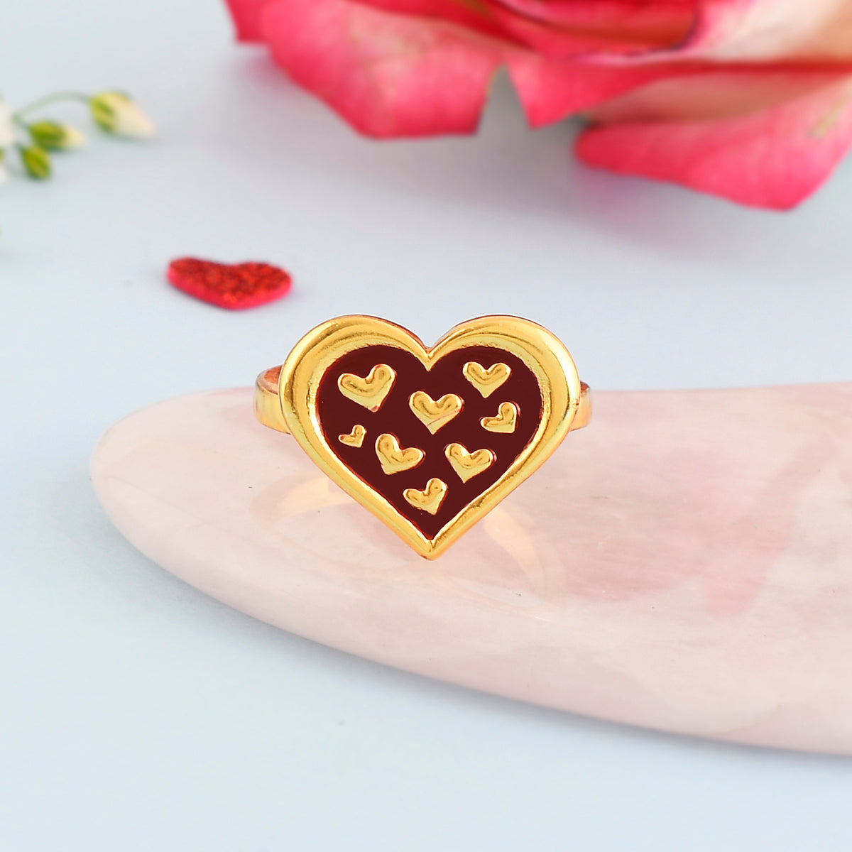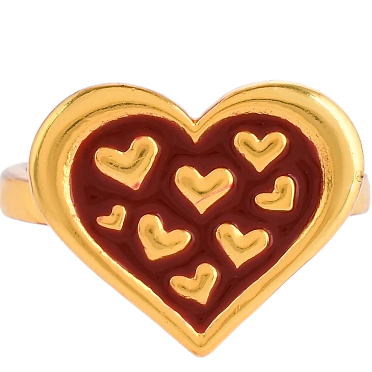 Bonded hearts adjustable finger ring with red enamel. Made from brass and gold plated. Pair with casual and formal looks.Weight (Gms): 2.97Size (LxW)(Inch): 5.46*4.68Material: BrassPlating: Yellow GoldColor: GoldSales Package: 1 RingProduct Code: 8905124491012