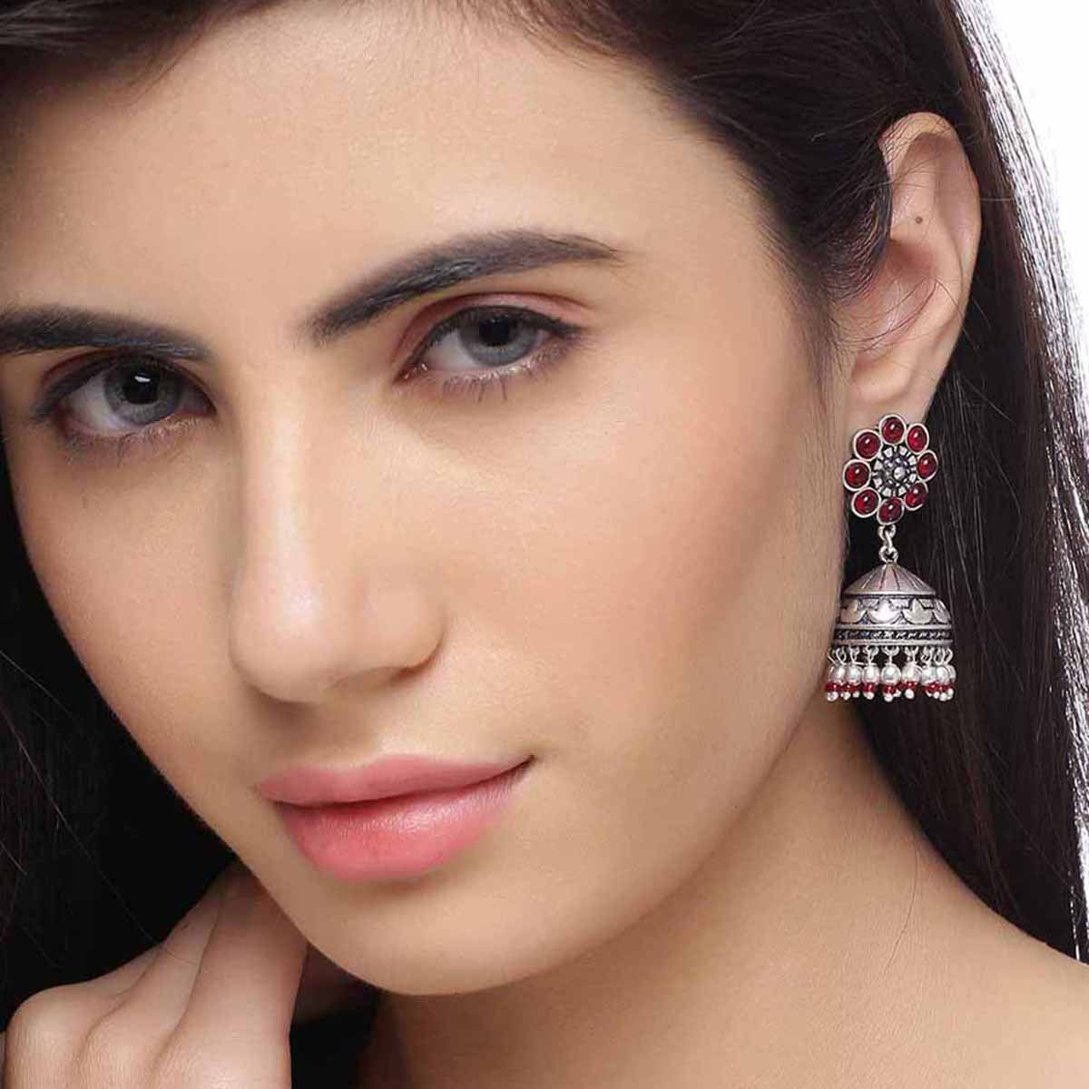 Lightly embellished floral jhumka drop earrings. Made from brass and oxidized silver plated. Good for ethnic casual looks. This piece of jewelry comes with the Voylla assurance of quality and durability.