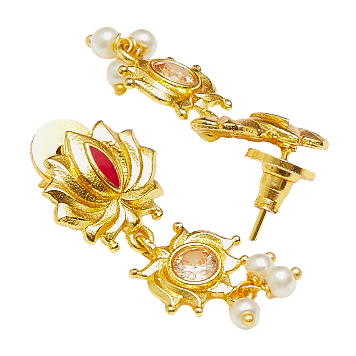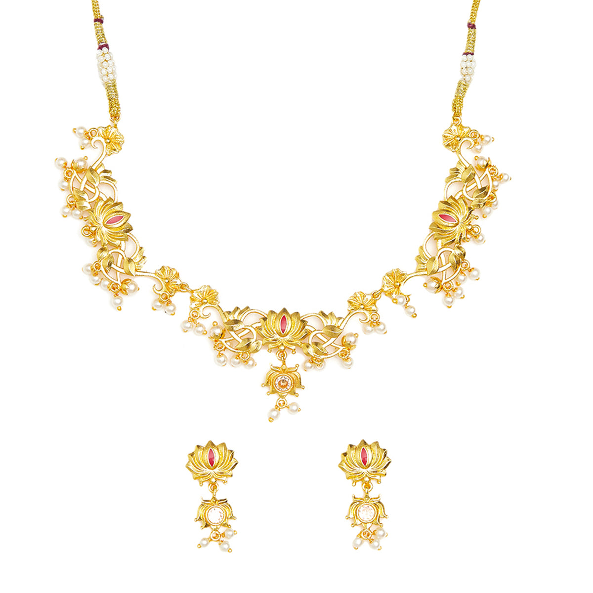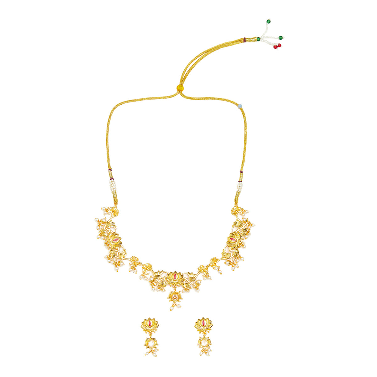 Apsara Faux Pearls Adorned Brass Lotus Motifs Gold Plated Jewellery Set