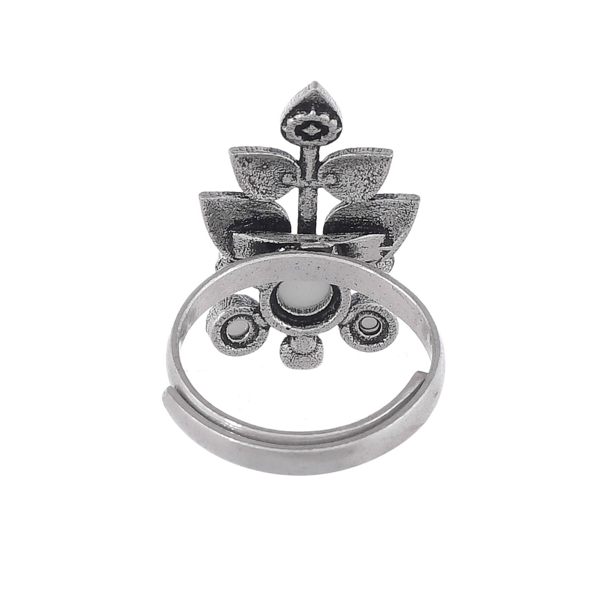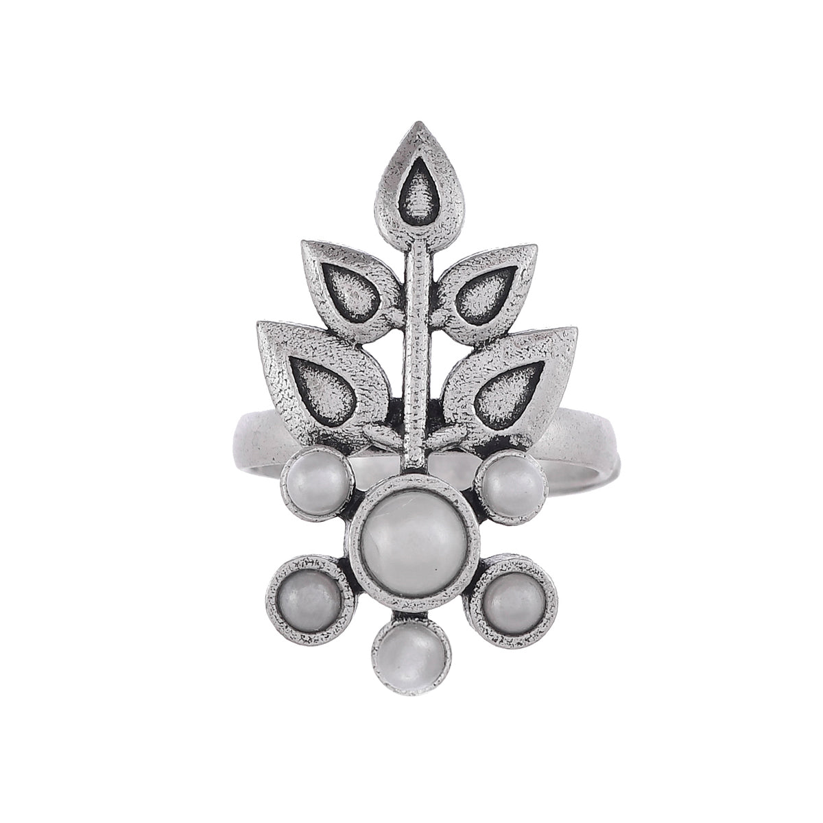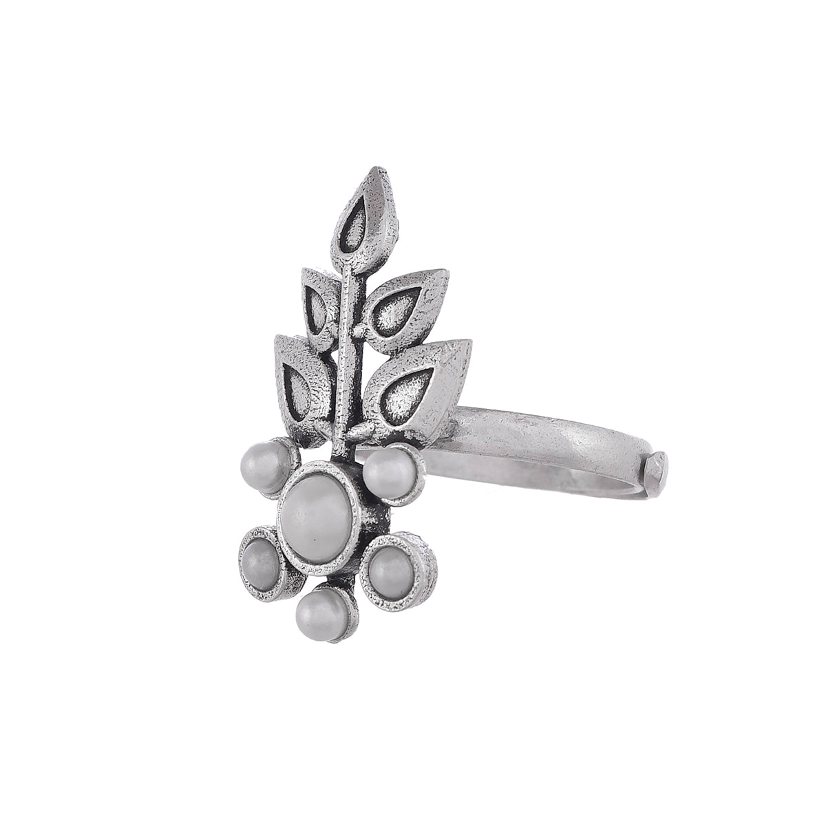 A charming finger ring, inspired by the beautiful and strong fern leaf and designed for style and comfort. Made from brass, the white pearls adorned ring has been given an oxidized silver plating. Adjustable for maximum comfort and versatile.