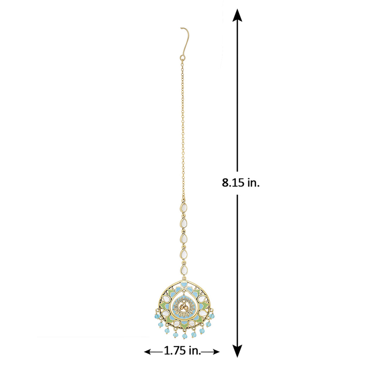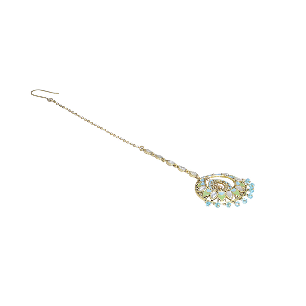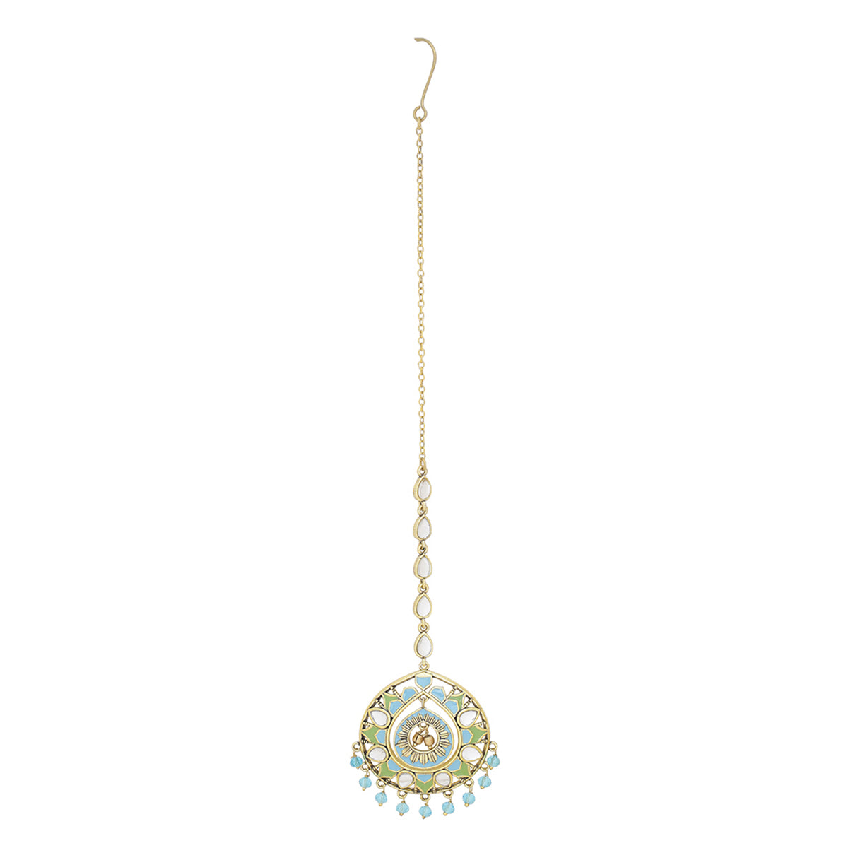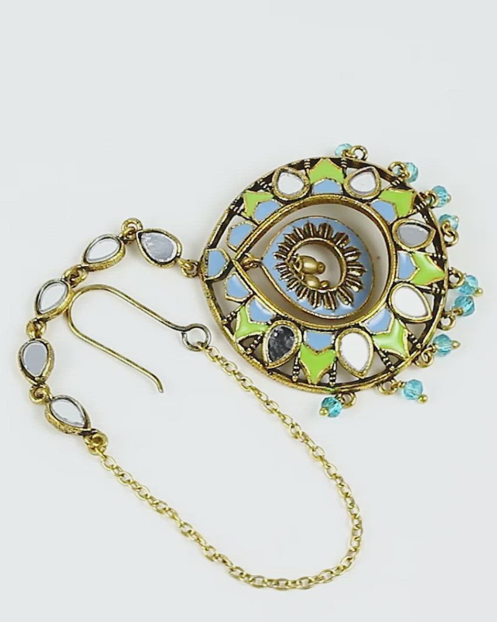 Layered large circles maang tika, lightly embellished and inspired by the fort of Gwalior and its grand architecture. Made from brass and oxidised gold plated, the tika can be paired with ethnic and Indo-Western attire.