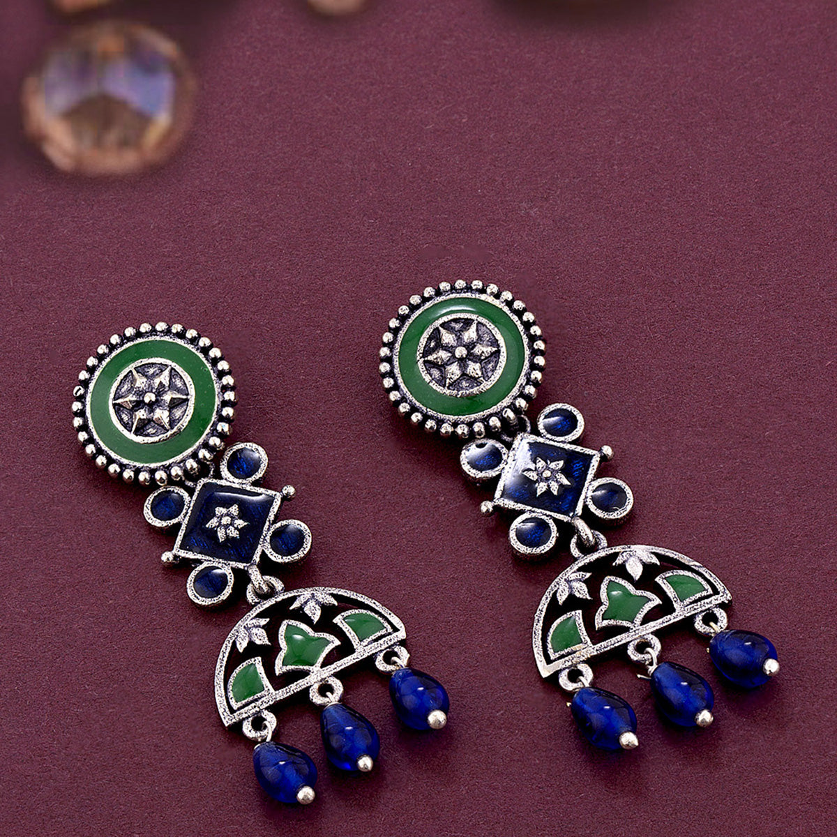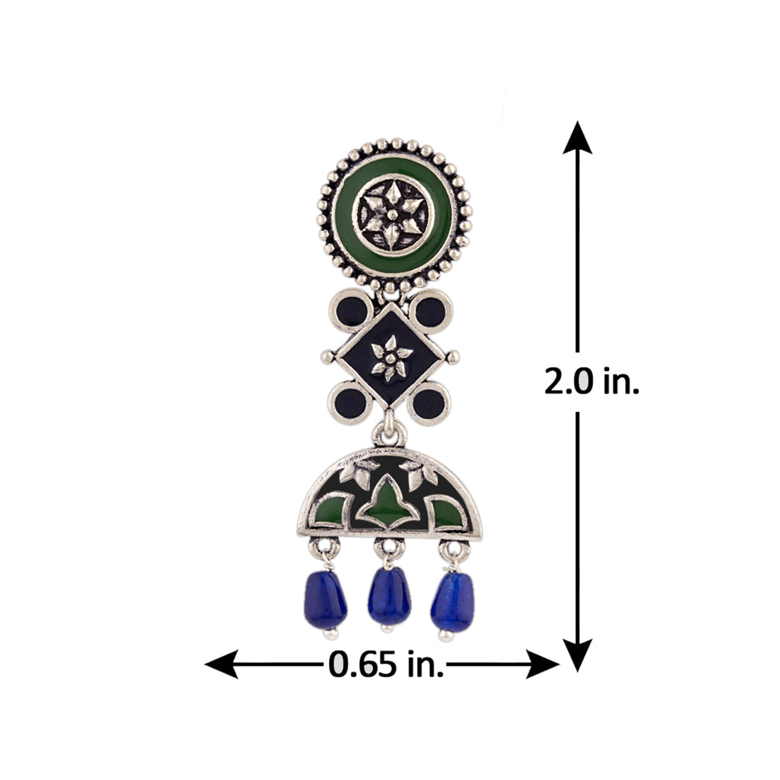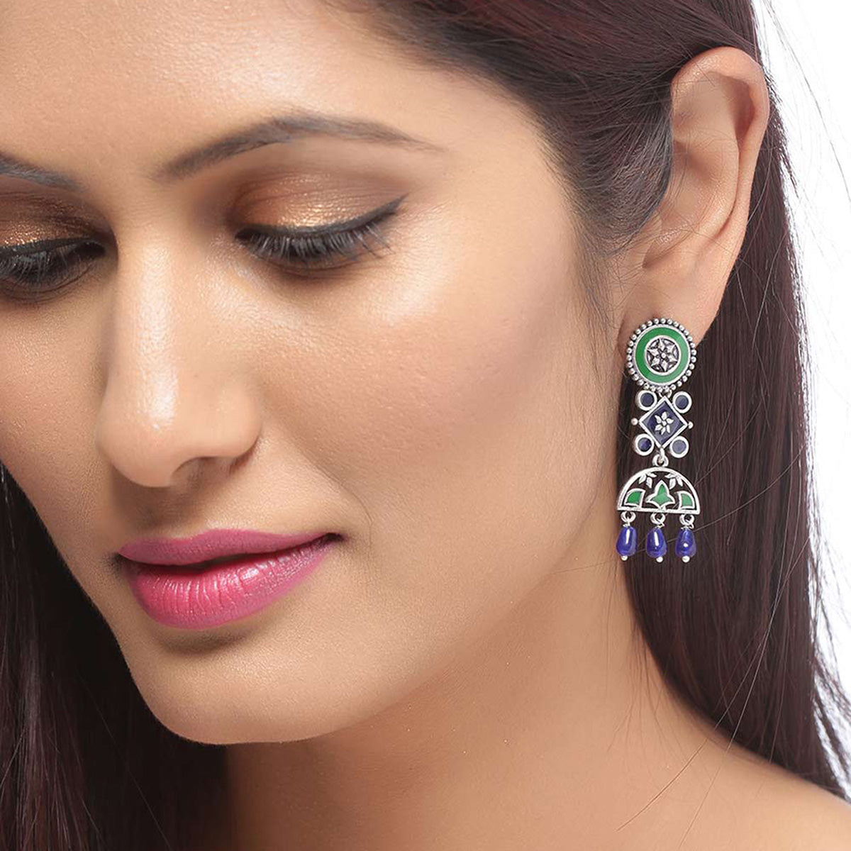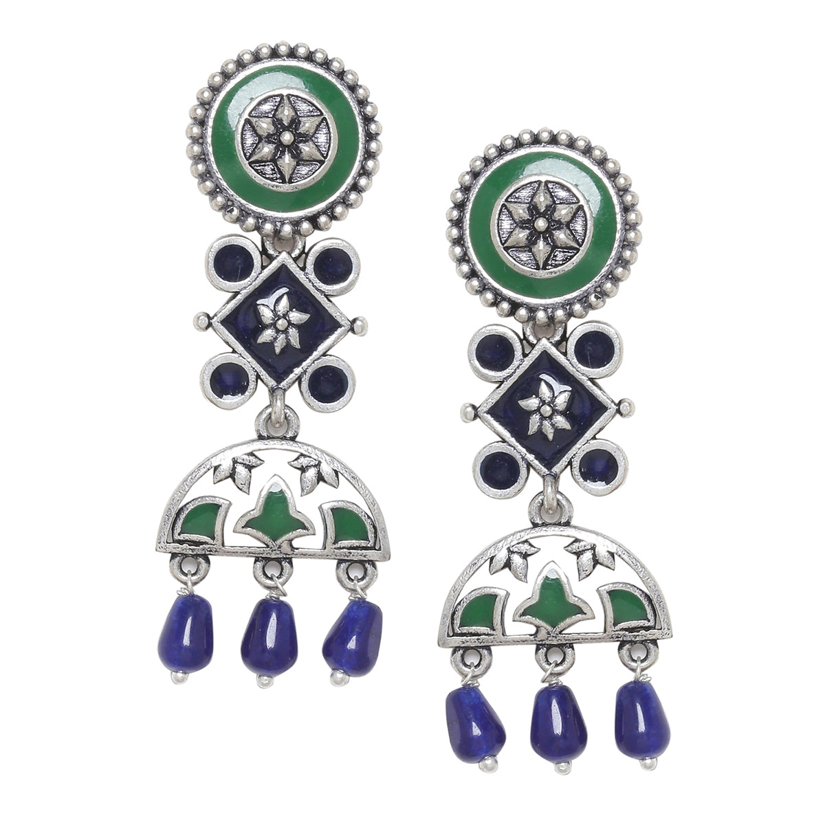 Enamel and beads embellished, nature inspired earrings made from brass. Wear the oxidized silver plated pair with a trendy summer dress. This piece of jewelry comes with the Voylla assurance of quality and durability.