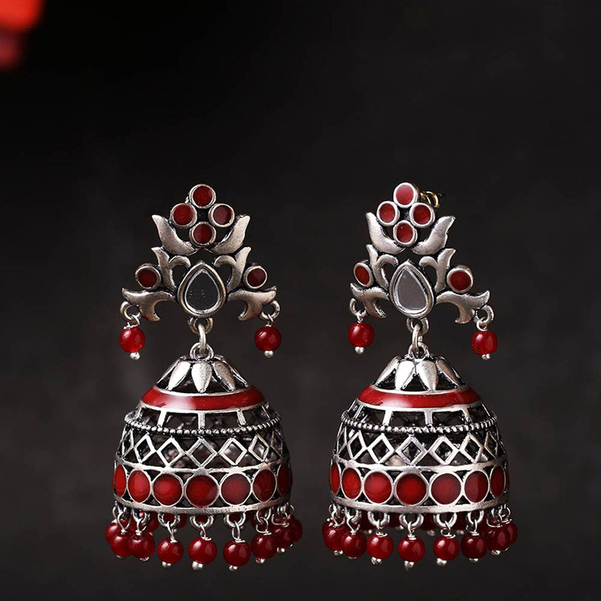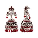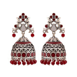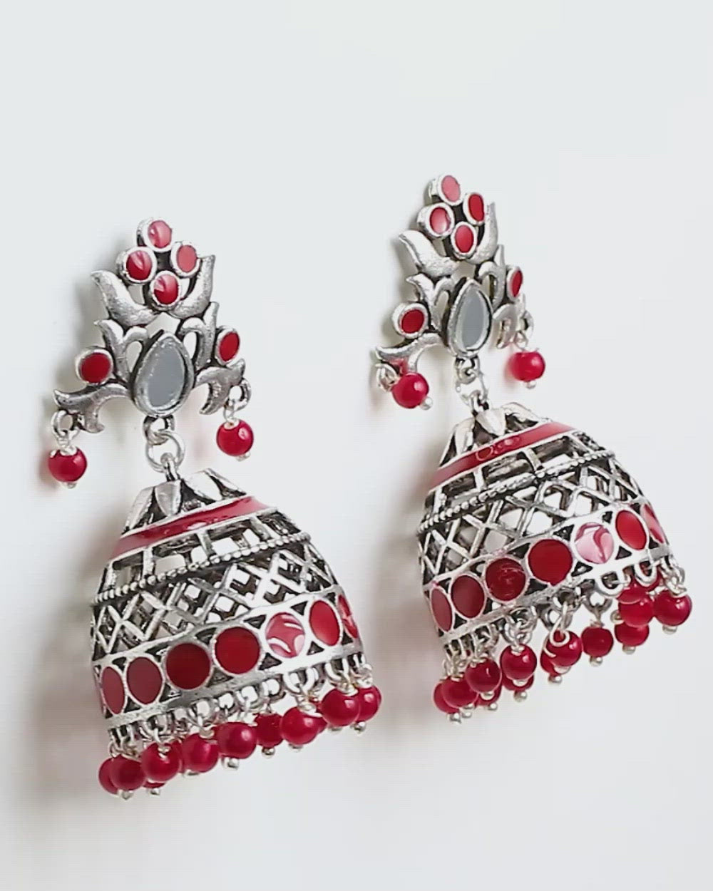 Cutwork design and beads embellished jhumka earrings with oxidized silver plating. Wear the brass earrings with ethnic outfits.