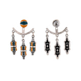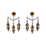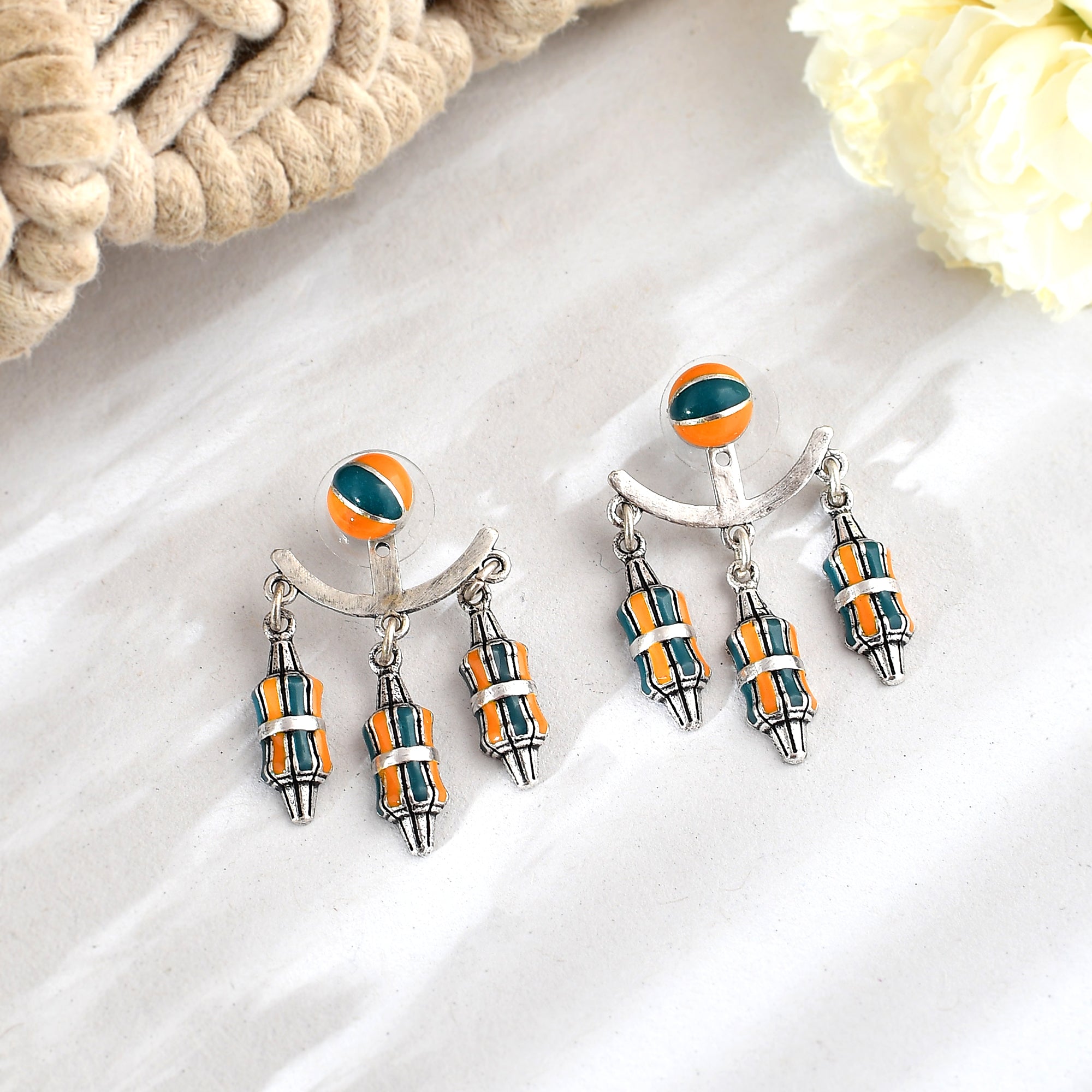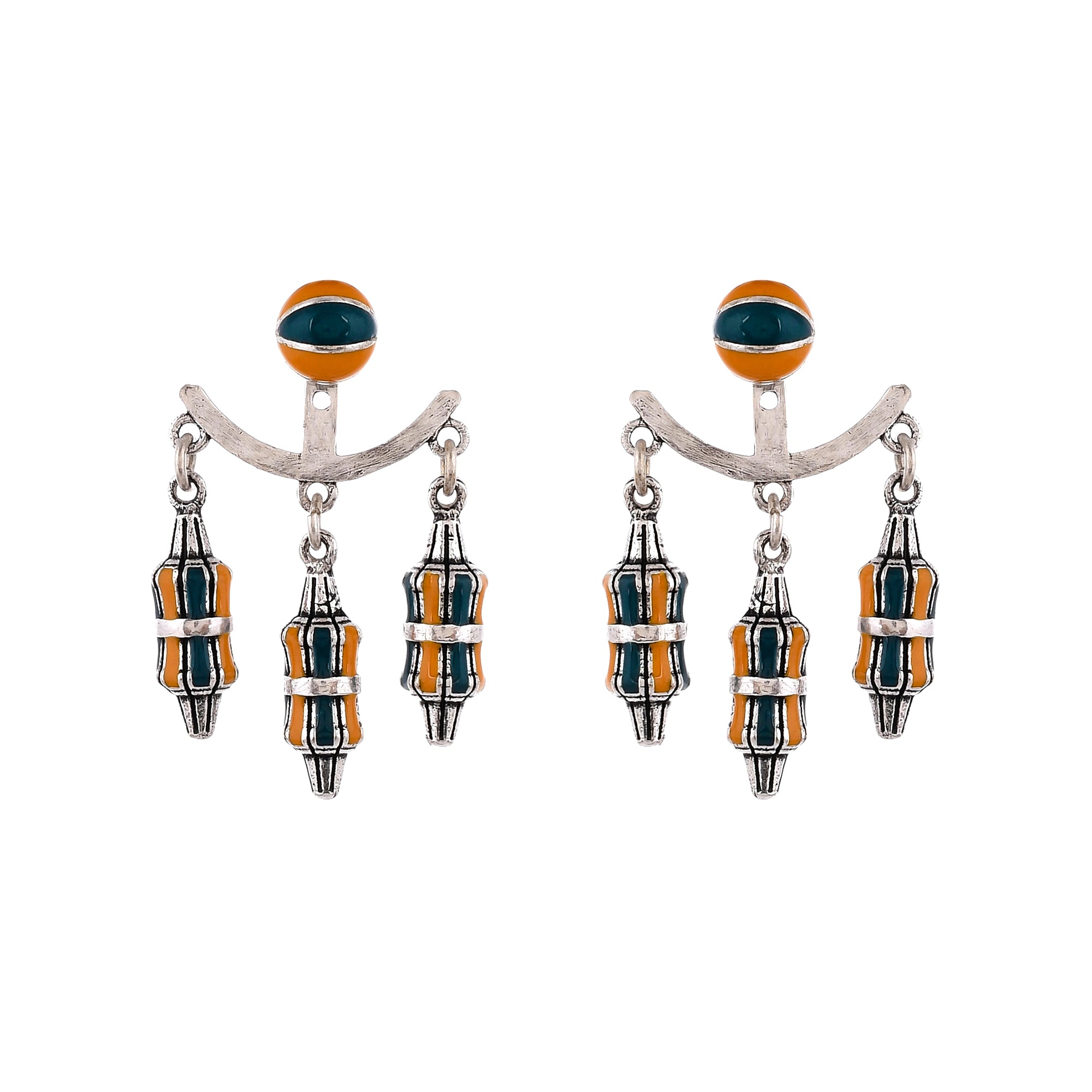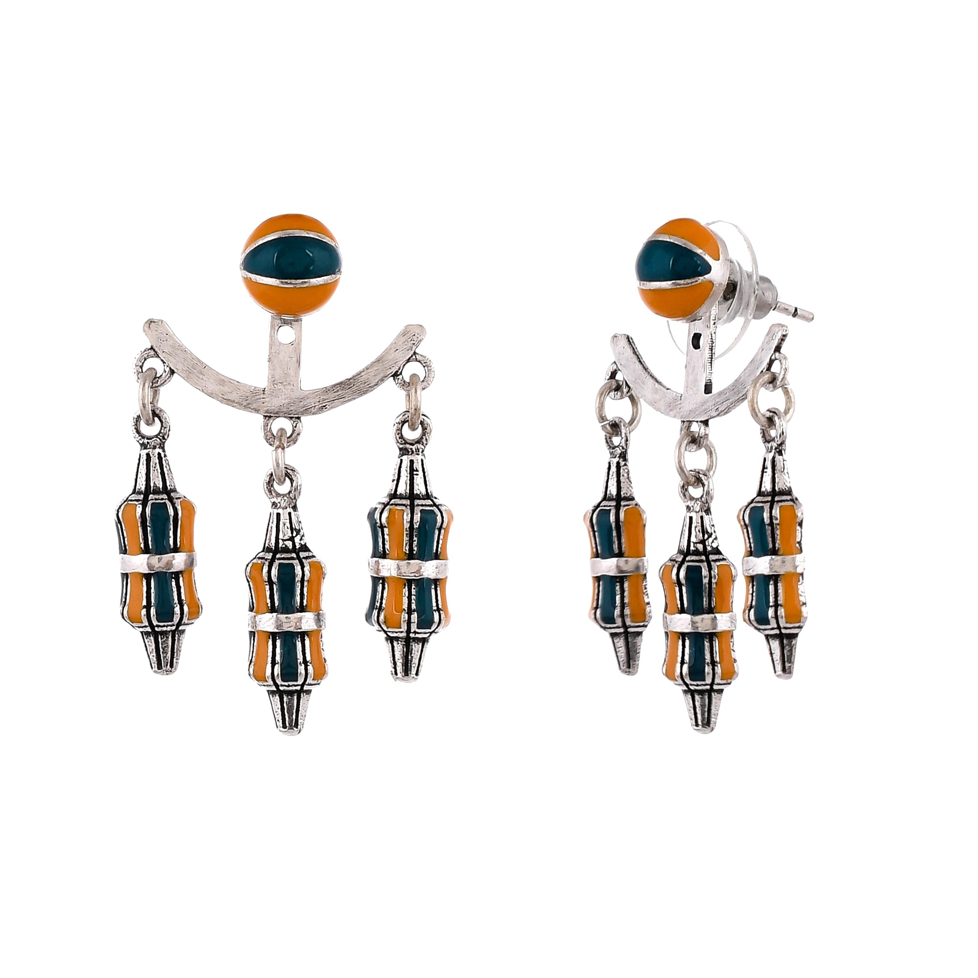 Colourful drop style earrings inspired by the art of block printing. Made from brass and silver plated. Wear with a casual kurta.Weight (Gms): 4.25Size (LxW)(Inch): 1.5*0.35Material: BrassPlating: Silver PlatingColor: SilverSales Package: 2 EarringsProduct Code: 8907617929590