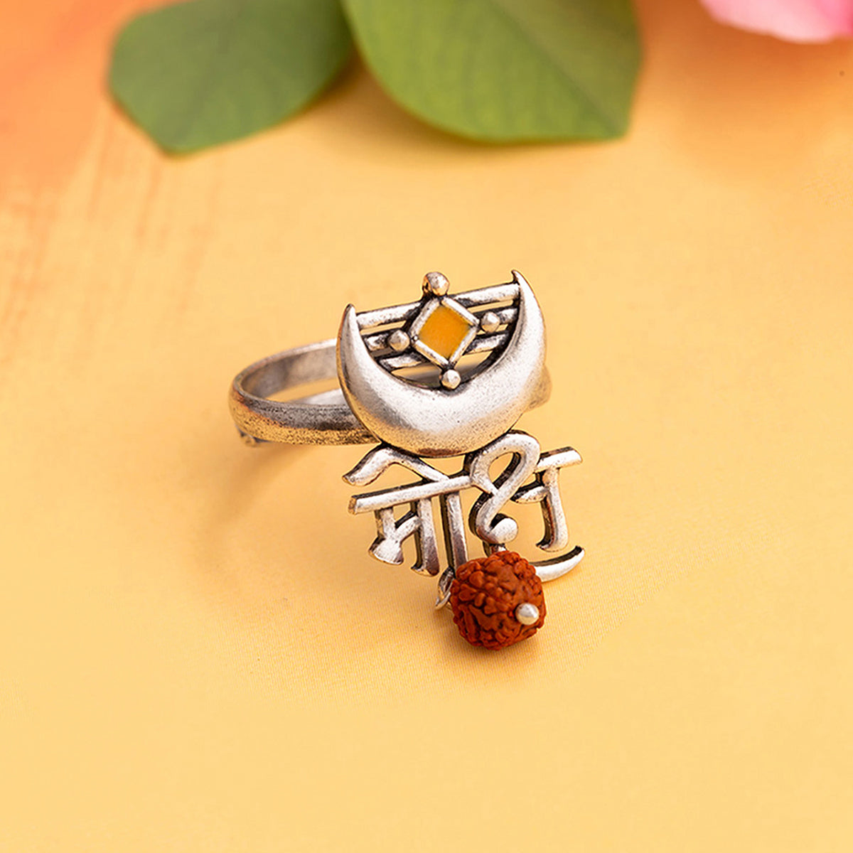 Brass ring with ?moksha? inscription, inspired by the Yogic concepts of self-exploration and oneness with the universe. Oxidised plated and enamelled, the half-moon motif bearing ring has been adorned with a single Rudraksha bead. The ring is adjustable and can be paired with ethnic and Indo-Western looks.