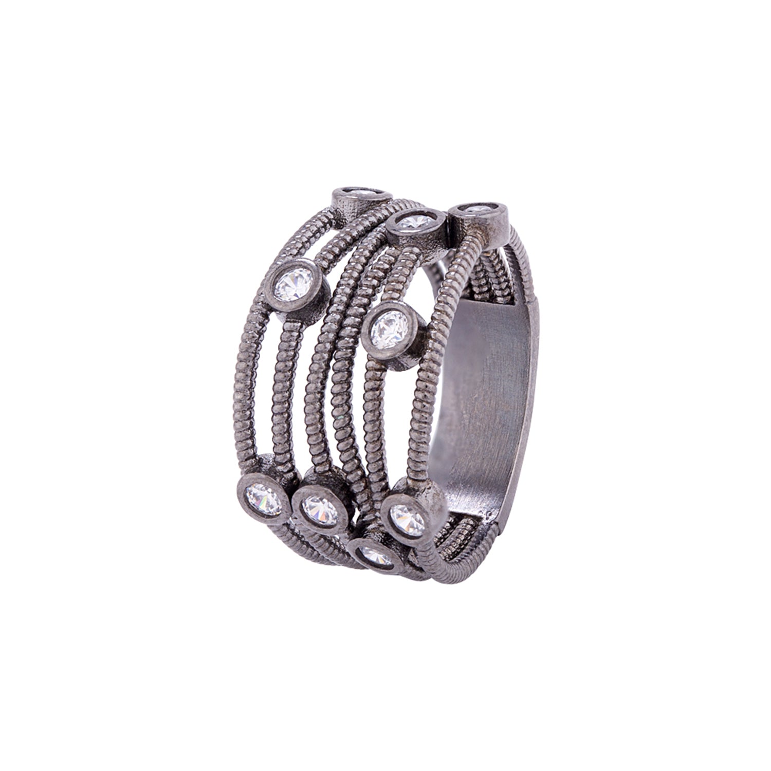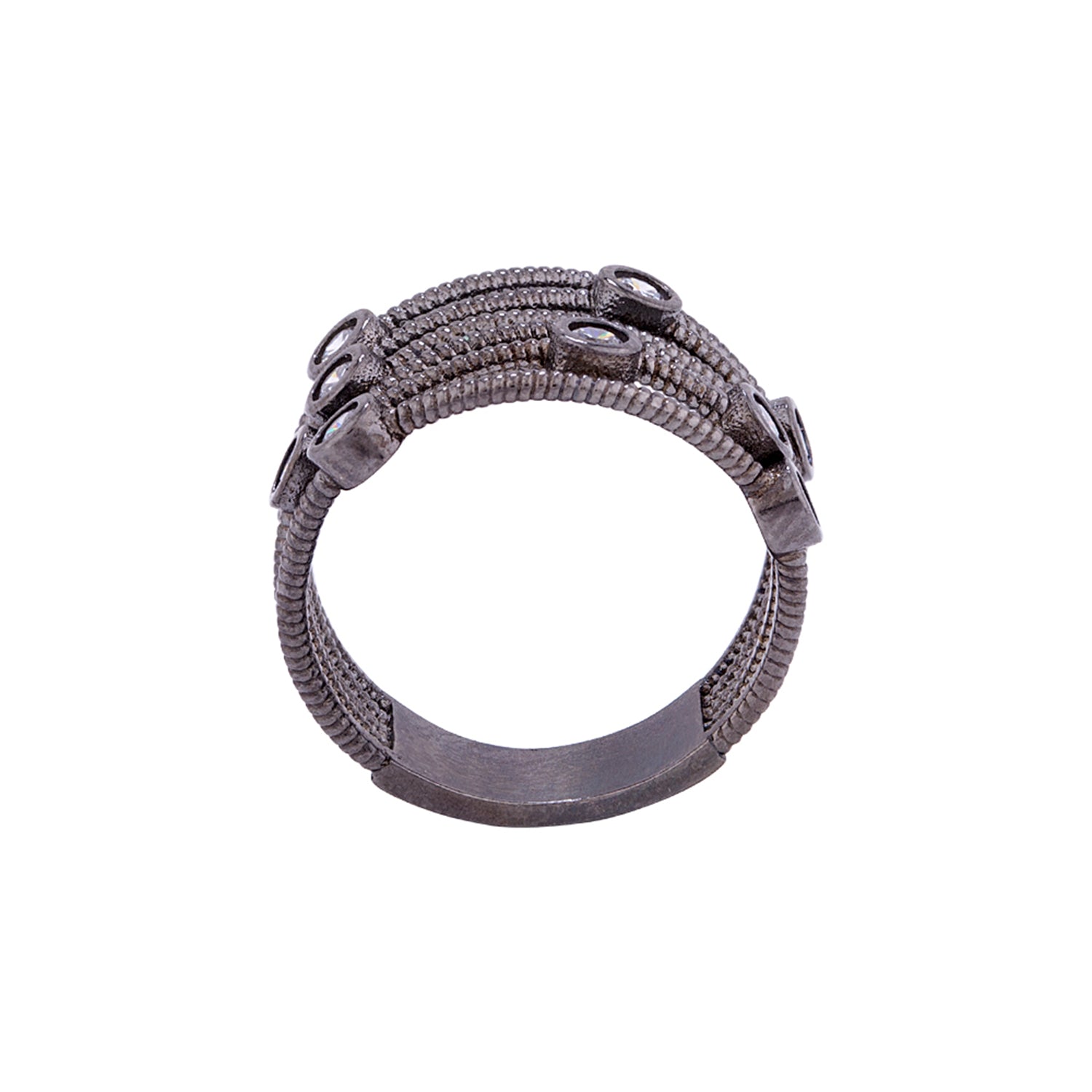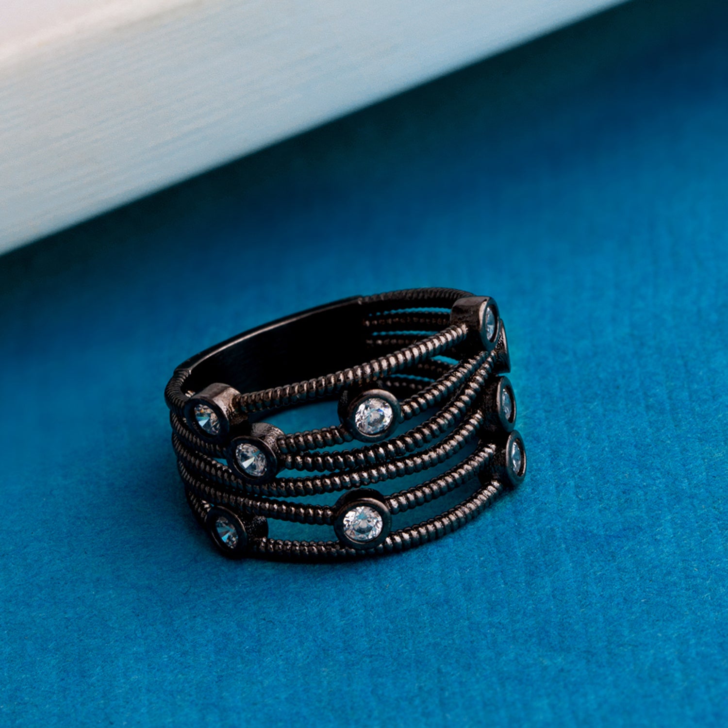 Cutwork design ring fashioned out of brass and black rhodium plated. Lightly embellished and good for formal and party looks. This piece of jewelry comes with the Voylla assurance of quality and durability.