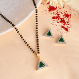 A complete jewellery box set that inclusive of pendant threaded in a thin rope chain, stud earrings and ring. Each piece has been fashioned out of brass and adorned with green triangle cut zirconia gemstones in a cluster setting. White rhodium plating adds to the charm of this versatile set.