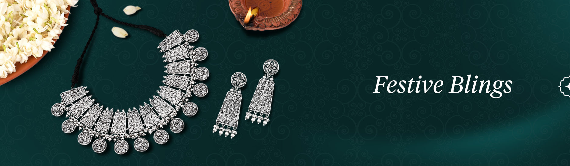 Inspired by beautiful banjara designs and the elements of Navratri, this antique design jewellery set has been fashioned out of brass. The necklace and drop earrings have been given an oxidized silver plating. Lightweight, comfortable and versatile.Caring for your fashion...