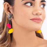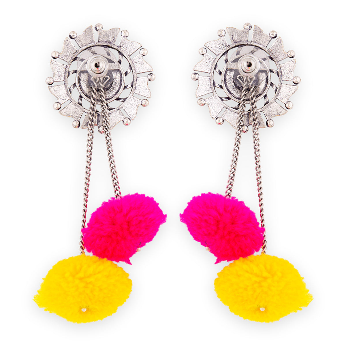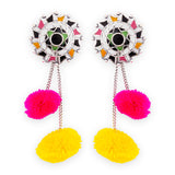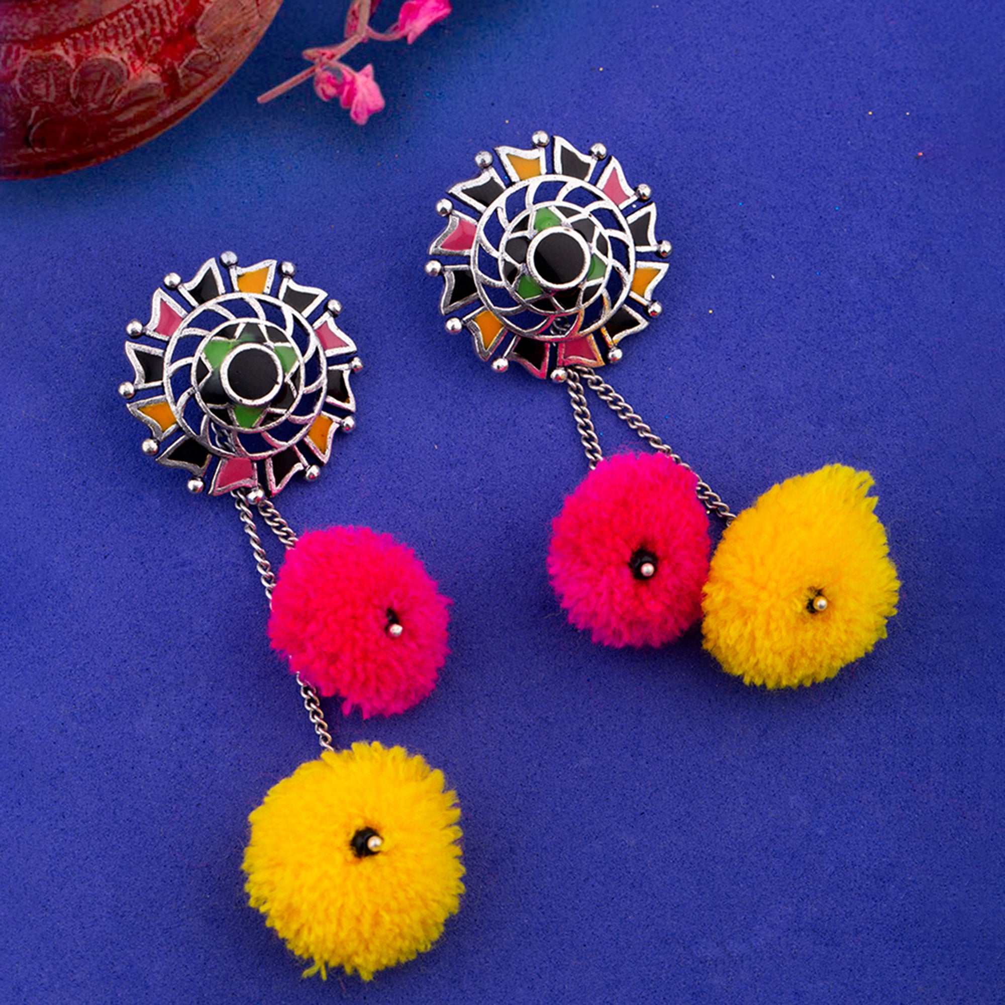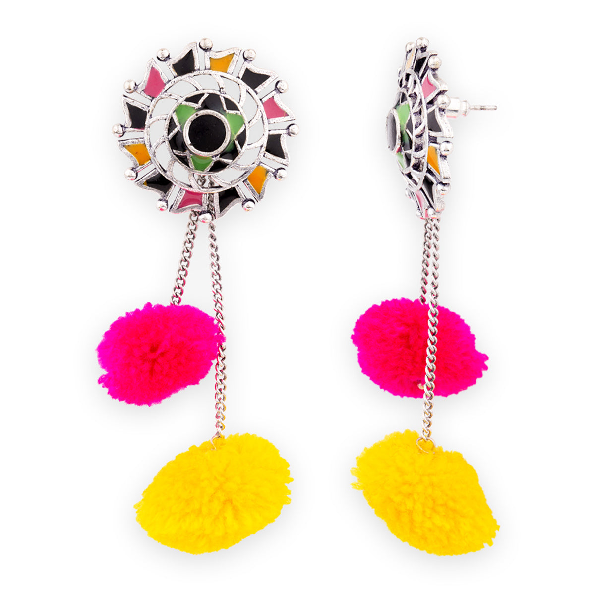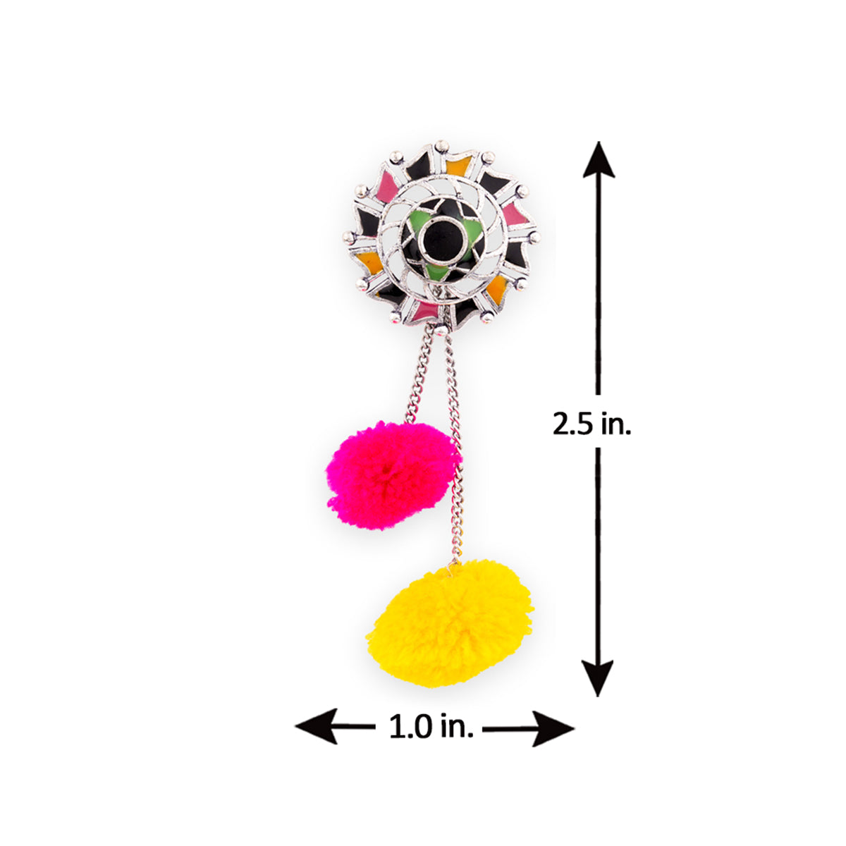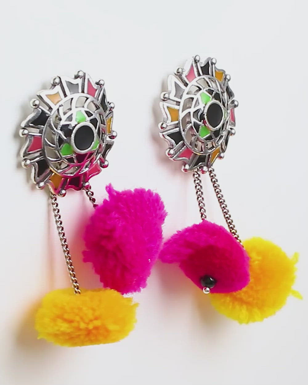 Super sassy and fun, these Kalbelia inspired pom pom earrings will brighten any day with a splash of colors and style. Made from brass and oxidized silver-plated, these enameled danglers are a good match for ethnic and Indo-Western looks.