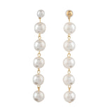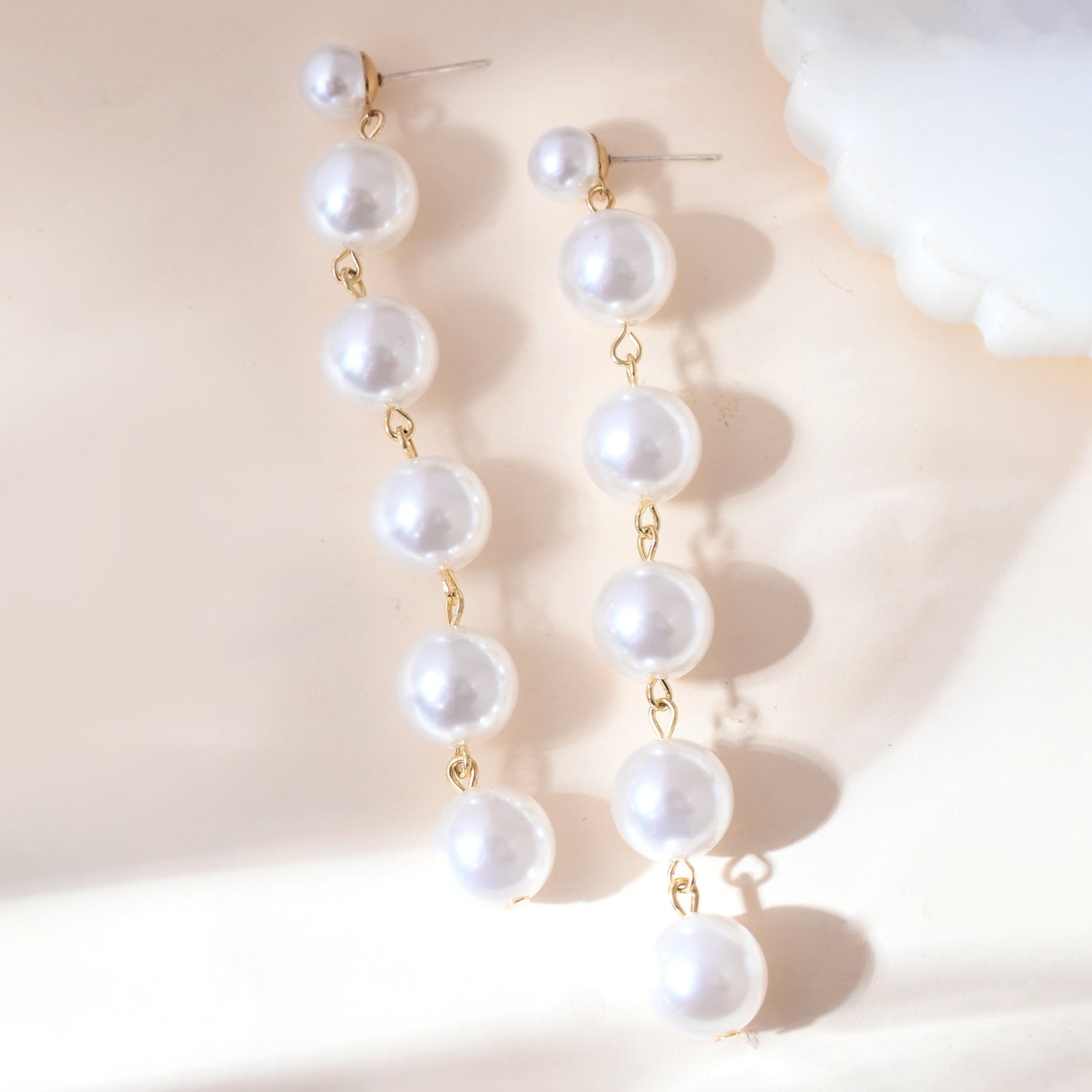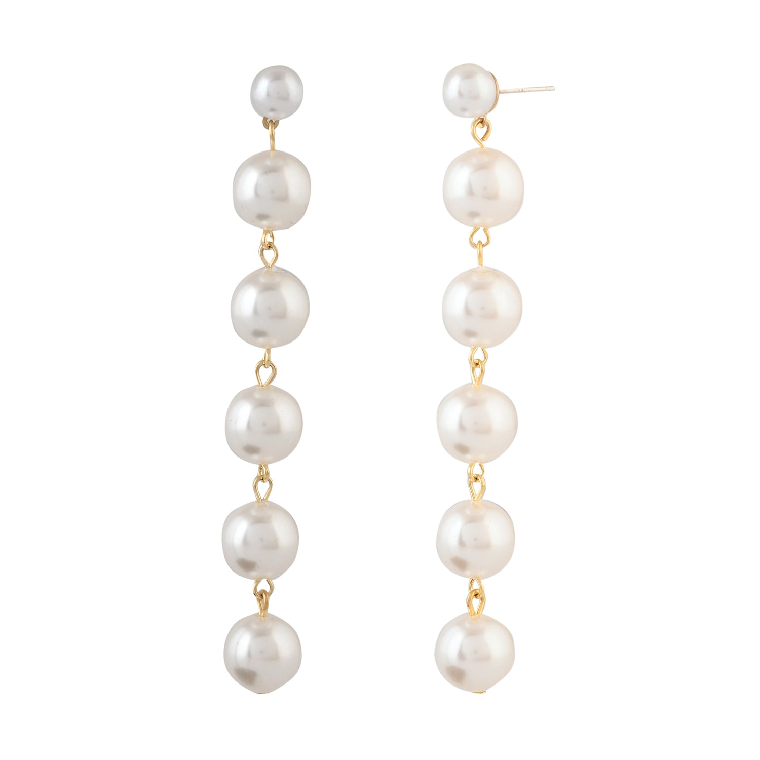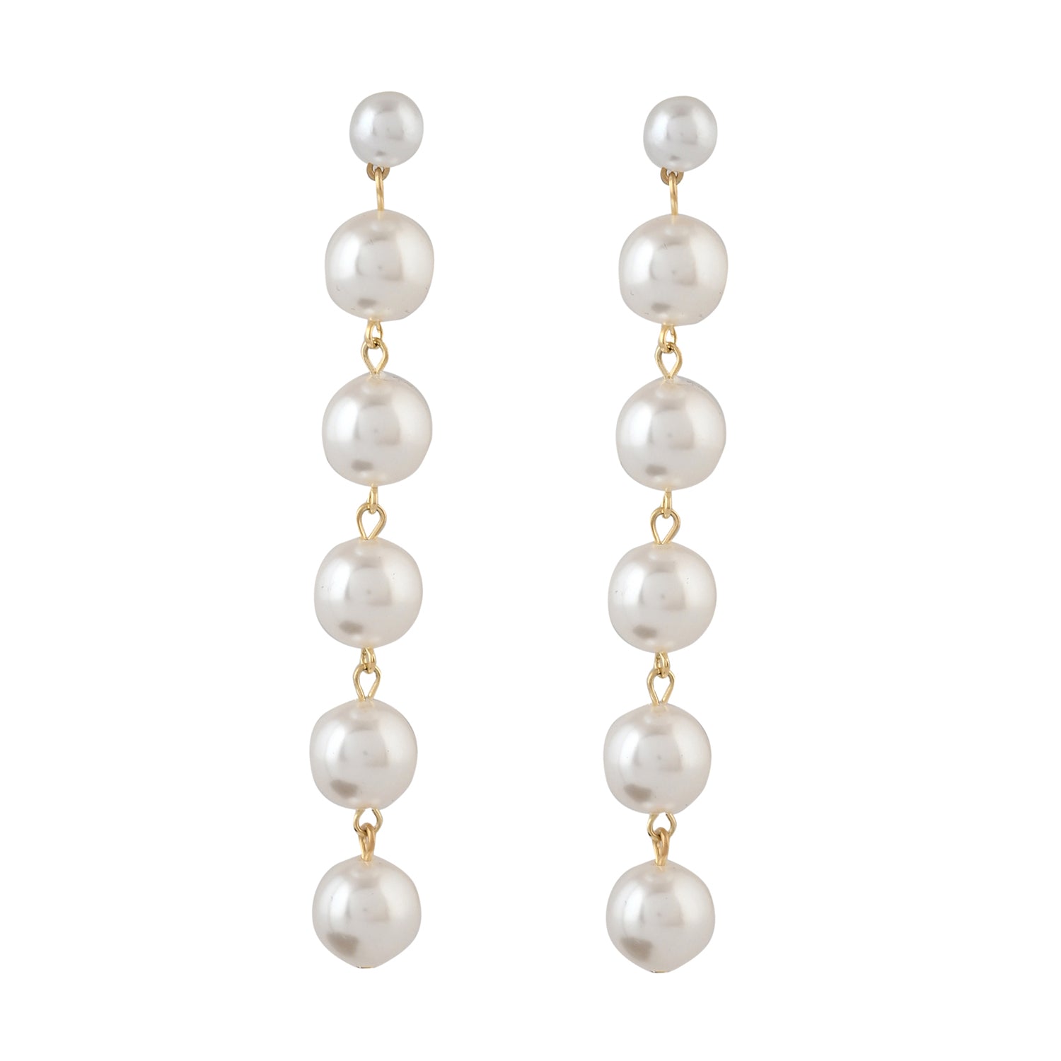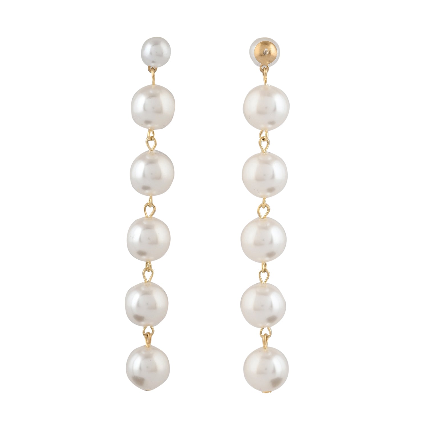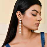 These stunning Voylla earrings feature a sophisticated design that combines timeless elegance with modern flair. Crafted from high-quality alloy and plated with luxurious yellow gold, these long dangler earrings are adorned with lustrous faux pearls. Each earring showcases a series of graduated faux pearls, linked together to create a graceful cascading effect. Perfect for any occasion, these earrings are versatile enough to be worn as party wear, work wear, everyday wear, or even while traveling. They make an ideal gift for women, suitable for holidays like Holi, Diwali, Rakshabandhan, Christmas, and New Year, as well as special occasions such as Valentine's Day. Whether gifting to a to sister, lover, girlfriend, wife, or friend, these earrings are sure to impress and delight.