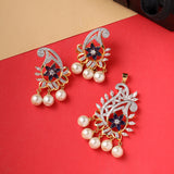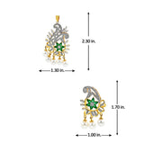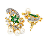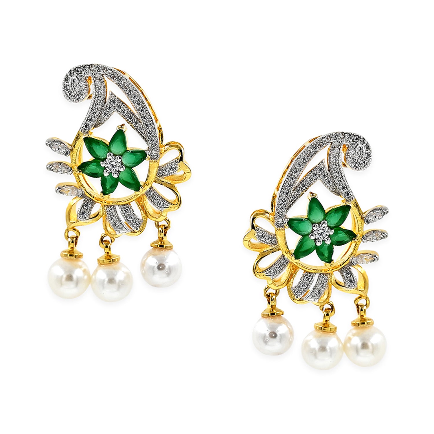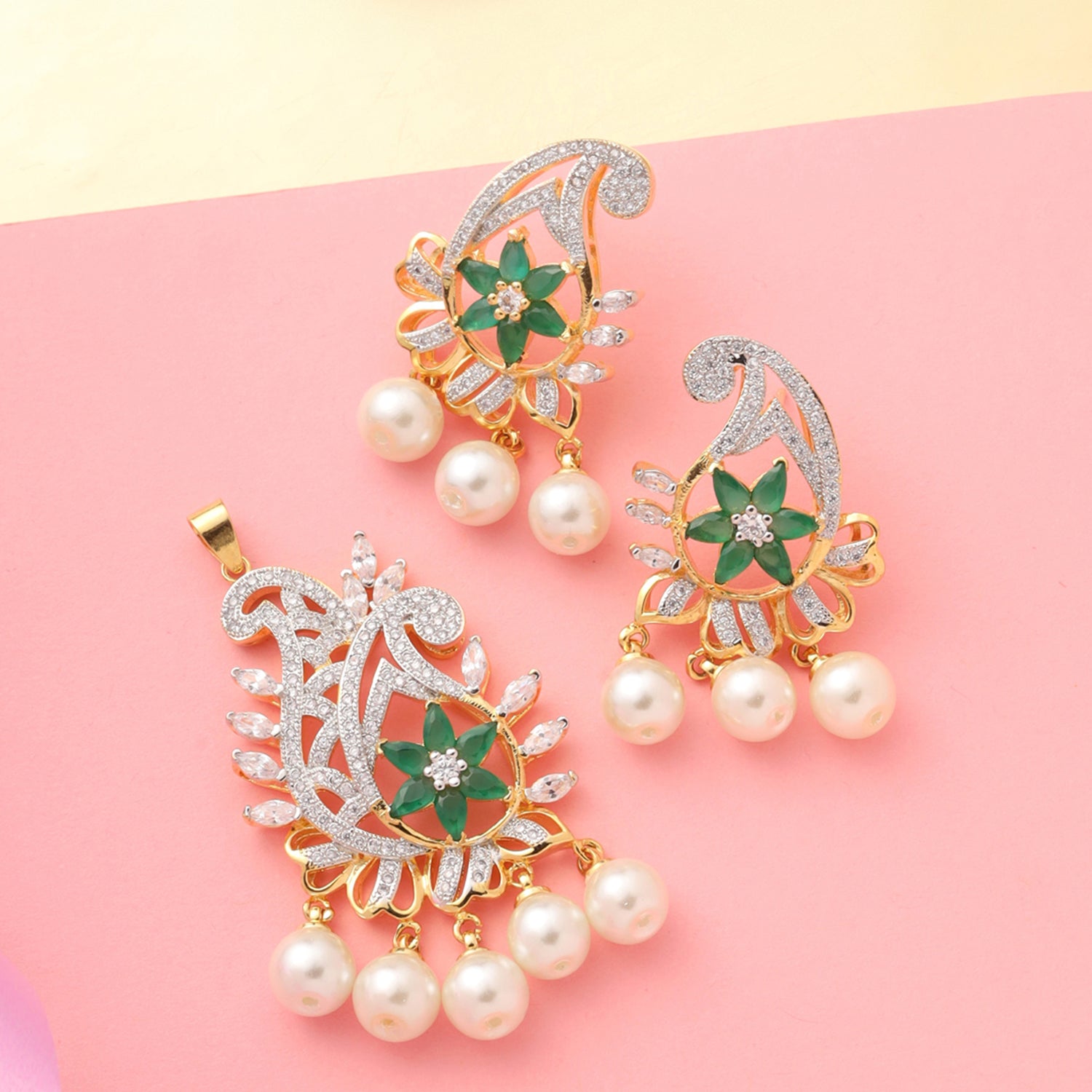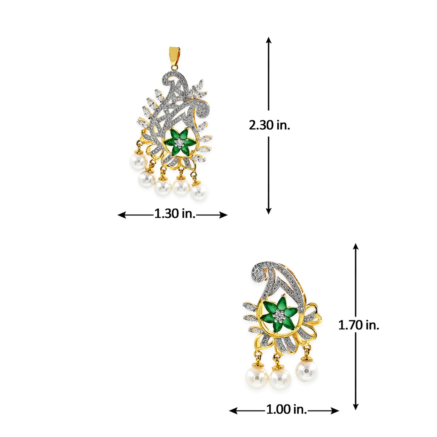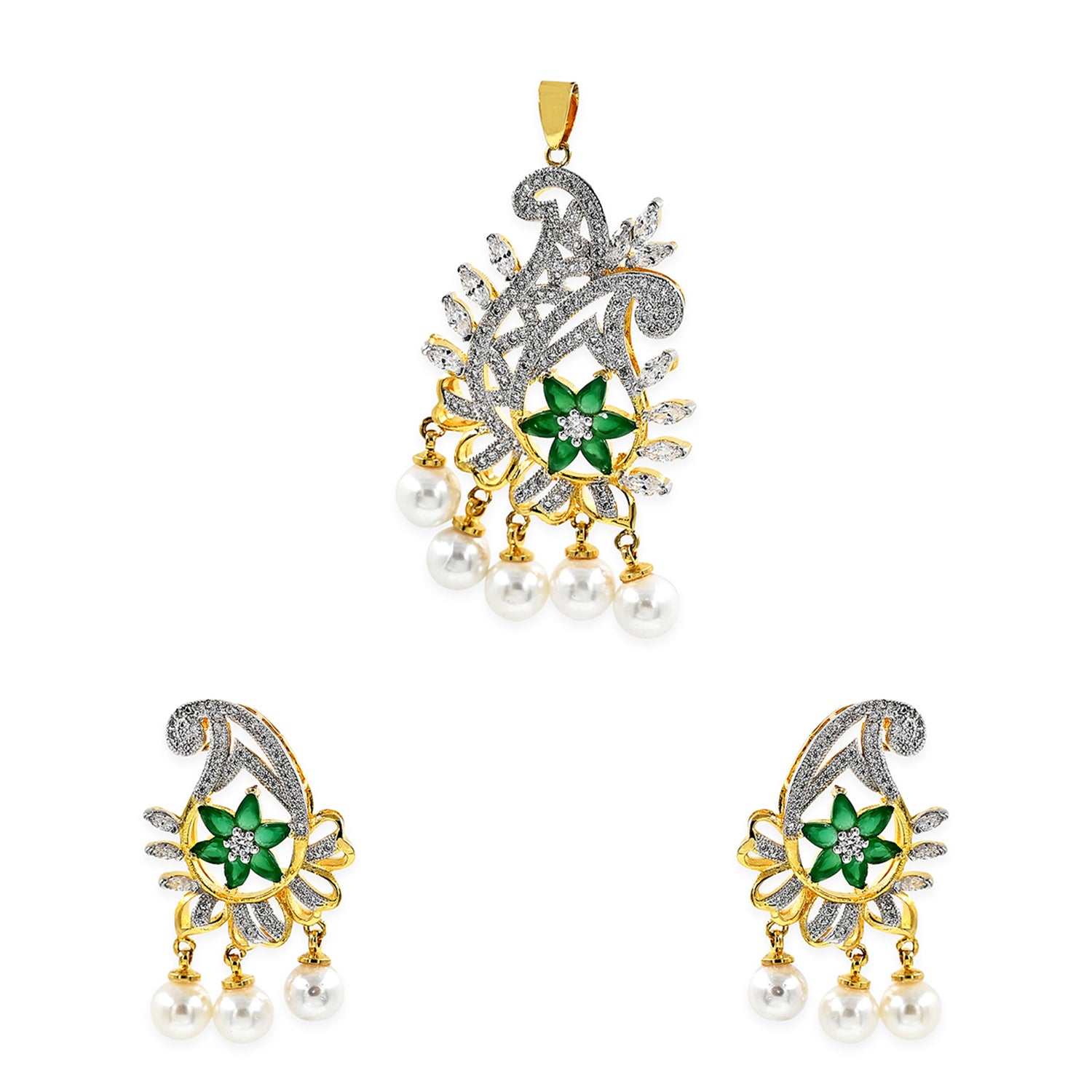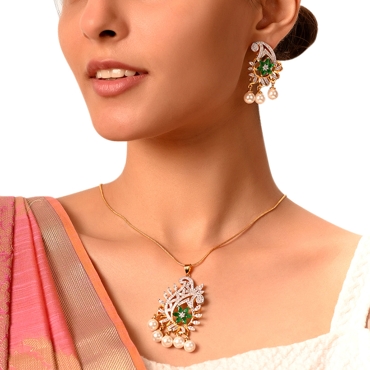 This is a stunning serene pendant and earring set made using high-quality brass. The gold plating blends in well with the green American Diamond along with pearls and offers a vibrant and youthful appeal to your attire. If you want to look younger and flaunt your fashion sense, finding a classier piece can be very difficult.