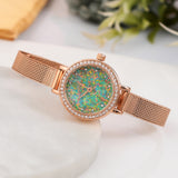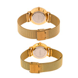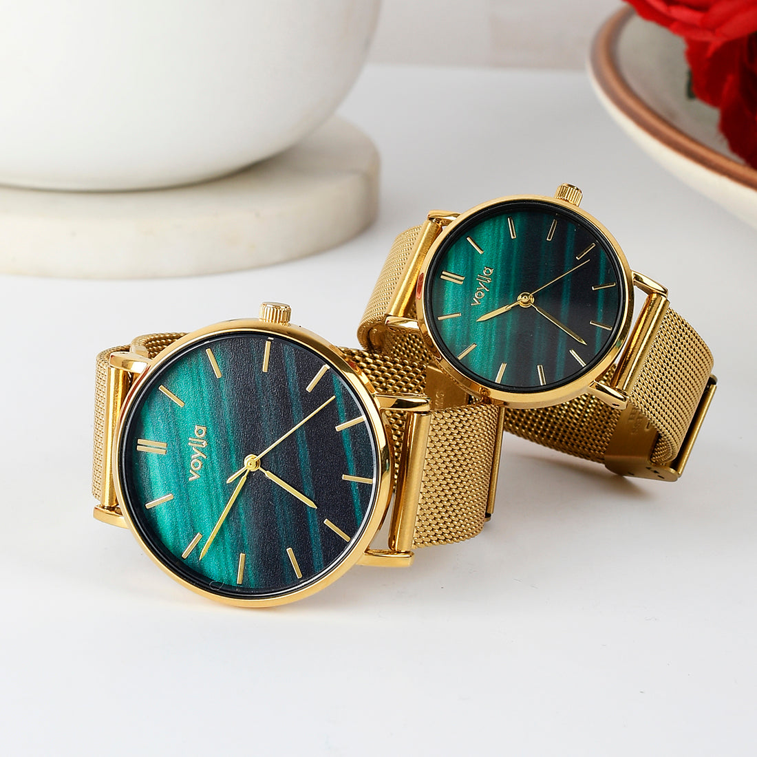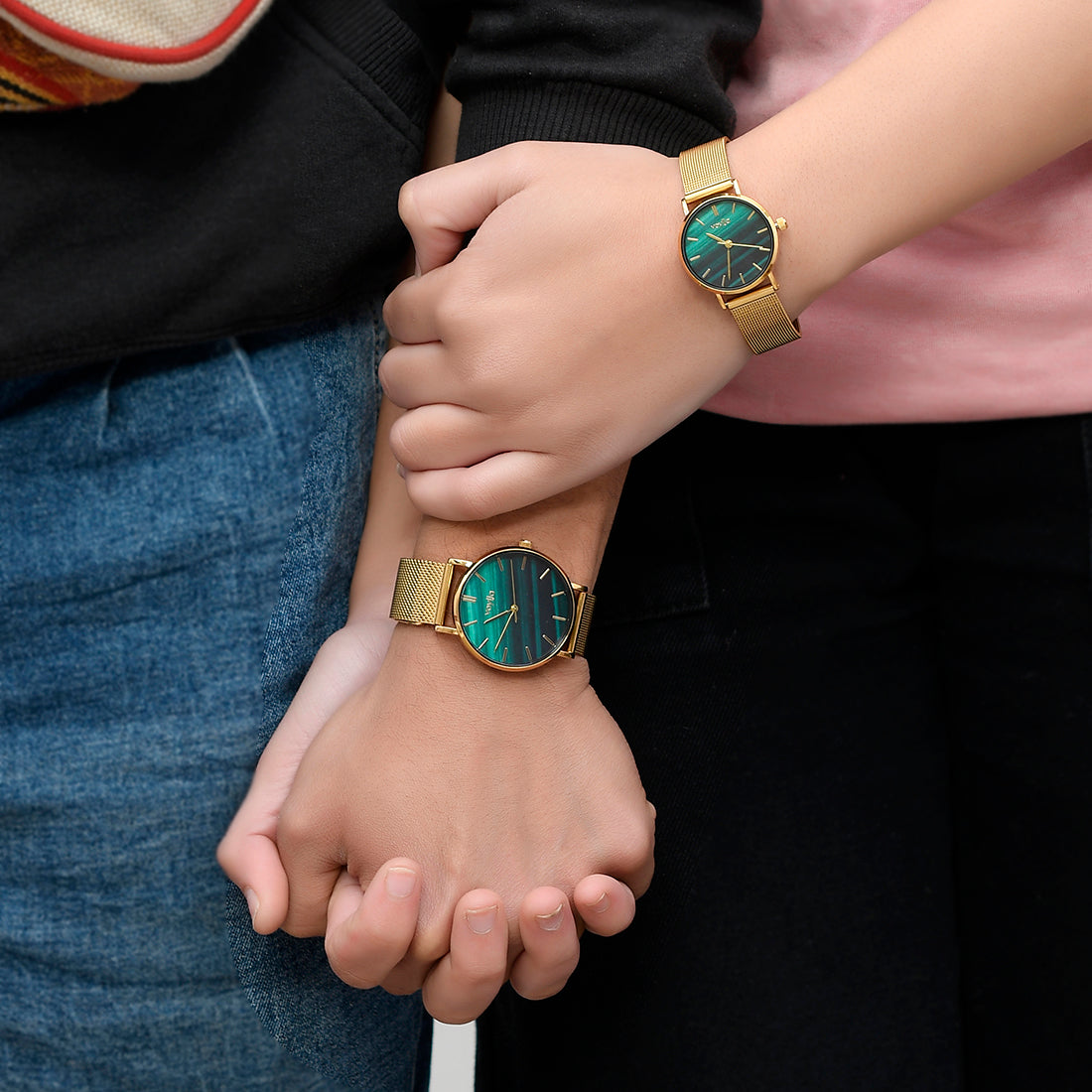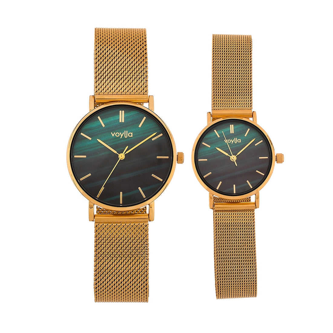 Classic mesh design chain strap watches for couples, featuring lovely green dials. Made from brass and yellow gold plated, the watches are versatile enough to be paired with just about everything.