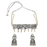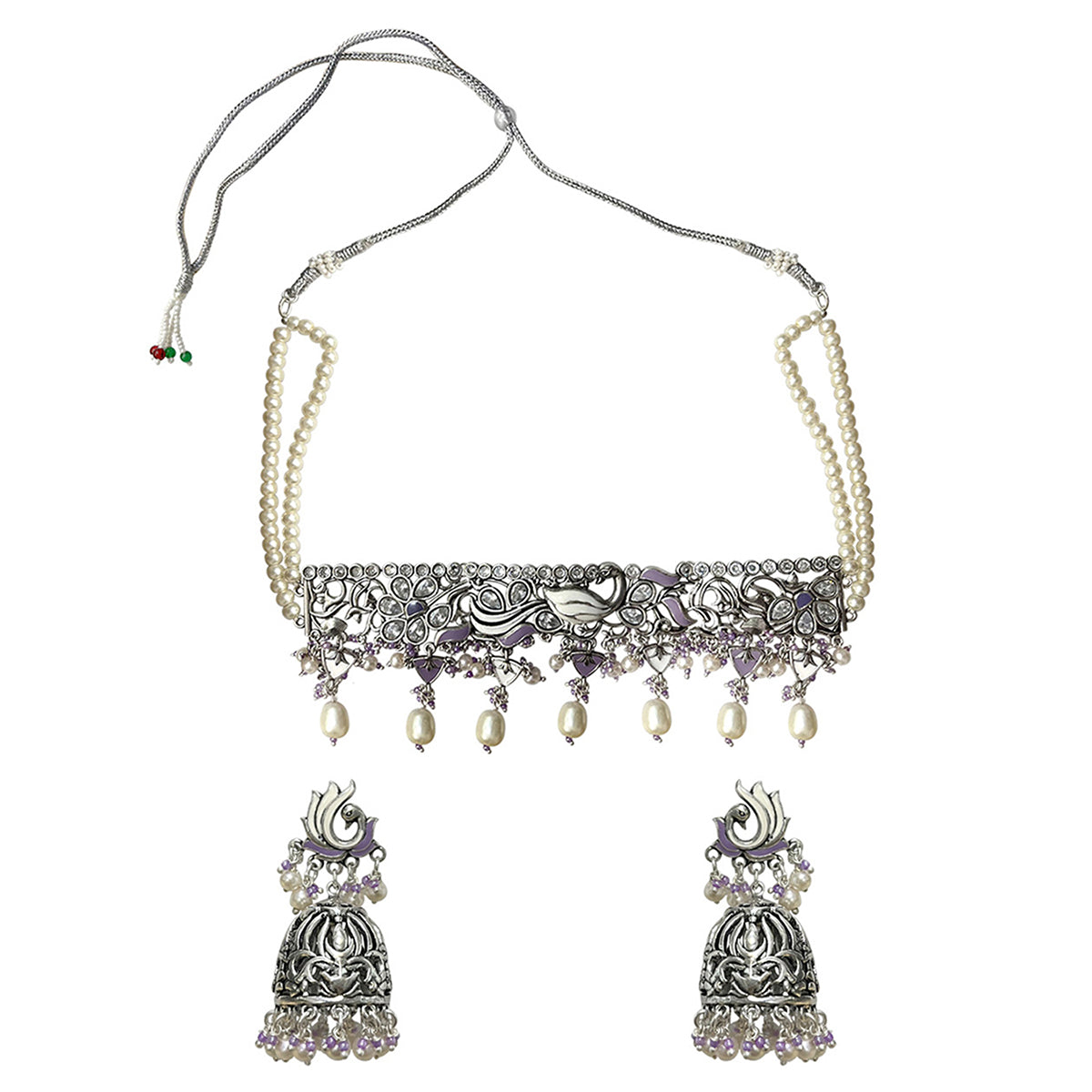 Crafted from brass into a delicate filigree design and featuring alluring peacock motifs, this jewellery set has been given a lovely oxidised plating for a silver finish. Faux pearls have been used to embellish the choker necklace and matching drop earrings. Wear the set with a casual saree or Bohemian outfit.