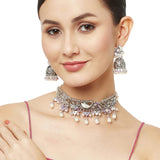 VOYLLA Filigree Silver Toned Round Faux Pearls Jewellery Set