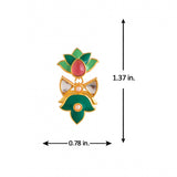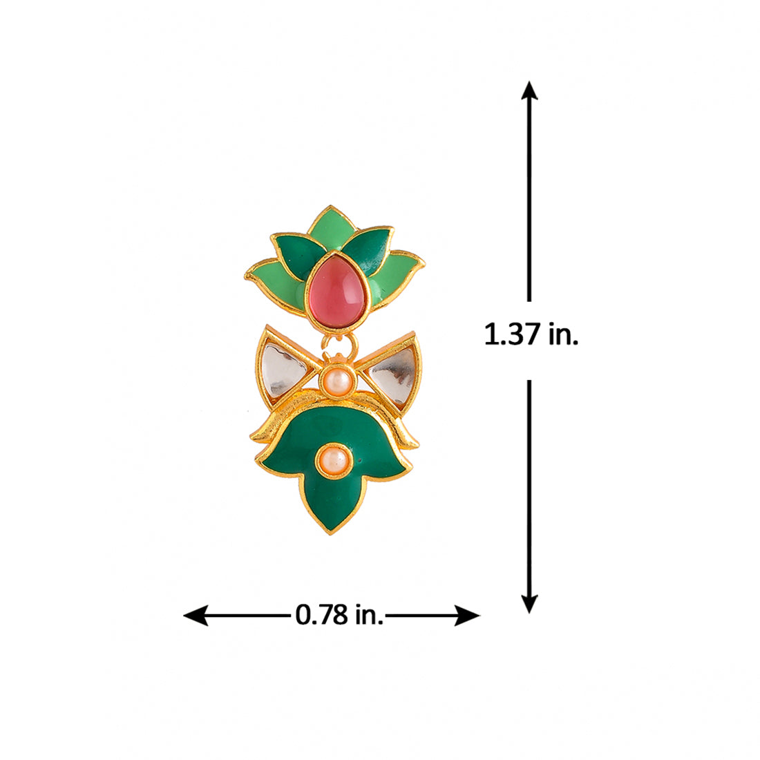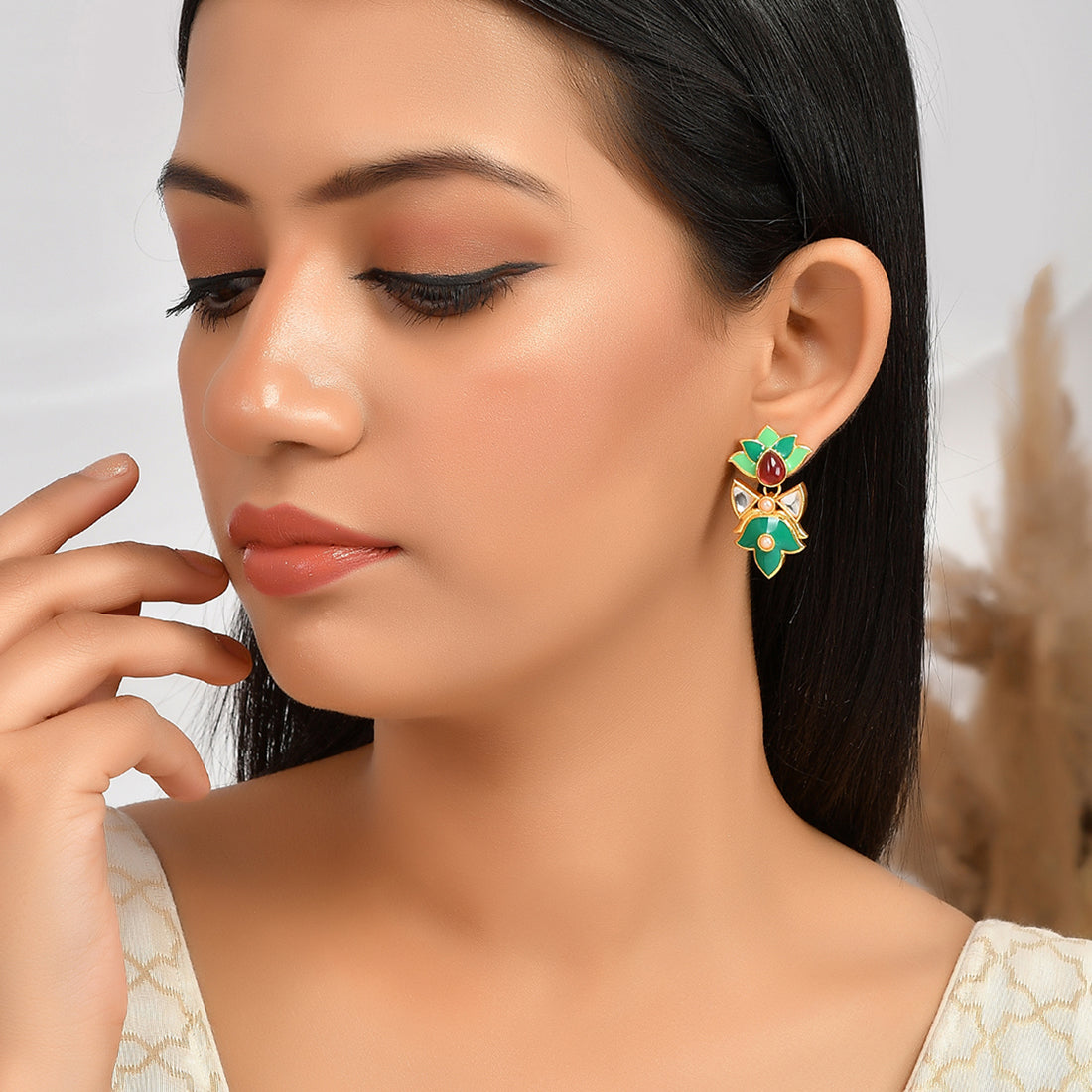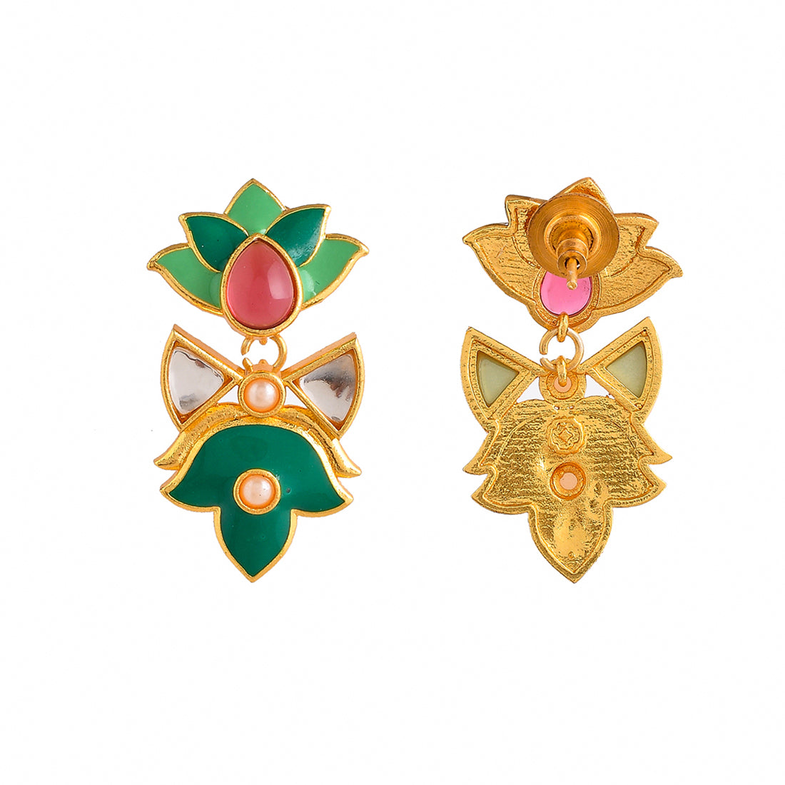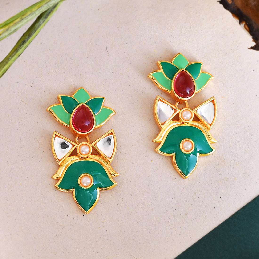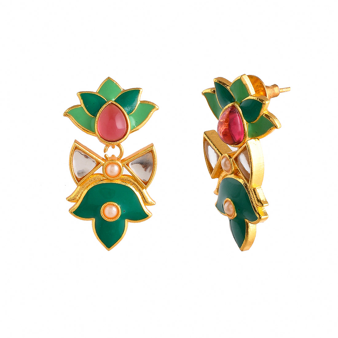 Green enamel and pink stone floral earrings with yellow gold plating. Made from brass. Lightweight, comfortable and versatile.