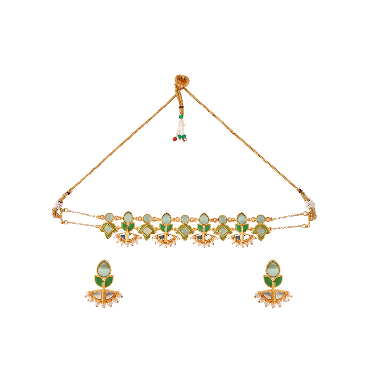 Embrace the regal charm of this Choker Necklace Set, adorned with stunning gold plating. The intricate design of the necklace and matching earrings exudes elegance and grace. Crafted with meticulous attention to detail, this set effortlessly enhances your neckline, adding a touch of sophistication to any ensemble. Let this choker necklace set become a statement piece that reflects your exquisite style and captures attention wherever you go.