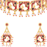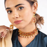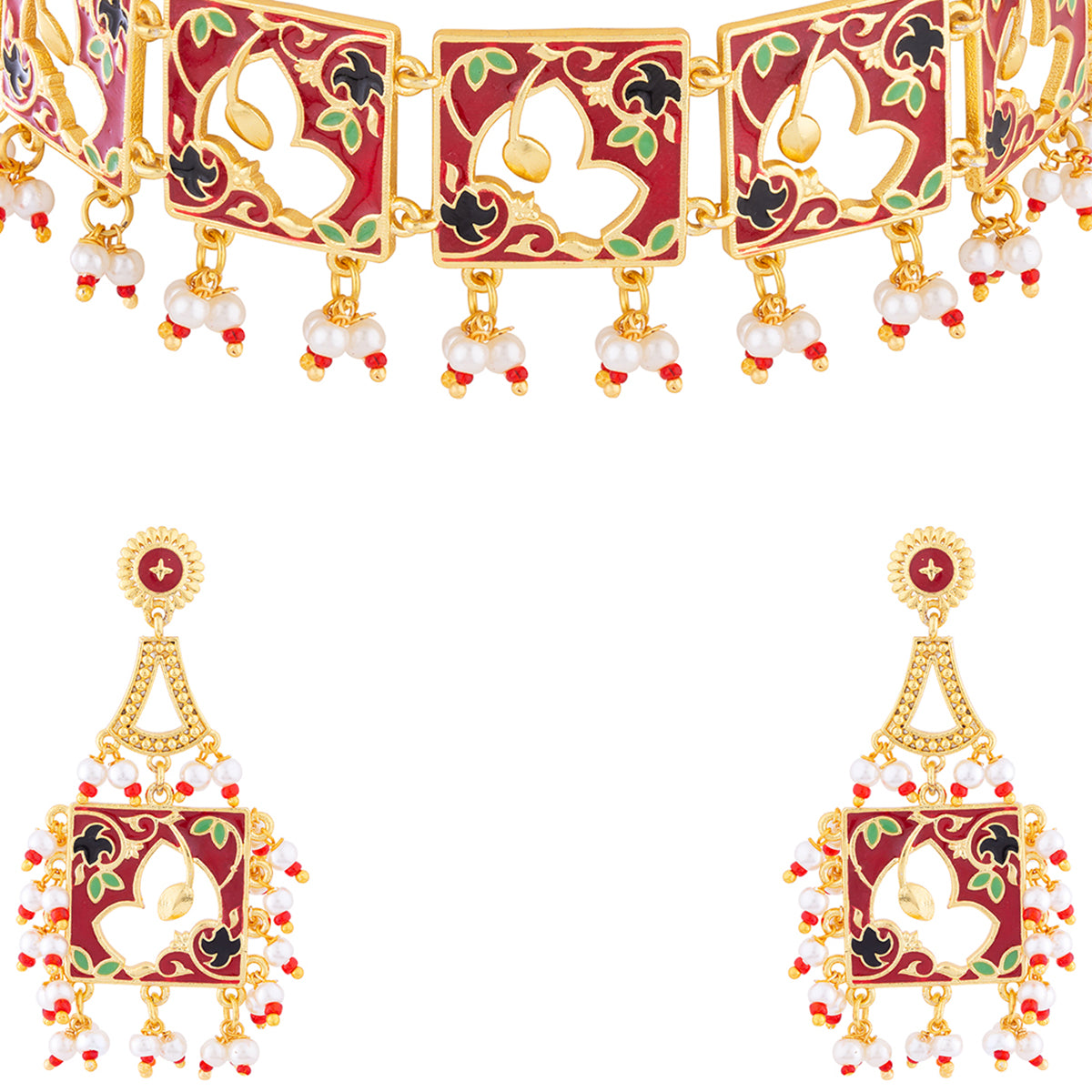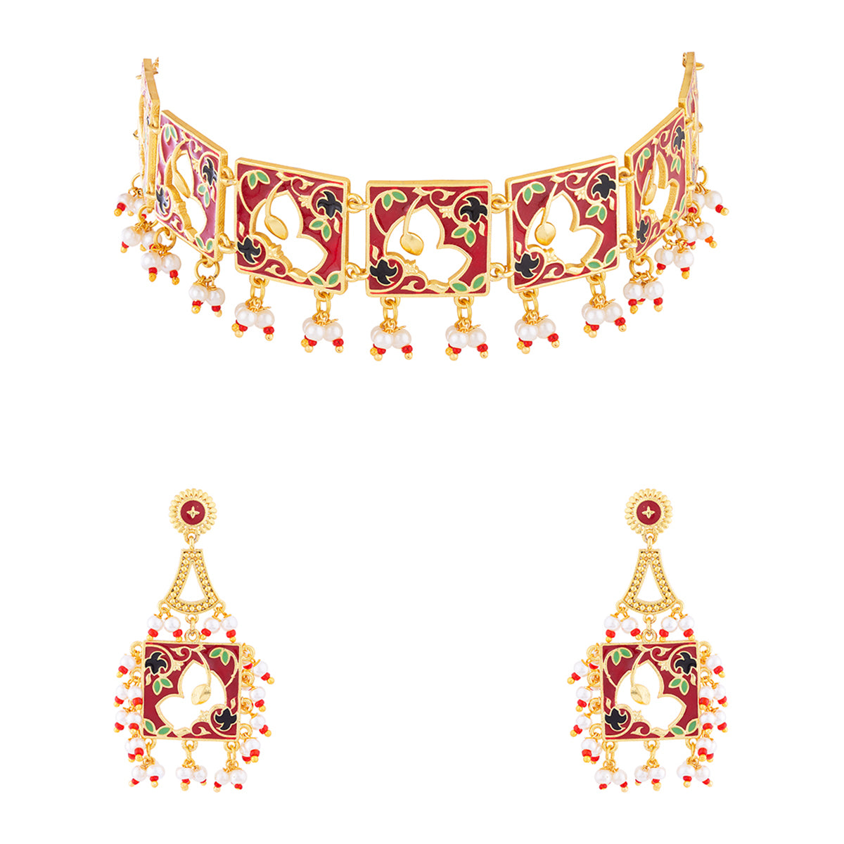 Choker necklace set featuring a classic cutwork design, inspired by Rajasthan's traditional artform of Pichhwai. Made from brass and yellow gold plated, the choker and drop earrings have been embellished with faux pearls. A good match for formal Indian looks.