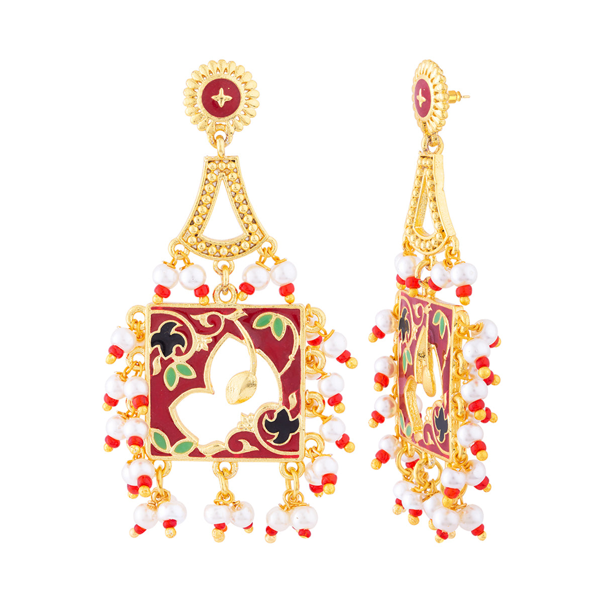 Green enamel and white pearls adorned tulips earrings with yellow gold plating. Made from brass and perfect for everyday as well as occasional wear.Caring for your fashion jewelry: We, at Voylla, take care of every piece of jewelry so that...