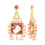 Traditional drop earrings, made from brass and featuring a lovely yellow gold plating. Embellished with faux white pearls, the layered pattern earrings are lightweight and comfortable yet exude an opulent charm. Wear the earrings with your favourite silk saree or...