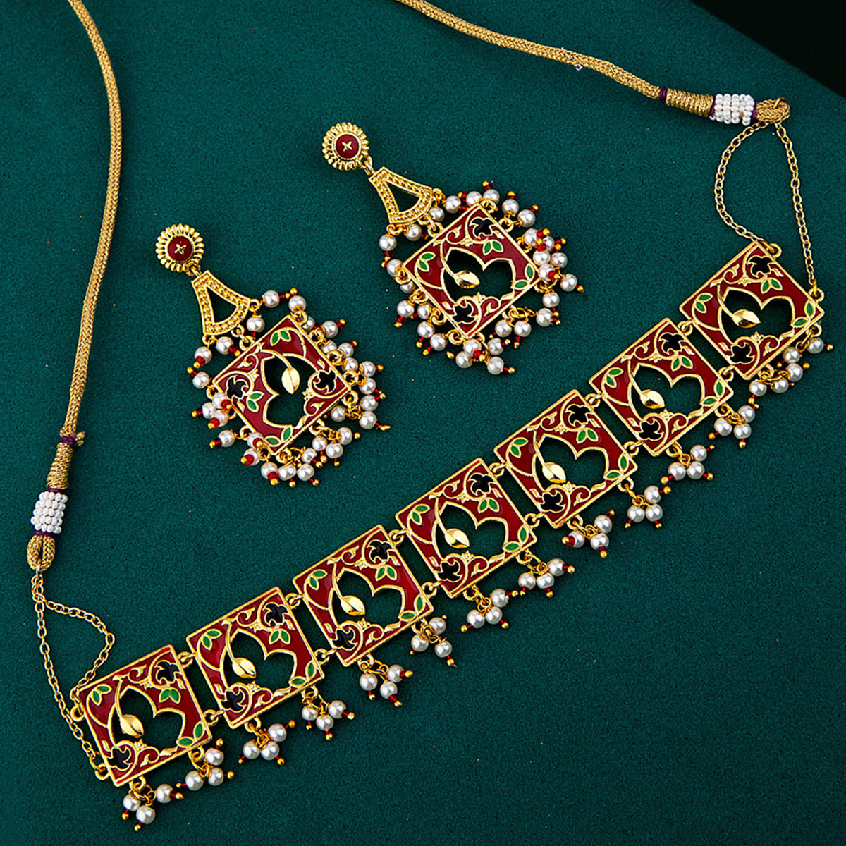 Green enamel jewellery set, made from brass and yellow gold plated. Adorned with pink stones and white pearls. Pair with ethnic attire.Caring for your fashion jewelry: We, at Voylla, take care of every piece of jewelry so that you don't...