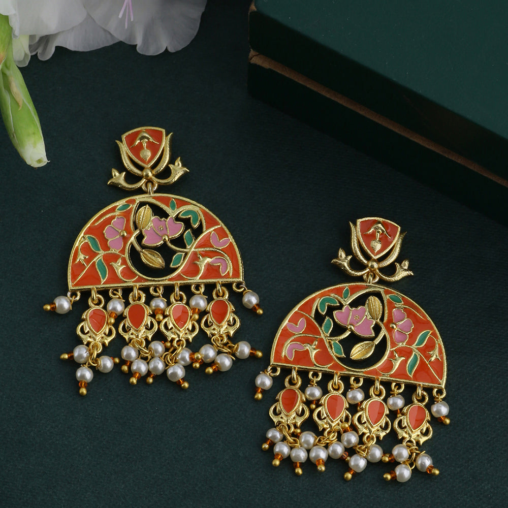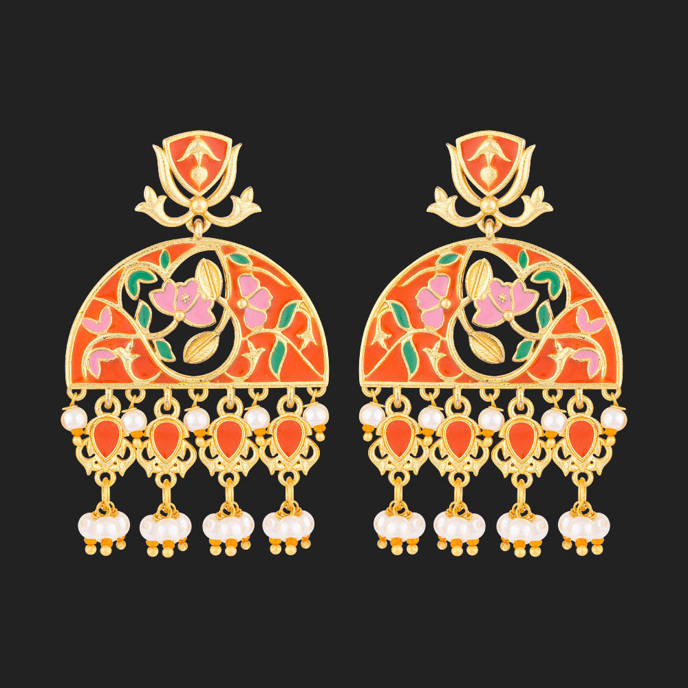 Add a touch of fun to your attire with the Tahira Festive Red Mini Danglers. Hand enamelled and pear cluster detailing on glossy gold surface. This piece of jewelry comes with the Voylla assurance of quality and durability. Caring for your fashion jewelry: We, at Voylla, take care of every piece of jewelry so that you don't spend hours caring for them.