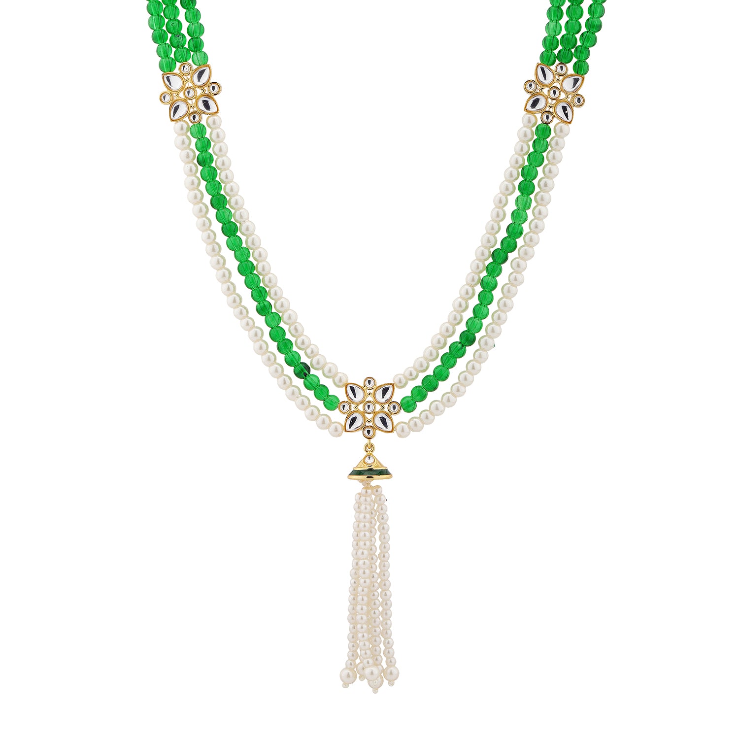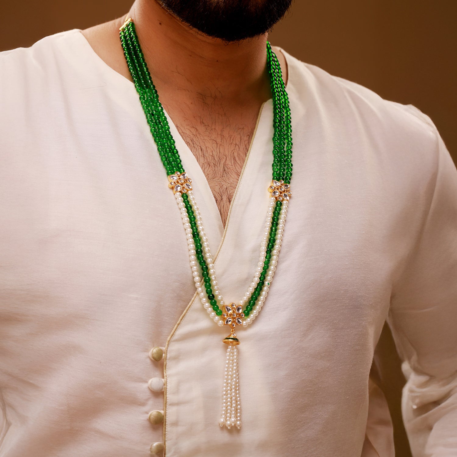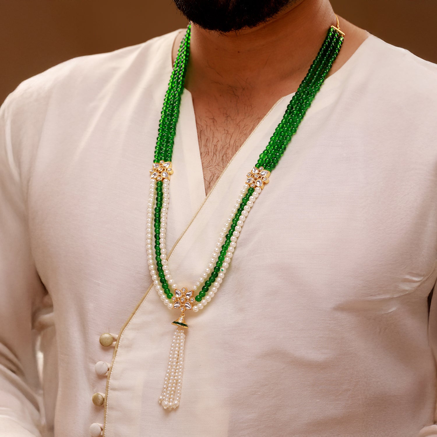 Inspired by the quiet grandeur of moonlit royal durbars and sacred wedding rituals, the Kings of Rajasthan Chandravar Mala Necklace is a refined expression of tradition, elegance, and masculine grace. Part of the iconic Queens of Rajasthan collection, this necklace reflects the ceremonial malas once worn by Rajput kings as symbols of dignity, prosperity, and lineage. Designed for the modern groom, it blends heritage artistry with a silhouette that feels effortless and timeless. Crafted in premium brass and finished with rich yellow gold plating, the Chandravar Mala features lustrous strands of pearls paired with regal detailing that highlights traditional Rajputi craftsmanship. The soft glow of pearls evokes purity and auspicious beginnings, making this moti mala a meaningful addition to wedding attire. Lightweight and thoughtfully constructed, it is comfortable enough to wear through long ceremonies, rituals, and celebrations. Whether styled with an embroidered sherwani, a classic achkan, or a minimal bandhagala, this necklace for men elevates the groom’s look with understated royal charm. Beyond weddings, it serves as a timeless keepsake, perfect as a gift for groom, an elegant mens gift, or a cherished heirloom piece that carries forward the story of royal Rajasthan.