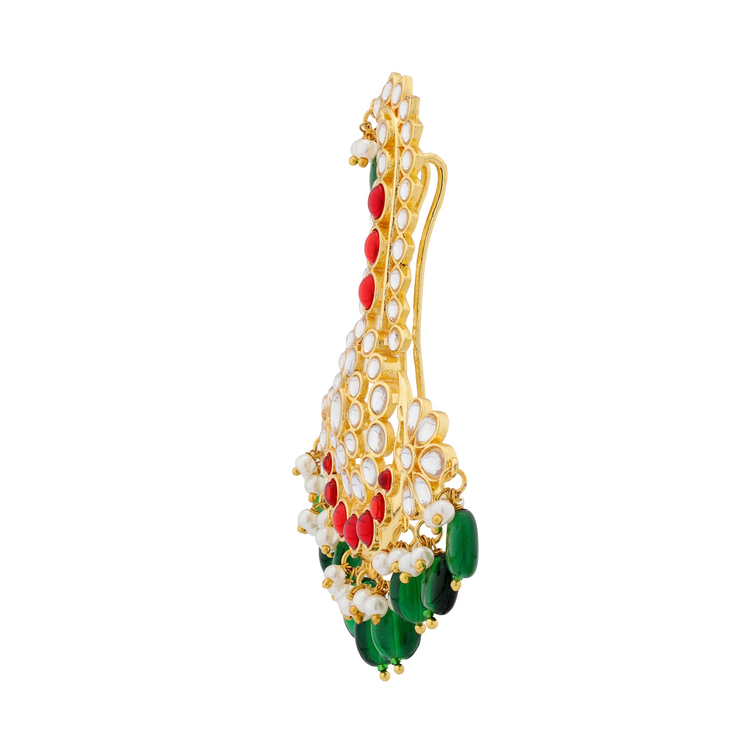 The Kings of Rajasthan Suryaansh Kalangi is a majestic head ornament inspired by the ceremonial kalangis worn by Rajput kings during grand court rituals and royal weddings. Designed for the modern groom who values tradition, this piece embodies power, pride, and timeless elegance. Crafted in premium brass and finished with rich yellow gold plating, the Suryaansh Kalangi features a graceful peacock-inspired silhouette adorned with luminous kundan-style stones, vibrant red accents, and elegant green bead drops with delicate pearl detailing. Every curve reflects heritage artistry, making it a standout kalangi for pagdi groom and a symbol of royal legacy. Part of the celebrated Queens of Rajasthan collection, this kalangi is created for grooms who want their wedding jewellery to feel meaningful, rooted in culture yet effortless to wear. Whether paired with a traditional pagdi or styled for ceremonial occasions, the Suryaansh Kalangi adds unmatched regal charm. It also makes a thoughtful gift for groom and a memorable heirloom-worthy mens gift.
