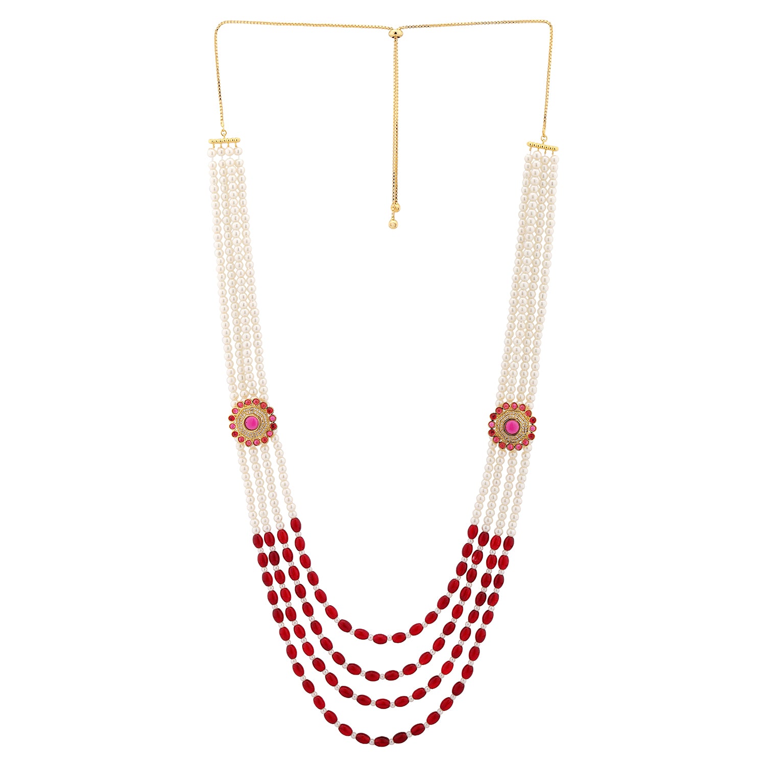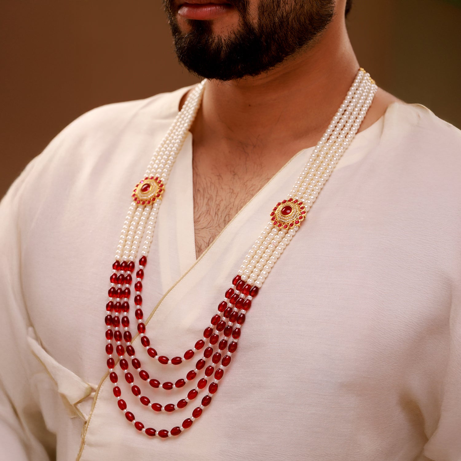 Rooted in the regal traditions of Rajasthan, the Kings of Rajasthan Rajaro Mala Necklace is a powerful expression of royal masculinity and ceremonial elegance. Part of the iconic Queens of Rajasthan collection, this necklace draws inspiration from the layered malas worn by Rajput kings during coronations, wedding processions, and sacred rituals. Designed for today’s groom, it blends heritage craftsmanship with a timeless silhouette that feels dignified, confident, and effortless to wear. Crafted in premium brass and finished with rich yellow gold plating, the Rajaro Mala features classic pearl strands paired with deep red beads that symbolize strength, prosperity, and auspicious beginnings. Ornamental gold-toned accents add a royal focal point, elevating this piece from a traditional mala to a statement wedding necklace for men. Lightweight yet substantial in presence, it is designed to sit comfortably through long ceremonies while commanding attention with its layered grandeur. Perfect for grooms who appreciate meaningful jewellery, this mala for wedding pairs beautifully with sherwanis, achkans, and bandhagalas. Whether worn for the wedding day or gifted as a keepsake, the Rajaro Mala stands as a reminder of royal lineage, celebration, and timeless style, making it an unforgettable gift for groom or heirloom-style mens jewellery piece.